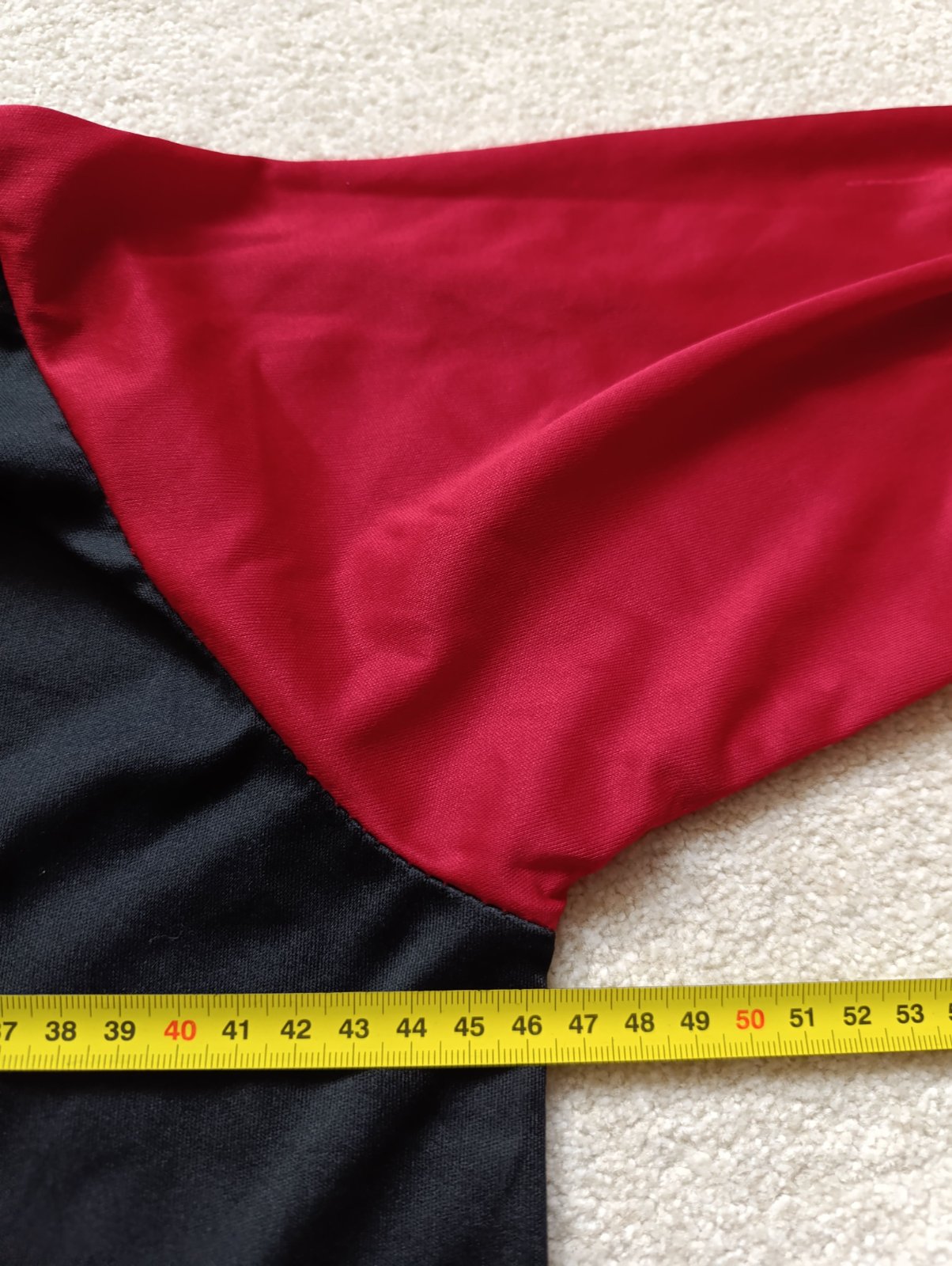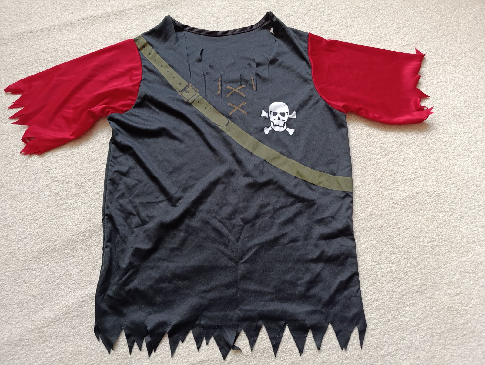 Dětský kostým vel. ca 10 až 13 let. Vel. uvedená dětská L, šířka průramky a délka uprostřed zad viz fotky, měřte! Vepředu je zatržená nitka viz detailní fotka a u krku asi centimetr rozpárnuto ve švu - jde v pohodě zašít, zohledněno v ceně. Jinak v pořádku, běžné známky použití..
