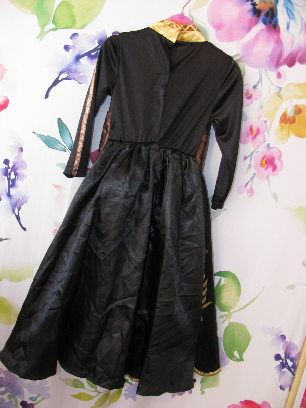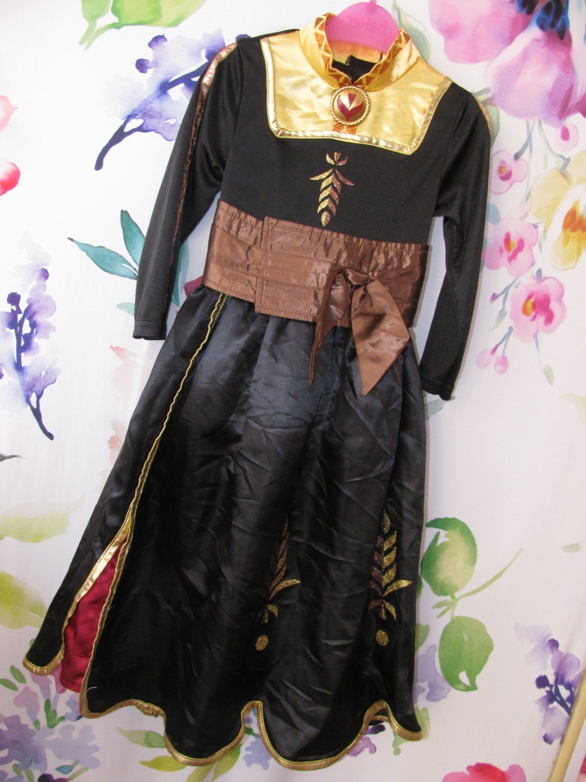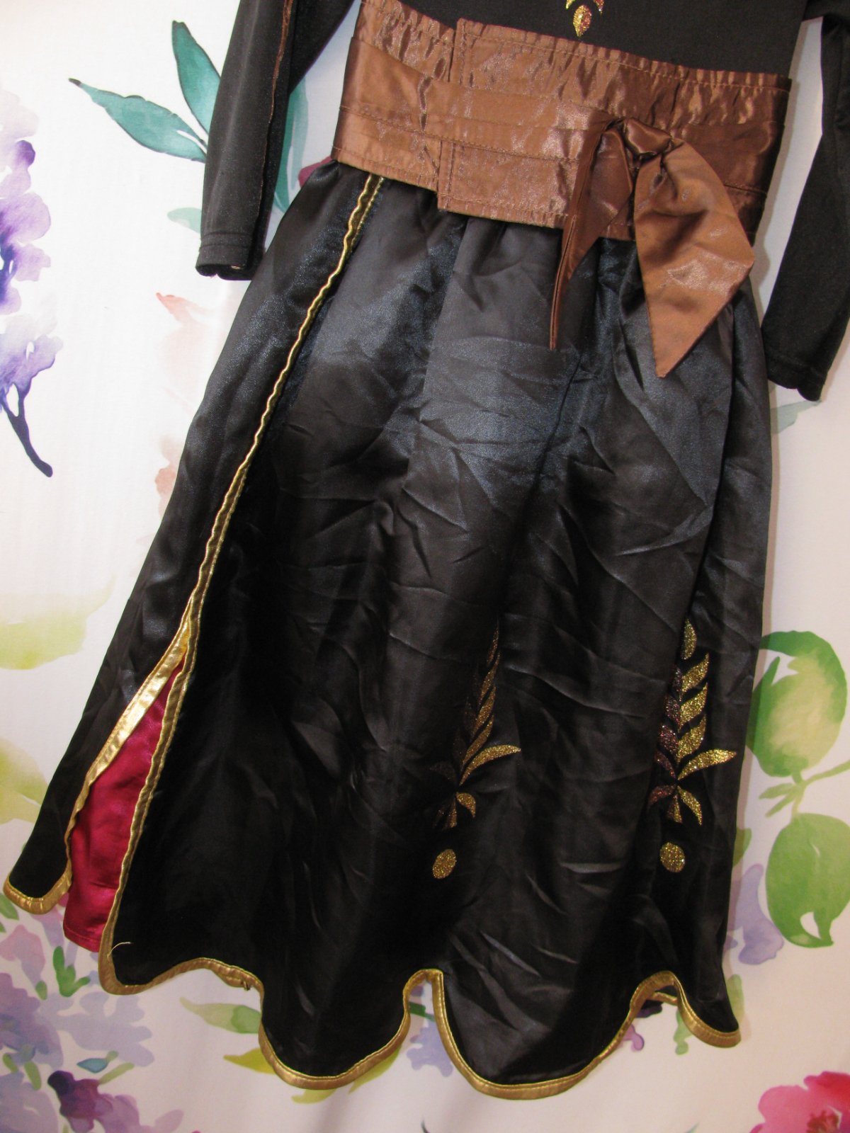 Krásné, saténové šaty pro princeznu Annu, zlaté ornamenty, elastické bolerko, v pase pružné do gumy, medailonek, za krkem zap. na suché zipy, 100% polyester.