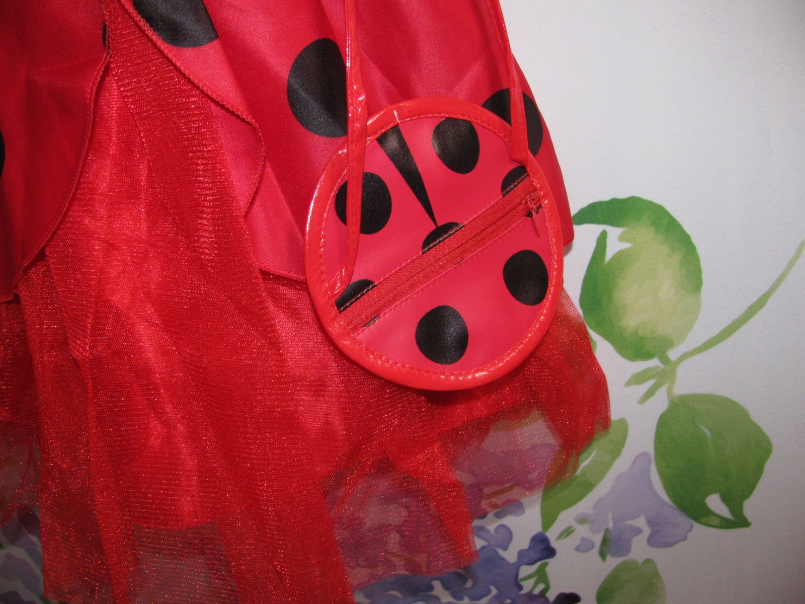 Nádherný kostým Berušky- šaty, škraboška, kabelka a náušnice. Náušnice jsou vloženy v kabelce, která je na zip. Krásné saténové šaty s vícevrstvou sukní, v pase pružné do gumy, 100% polyester, 100% bavlna.