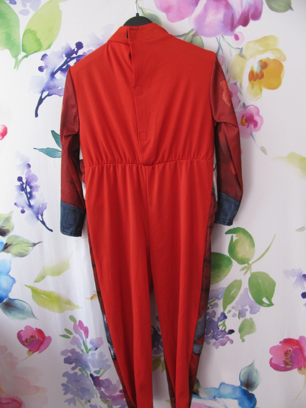 Hezký elastický overal, v pase do gumy, za krkem zap. na suché zipy, na hrudi plastová krabička , hruď vypolstrovaná, 100% polyester. Jediná vada-malá prasklina na krabičce, nafoceno, jinak bez vady, krásný stav.