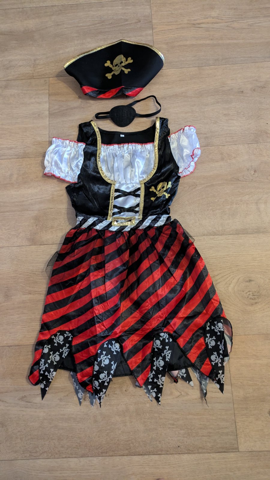 max délka šatů 77cm, pas je do gumy 2x 25 - 33 cm, součástí kostýmku jsou šaty, klapka na oko a pirátská čepice, kostýmek je jen rozbalený, bez vad.