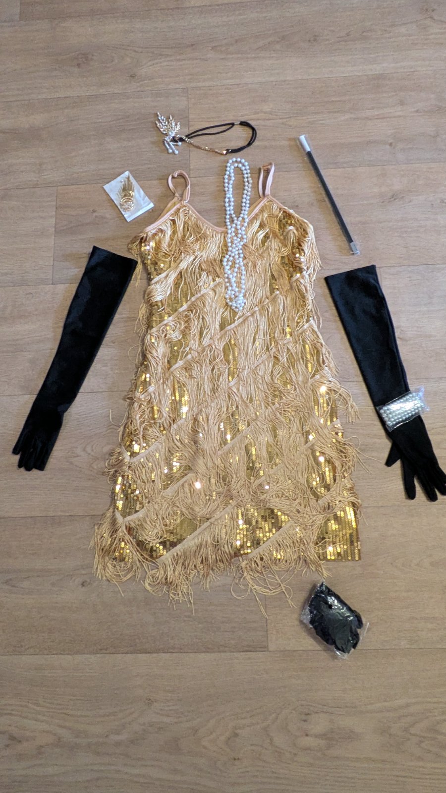 KA190 Zlaté, třásňové Vintage šaty 20 - tá léta + doplňky vel. M, 38