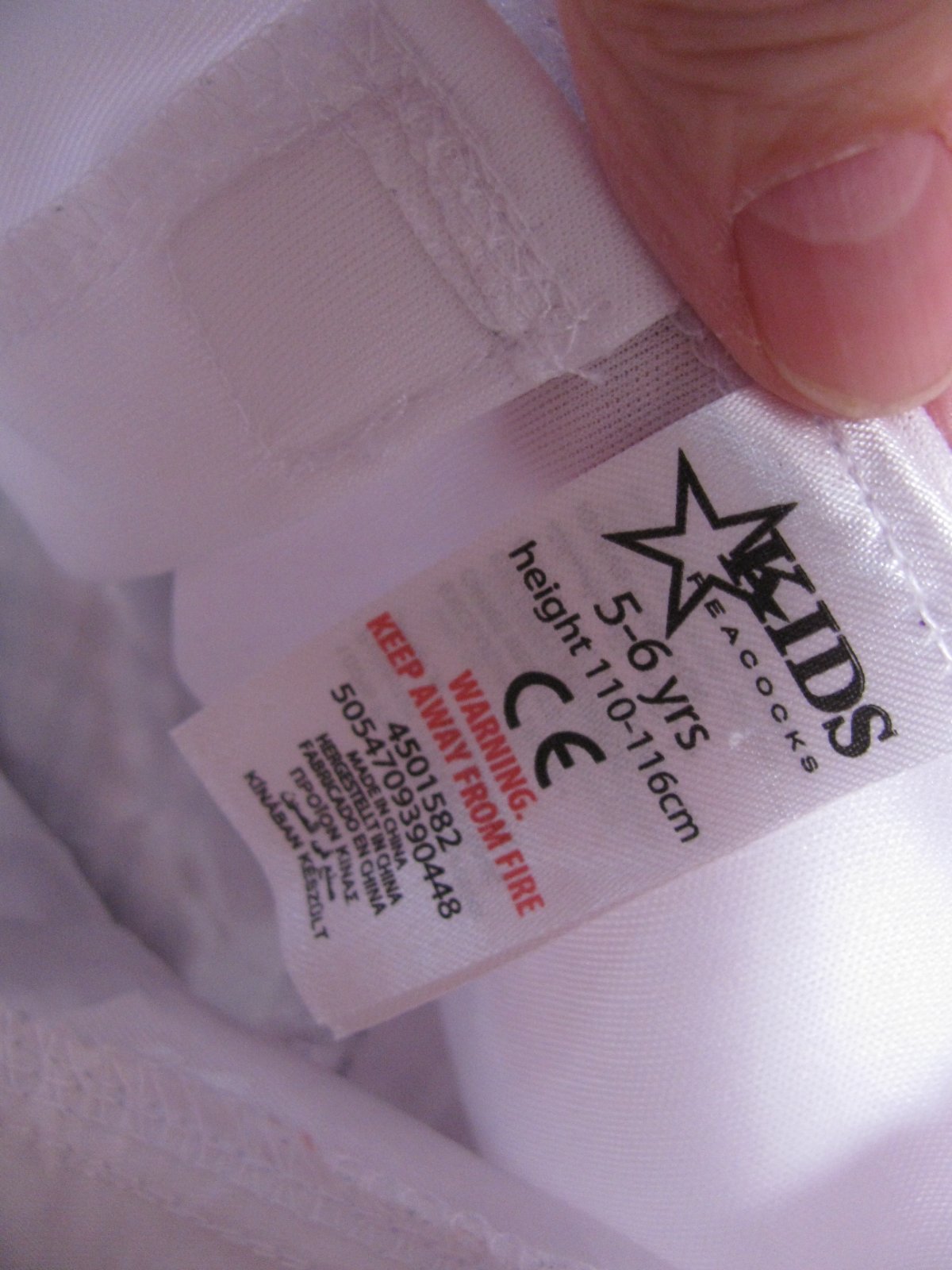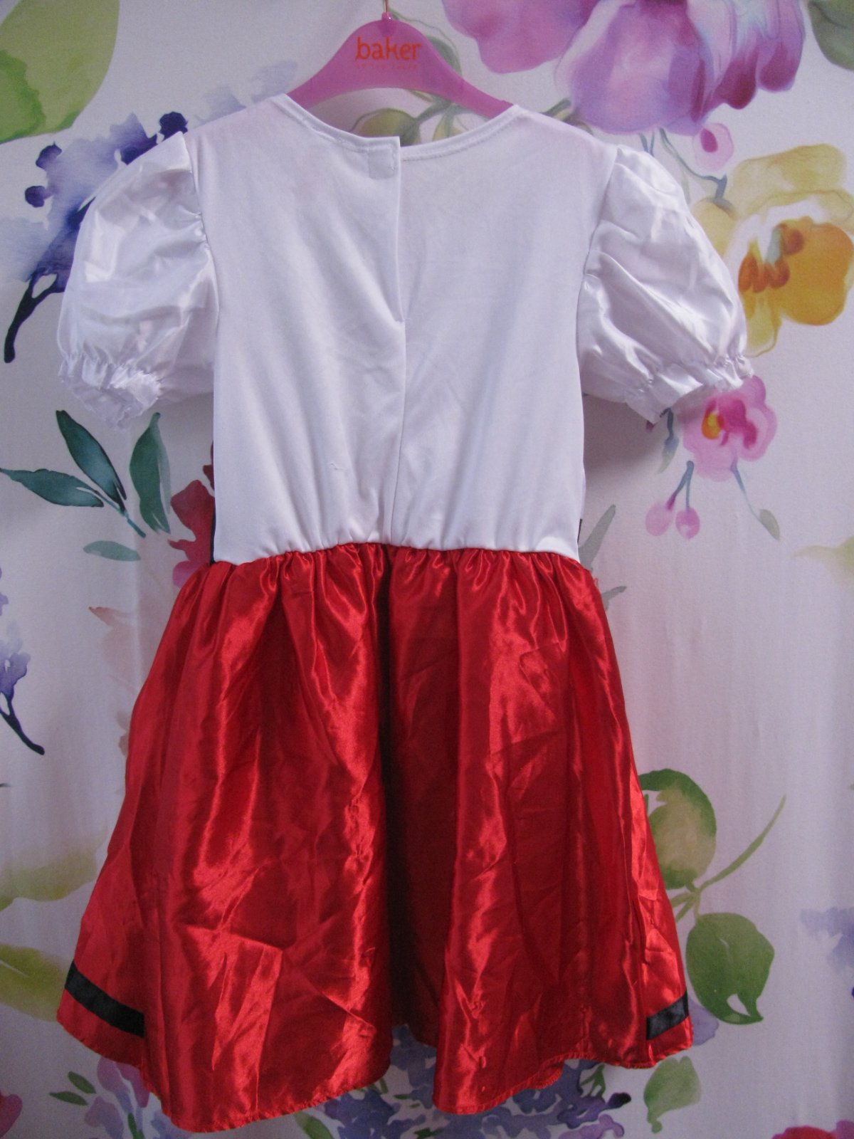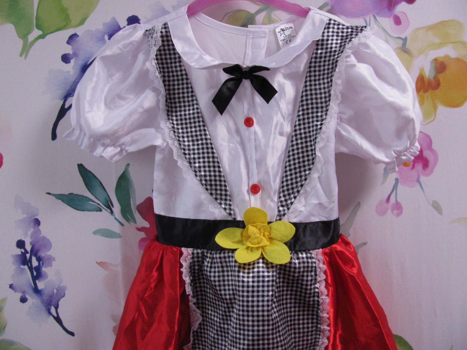 Krásný dívčí kostým, saténové šaty se zástěrkou, v pase a konce rukávů pružné do gumy, za krkem zap. na suché zipy, 100% polyester,.Malá zataž.nitka v pase na boku, jinak bez vady, velmi krásný stav.