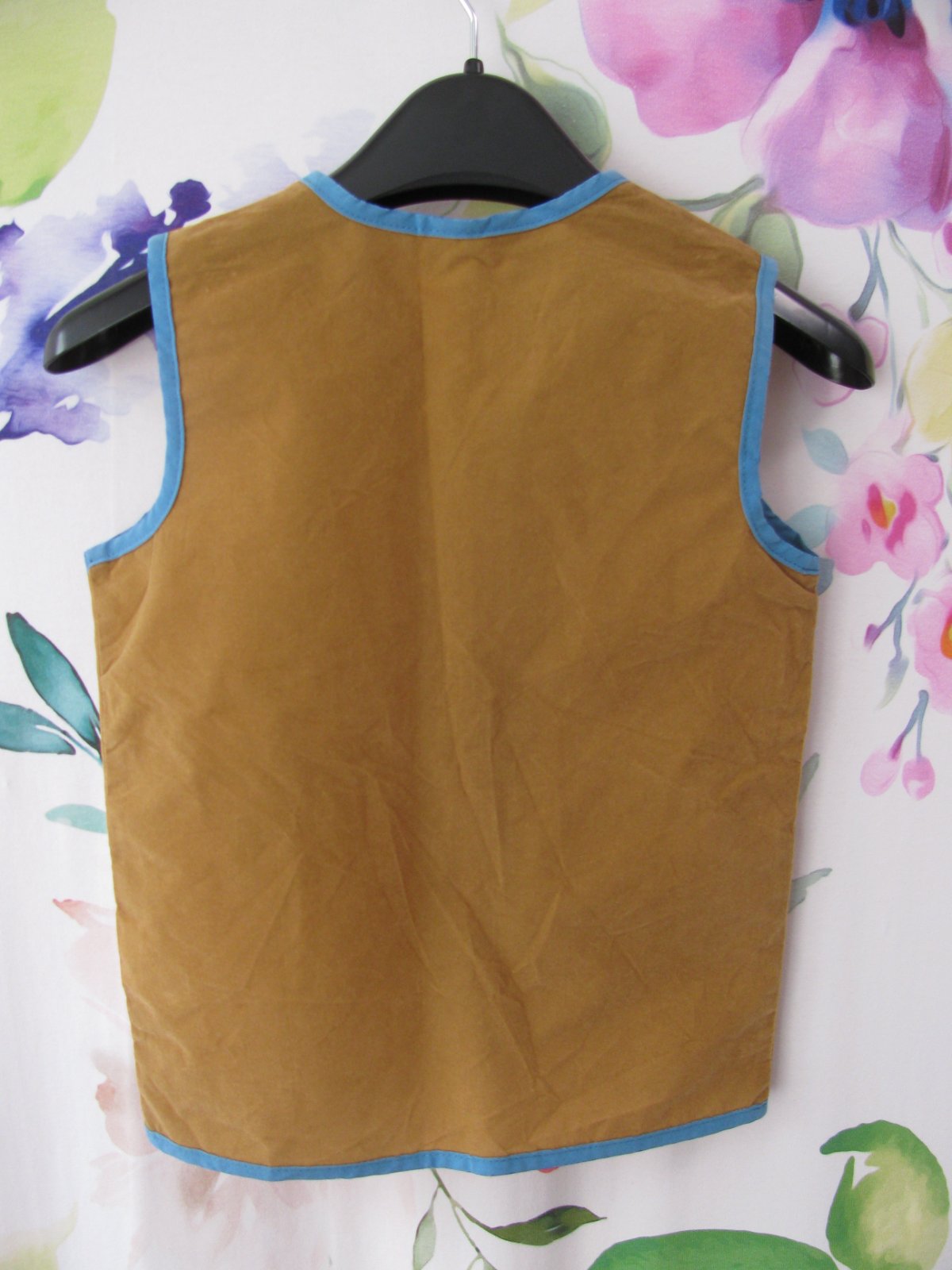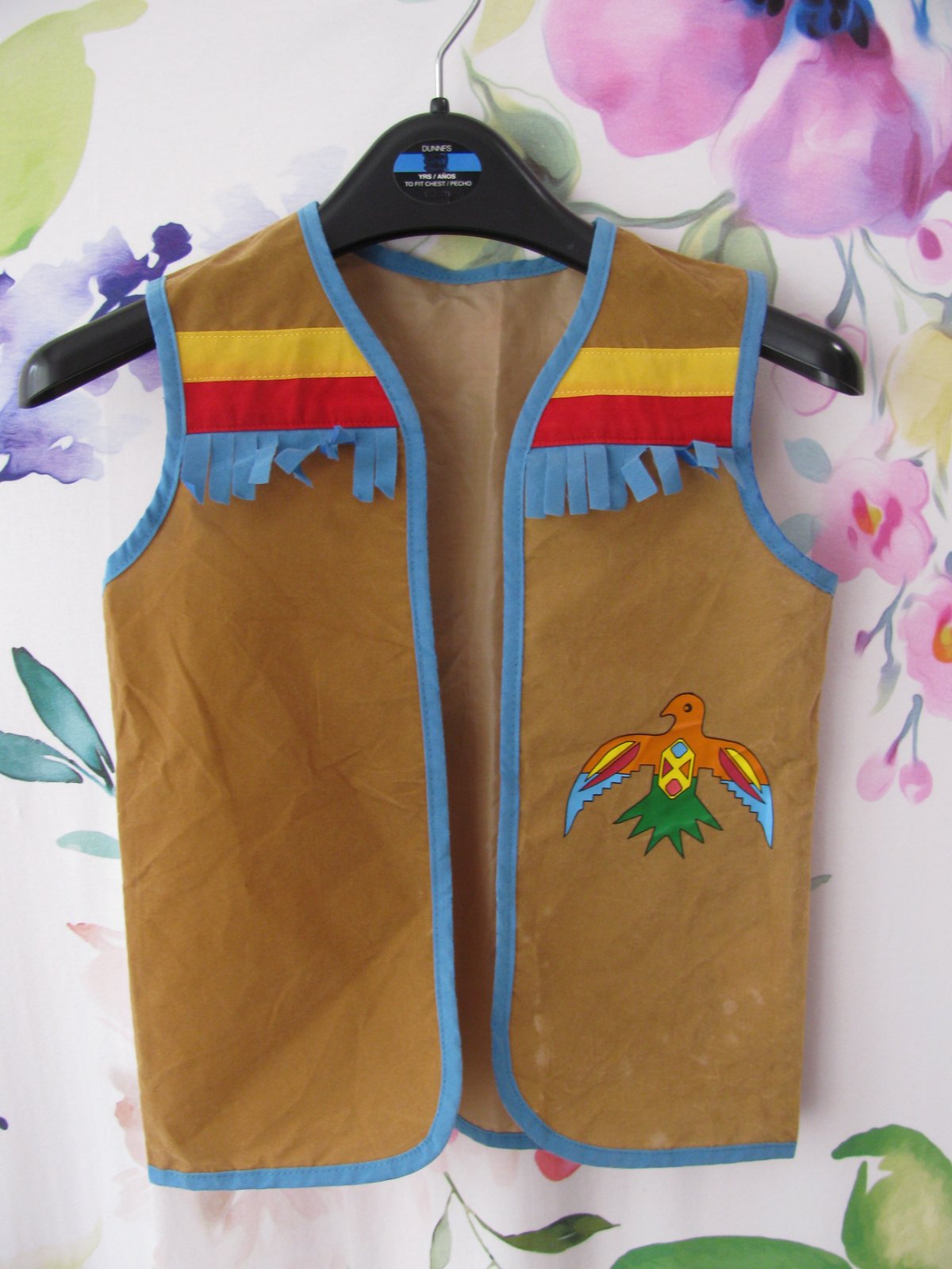 Hezká tenká vesta pro malého indiána, hezky zdobená, 100% polyester. Trošku otěr pod znakem - viz foto, zcela zanedbatelné. Dále moc hezký stav.