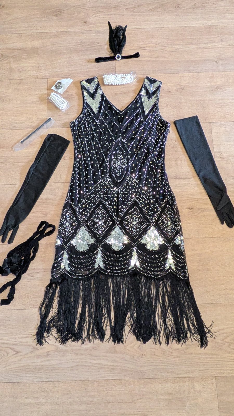 KA143 Flitrové třásňové šaty 20 - léta + sada doplňků vel. M, 38