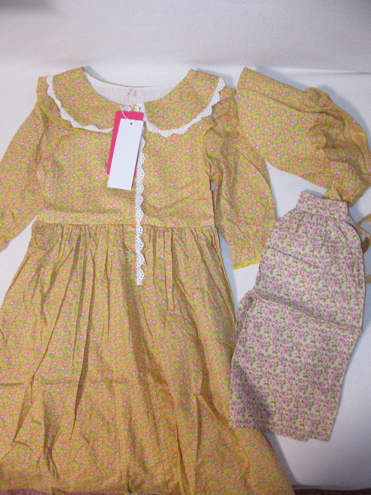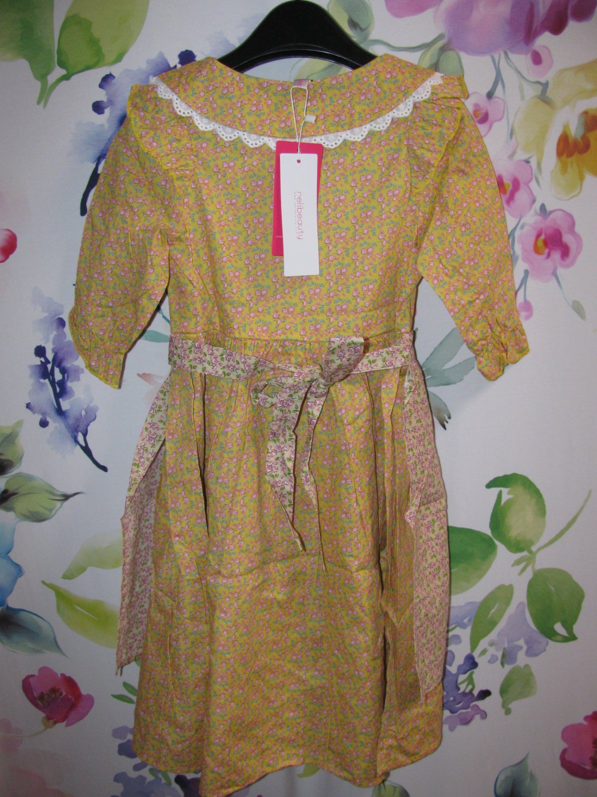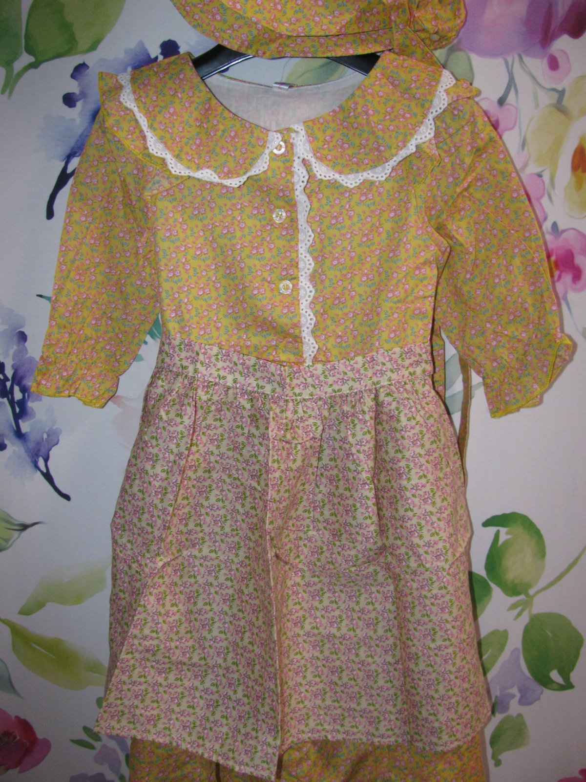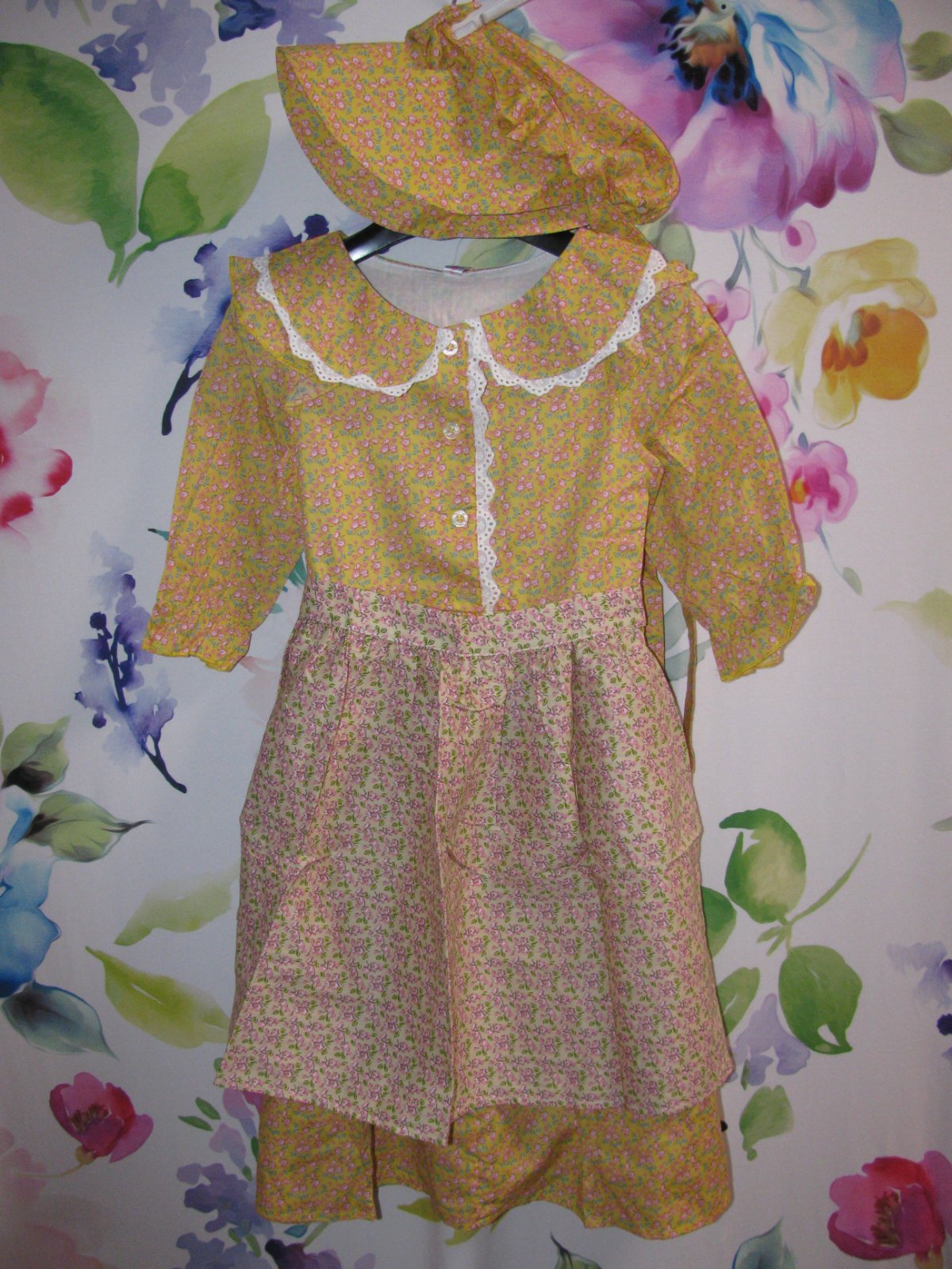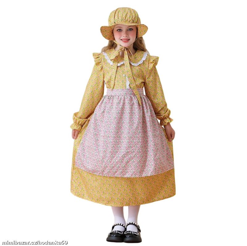 Krásný kostým- šaty, zástěrka, čepeček, .Plátěné šaty, ve předu zap. na knoflíky, konce rukávů do gumičky, v pase nejsou pružné. 100% bavlna. K šatům je plátěná zástěrka a čepeček.
