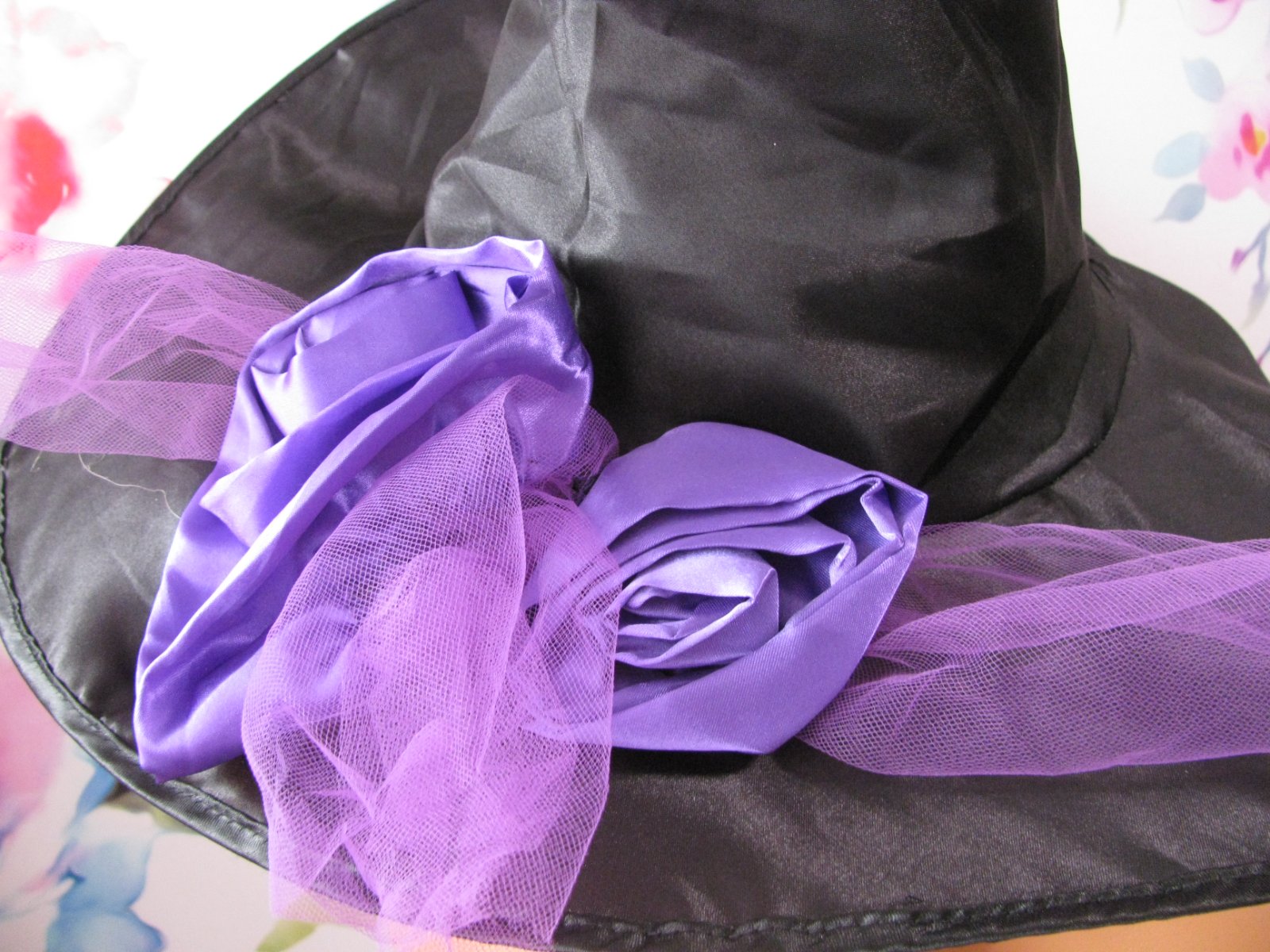 Skvělý černý klobouk, zdobený fialovými květy a tylem.100% polyester. Vyspravený kousek lemu, jinak bez vad.
