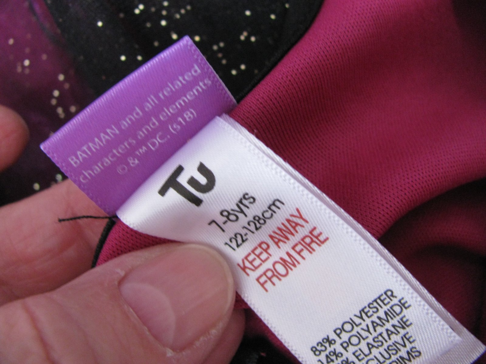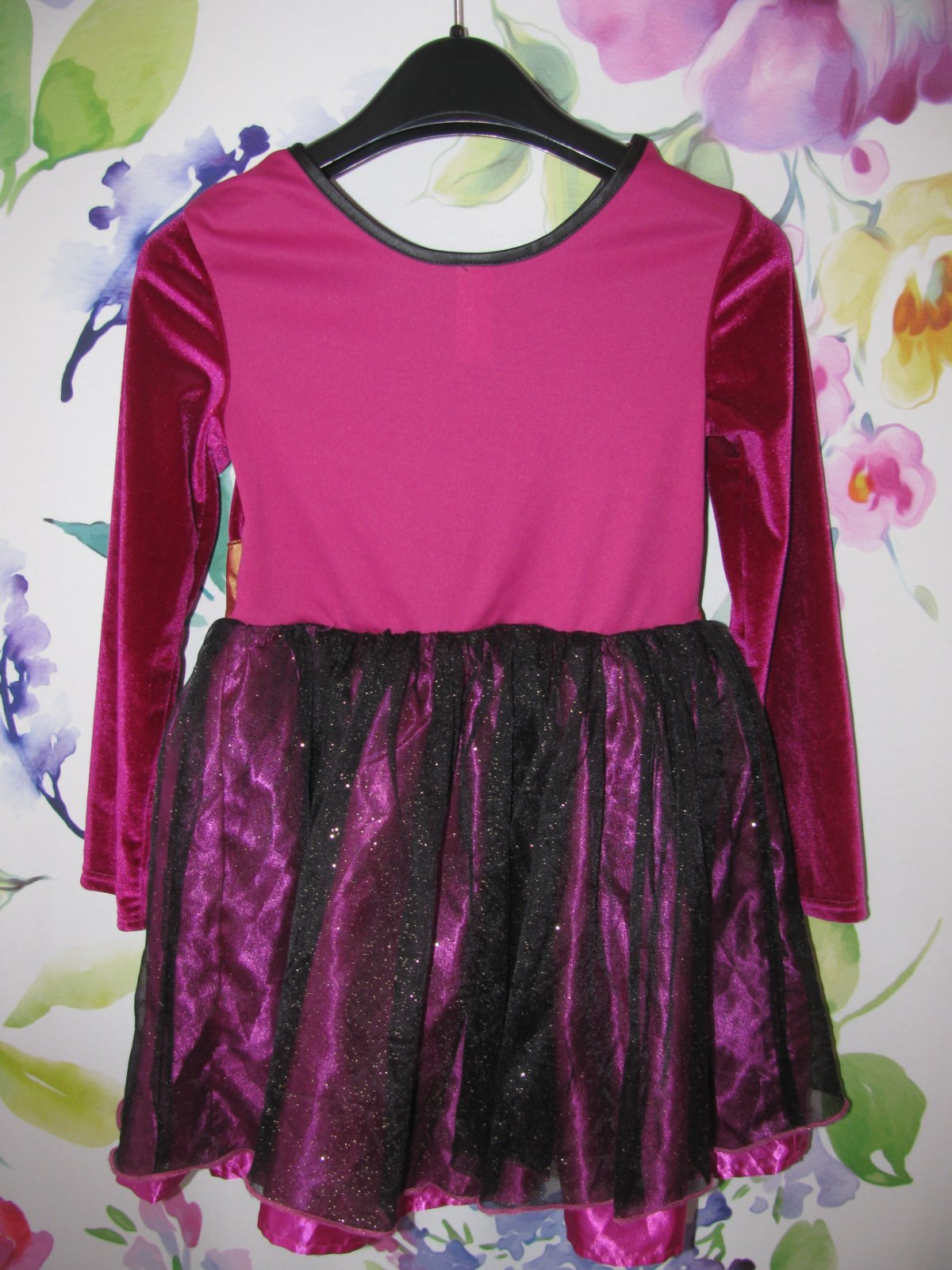 Krásné elastické fialovo černé šaty, třpytivá tylová sukně, elastické velurové bolerko, třpytivý znak na prsou, v pase pružné do gumy, 83% polyester, 14% polyamid, 3% elastan. Chybí 4 pajetky kolem znaku-upozorňuji pro pořádek, nic významného, jinak super stav bez jiných vad.