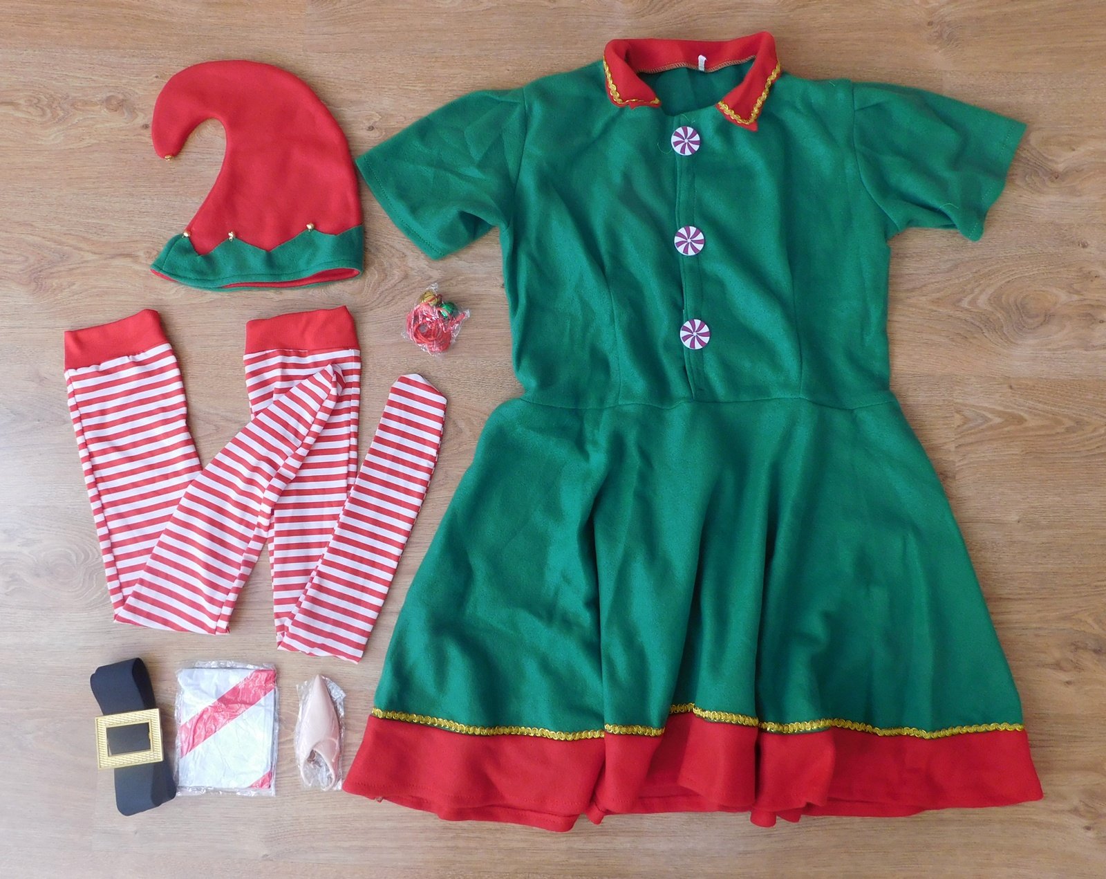 šaty d.90cm,š.2x52cm,elfí latexové uši,hůlka(nafukovací),zvonečky,podkolenky,pásek,čepice