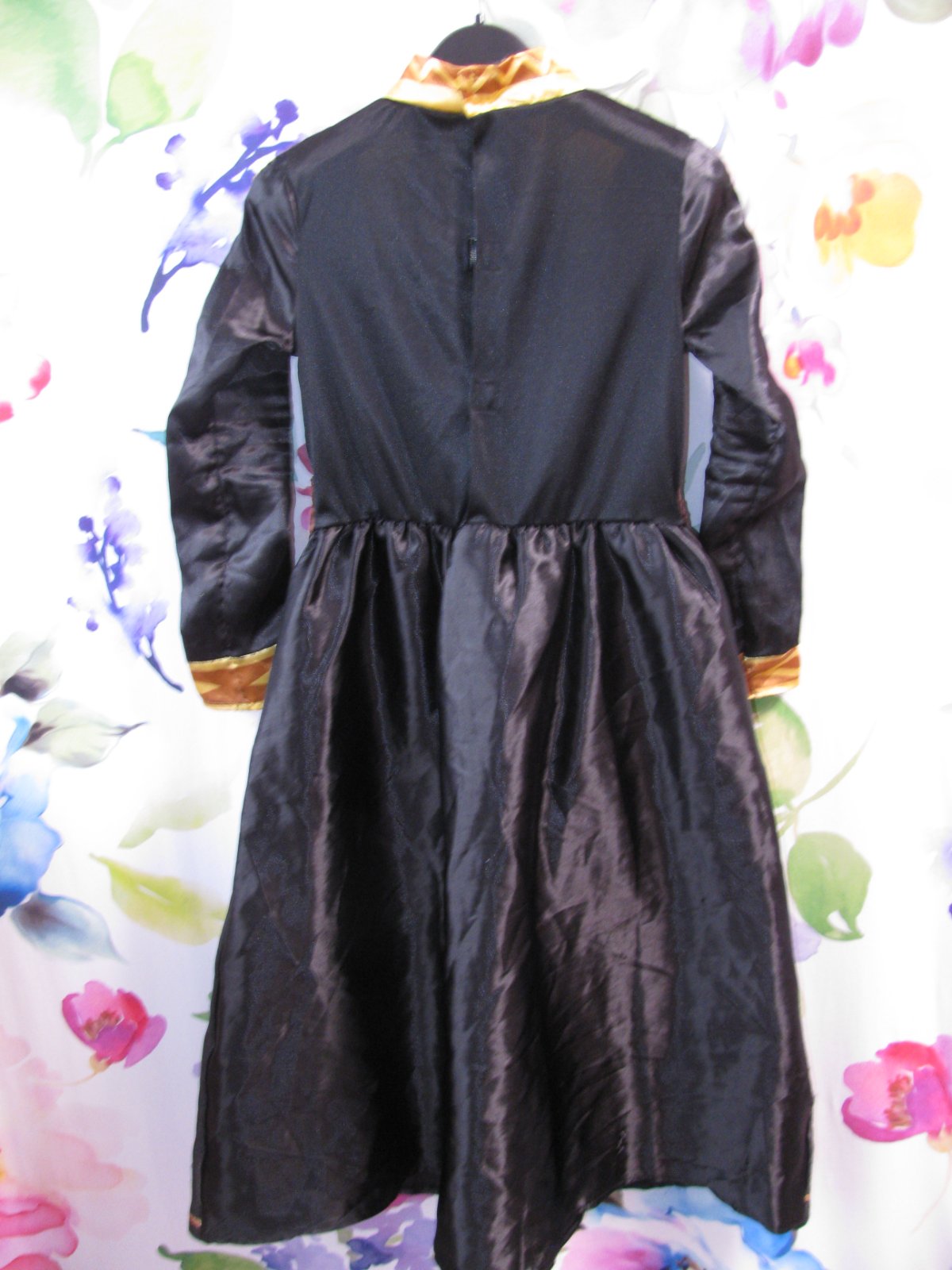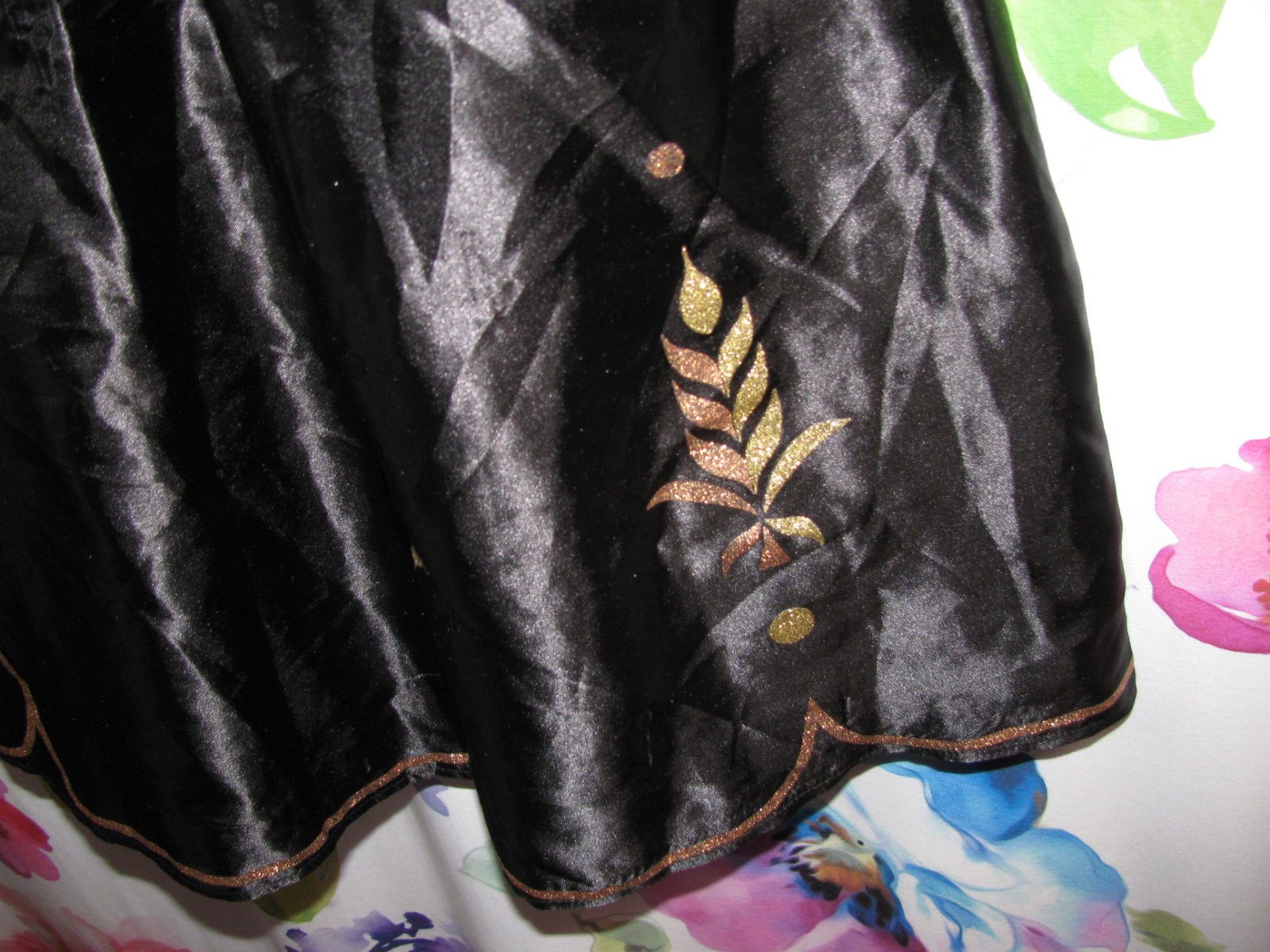 Krásné černo zlaté saténové šaty, třpytivé ornamenty, v pase pružné do gumy, za krkem zap. na suchý zip. 100% polyester. Top stav bez vady.