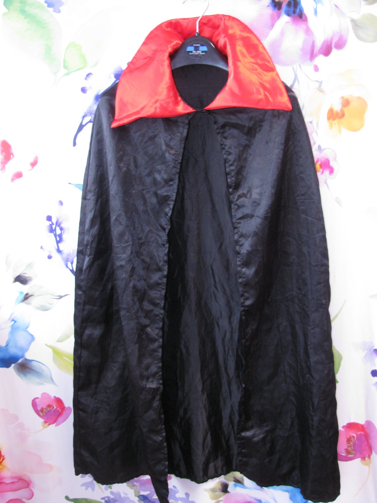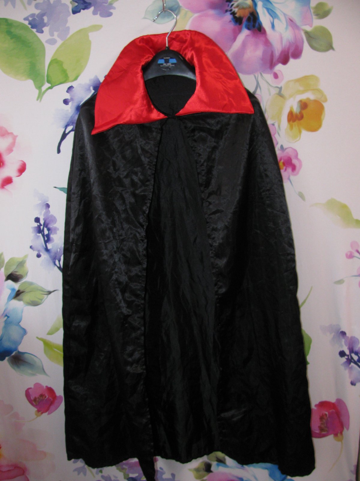 Černý saténový plášť, s vyztuženým límcem, pod krkem zap. na knoflík, 100% polyester. Uvedená vel.- 7-10 let.