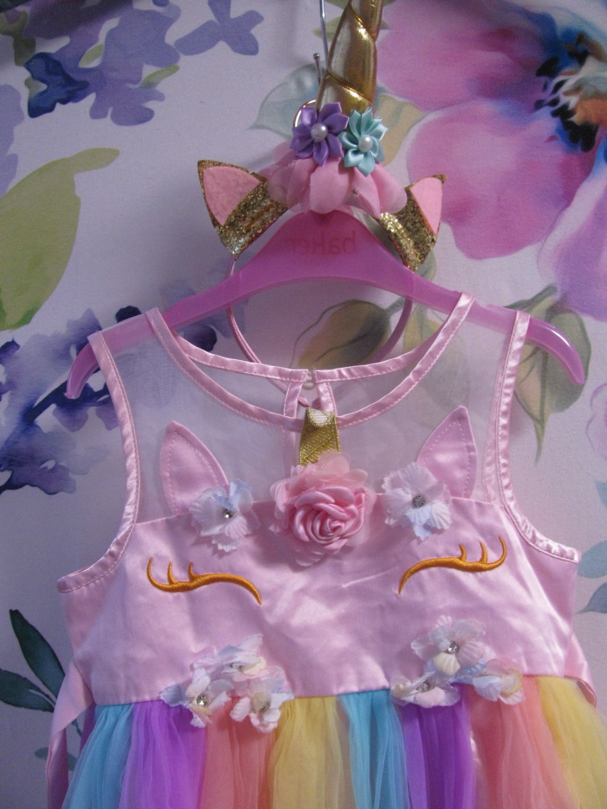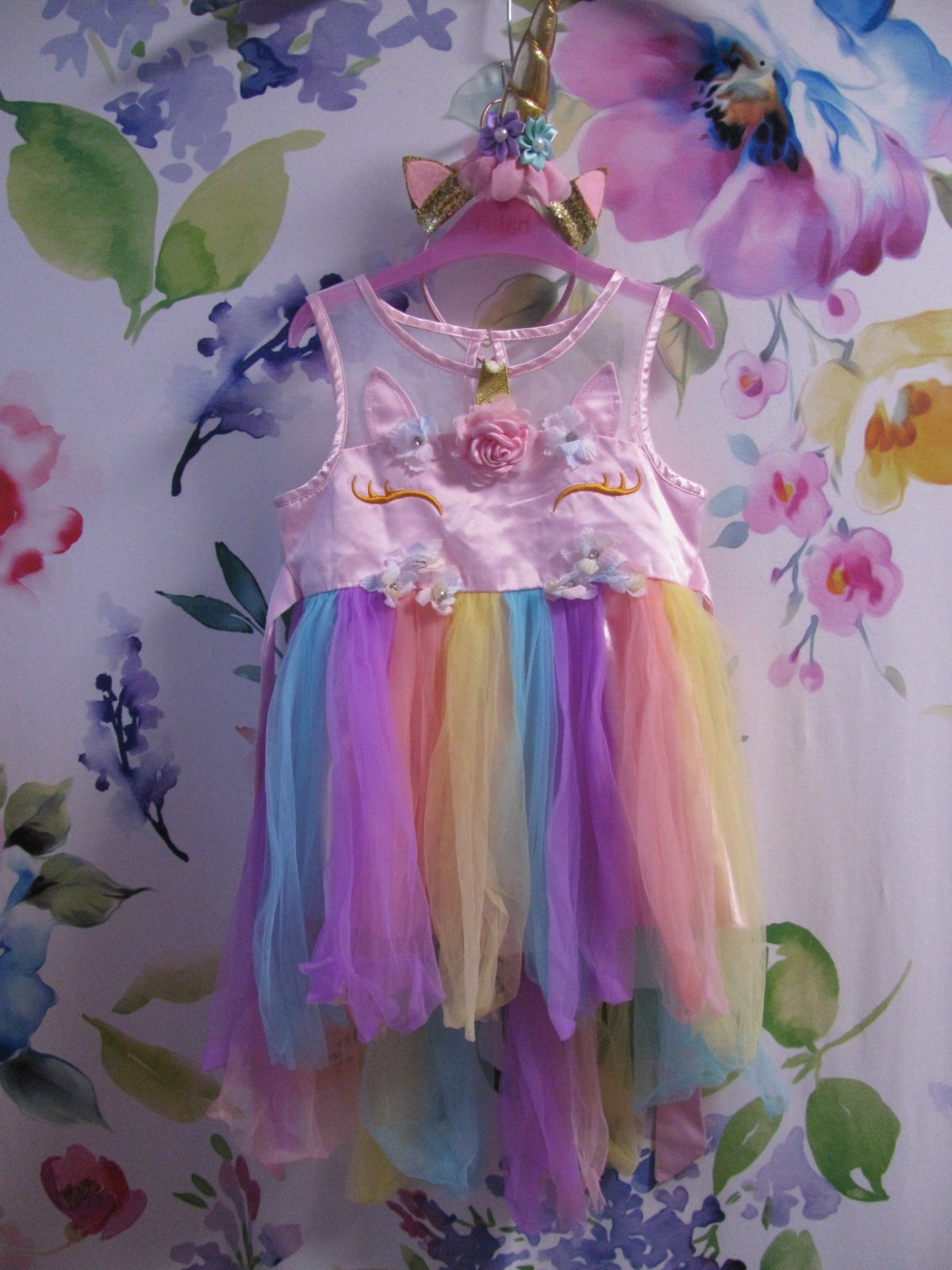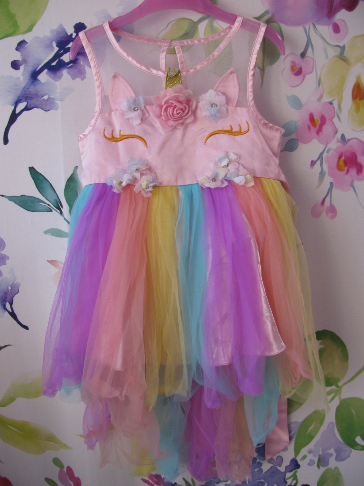 Krásné barevné tylové šatičky, zdobené kytičkami, vzadu dlouhý zip, za krkem na knoflík, stuha kolem pasu na uvázání, zadní část s tylem je prodloužená, v pase nejsou pružné. + čelenka do vlasů. 100% polyester. Top stav bez vady. Myslím, že velikost na štítku neodpovídá, proto prosím raději měřte, děkuji. uvádím vel.dle rozměrů.