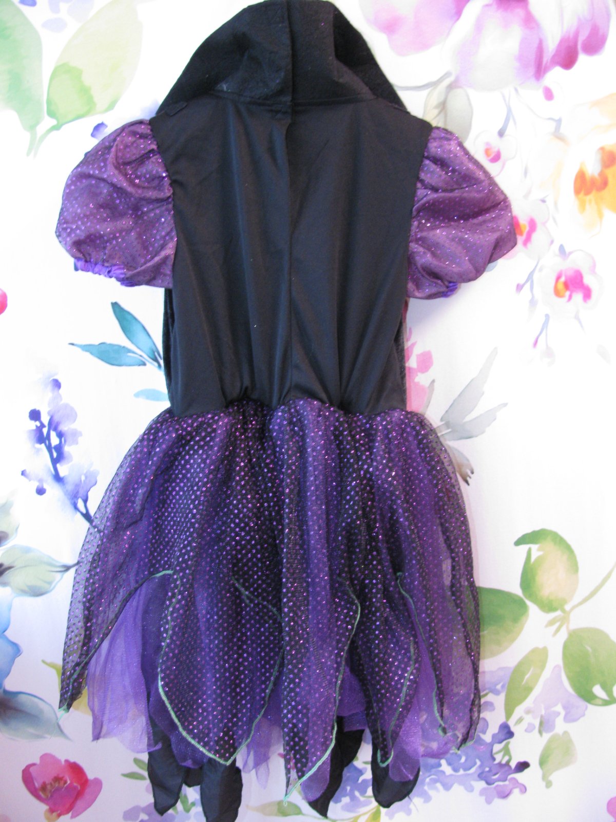 Krásné černo fialové šaty na malou čarodějku, nádherný třpytivý tyl, sukně vícevrstvá, pružné velurové bolerko, v pase a konce rukávů do gumy, stojací límec, za krkem zap. na suché zipy, pod sukni je kapsička s malým ovládačem na světelný efekt, ale nefunguje, nutno vyměnit baterie. 100% polyester. Top stav bez vady.