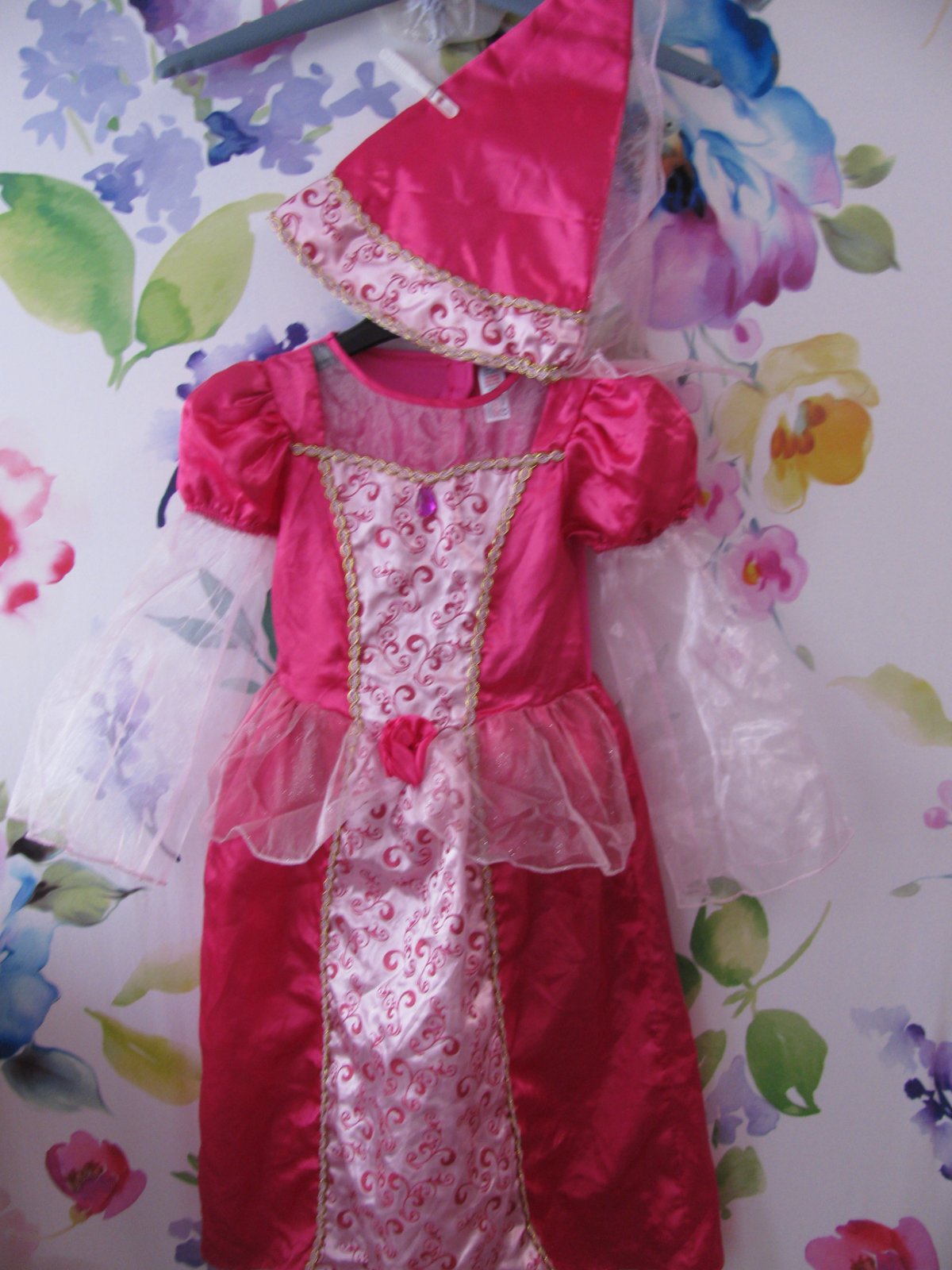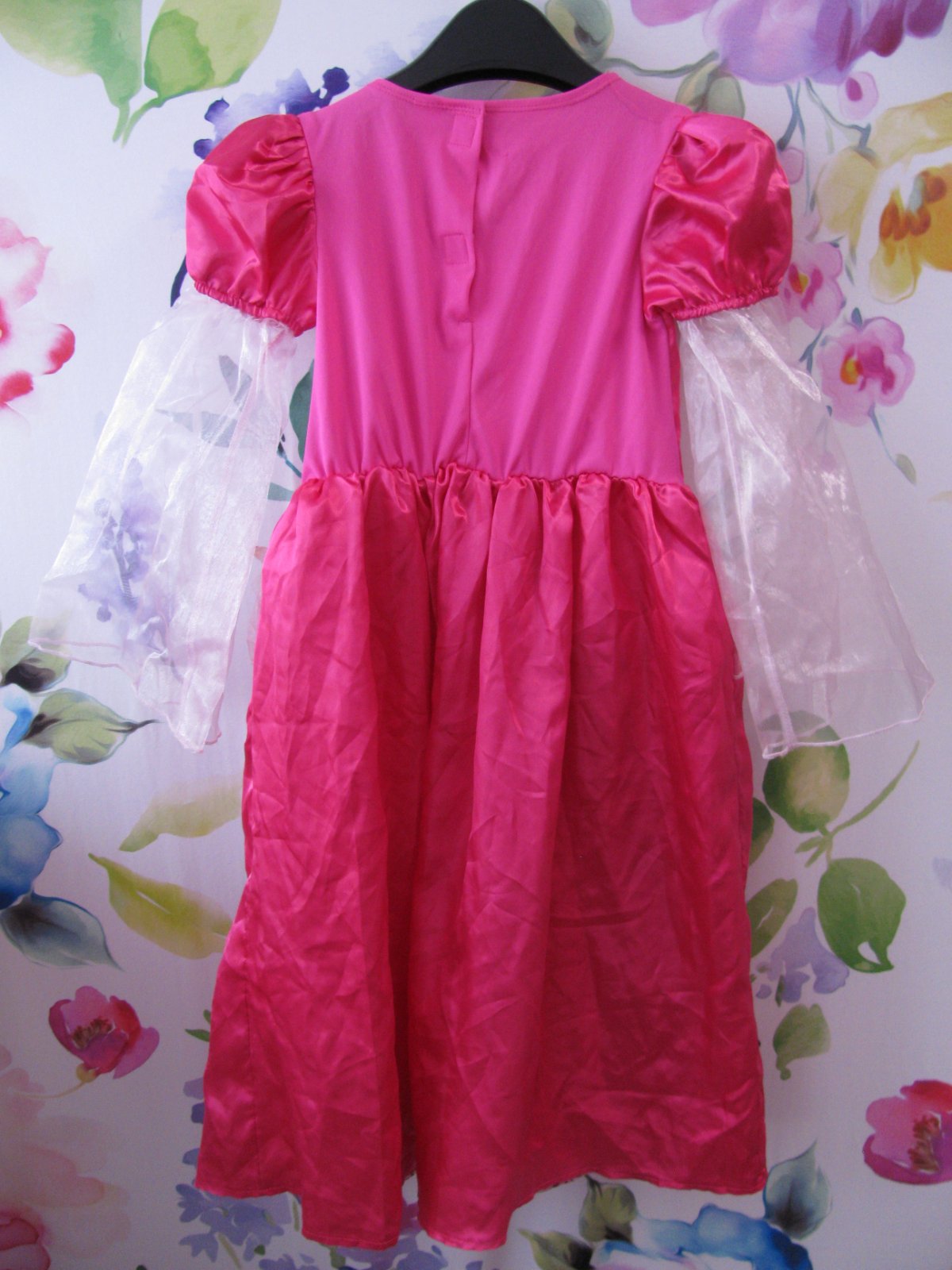Nádherné saténové šaty, s dlouhými tylovými rukávy, třpytivá malba, paspule, za krkem zap. na suché zipy, v pase pružné do gumy. 100% nylon, 100% polyester. K šatům je čepice s tylovým volánkem, spodní lem vzadu krátce do gumy, .