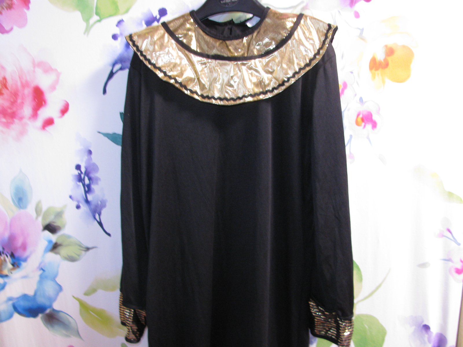Krásný elastický kostým, zlaté doplňky, za krkem zap. na suchý zip, 100% polyester. Za krkem zašitá malá ažurka-viz foto, jinak bez vady, hezký stav.