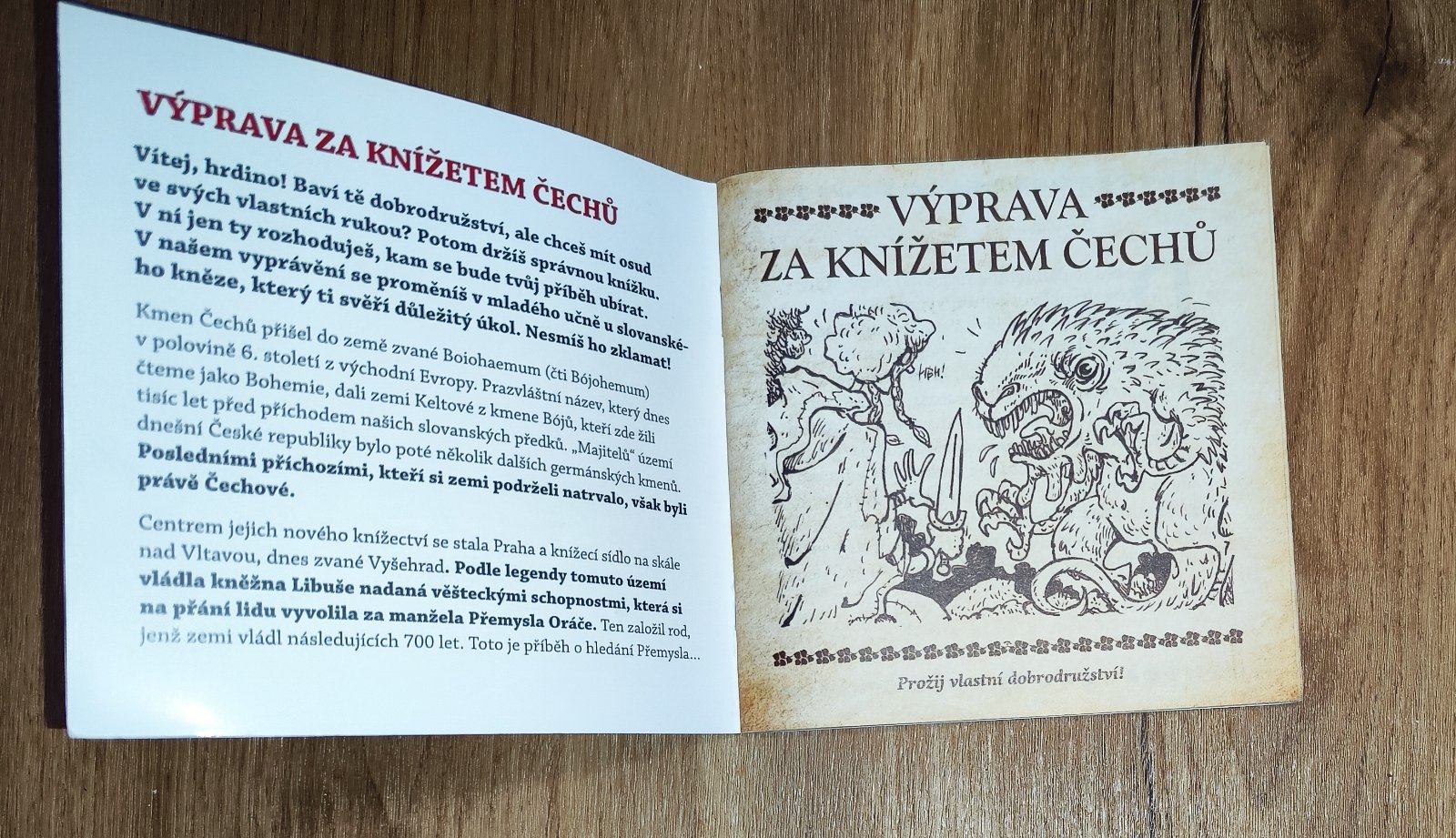 Prodám knihu Výprava za knížetem Čechů, která je čtvrtým dílem ze série gamebooků prožitkových dobrodružství. Chceš prožít historii na vlastní kůži? V tomto dobrodružství se vydáš po stopách starých Slovanů a každé tvé rozhodnutí určí, zda tvá výprava uspěje! Ocitneš se v dobách dávných knížat. Čekají tě nelehké úkoly, setkání s historickými postavami a napětí, které tě nepustí, dokud nedojdeš do cíle. Ty jsi ten, kdo rozhoduje, na jakou stránku se otočí dál! Napsal David Bimka, ilustroval Tomáš Chlud. Cena 85 Kč, v Brně možné osobní předání.