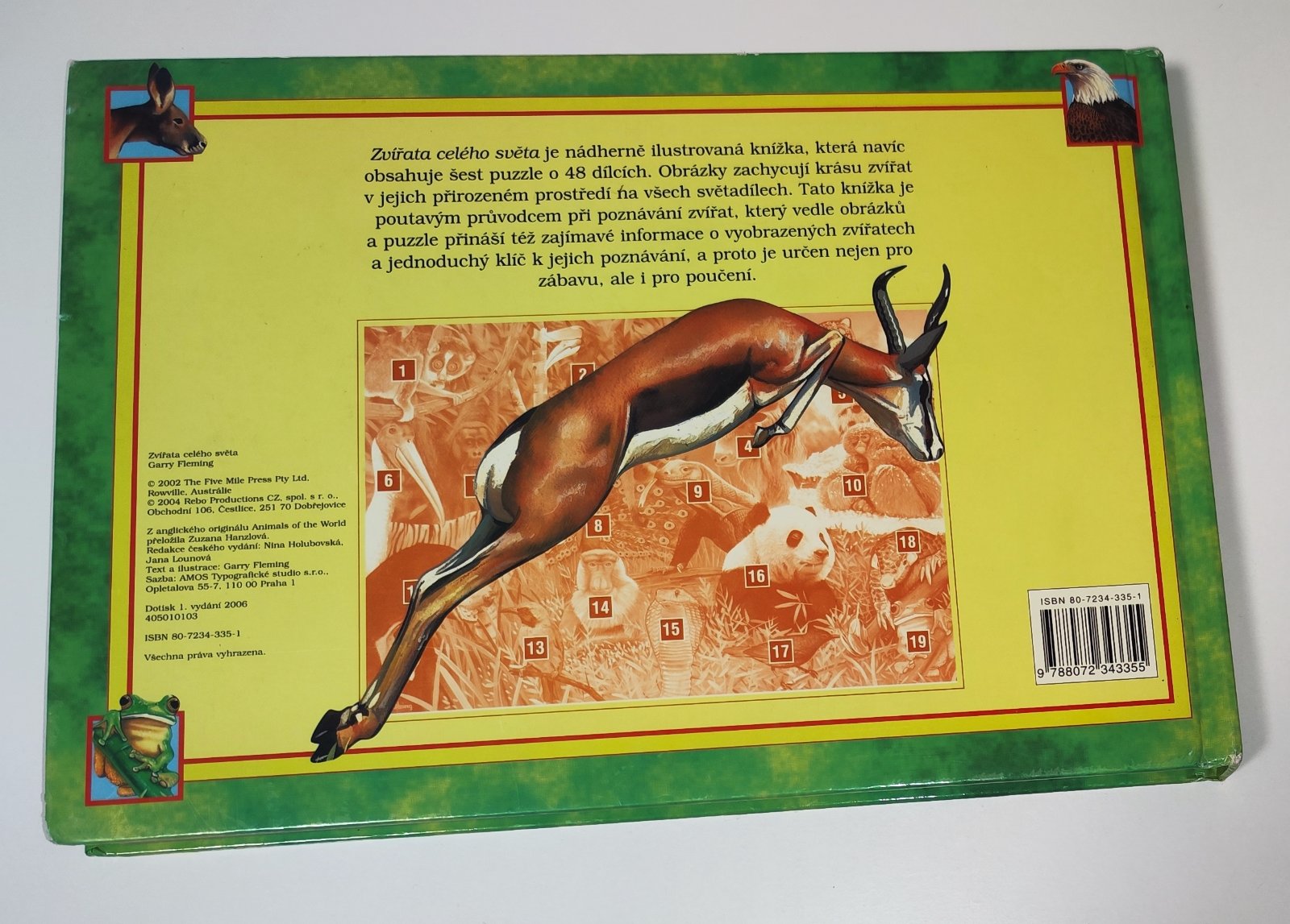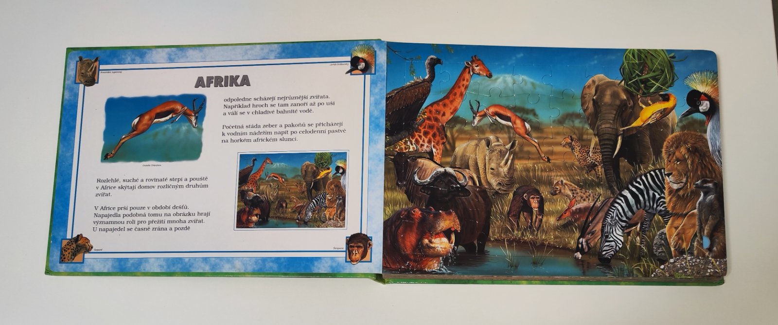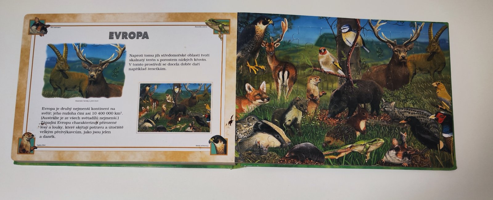 Prodám knihu Zvířata celého světa – knihu s puzzle. Krásně ilustrovaná kniha plná zvířat z různých kontinentů. Obsahuje 6 puzzle po 48 dílcích, které zobrazují zvířata v jejich přirozeném prostředí. Děti se zábavnou formou učí poznávat faunu celého světa. Puzzle kompletní. Cena 150 Kč, v Brně možné osobní předání.