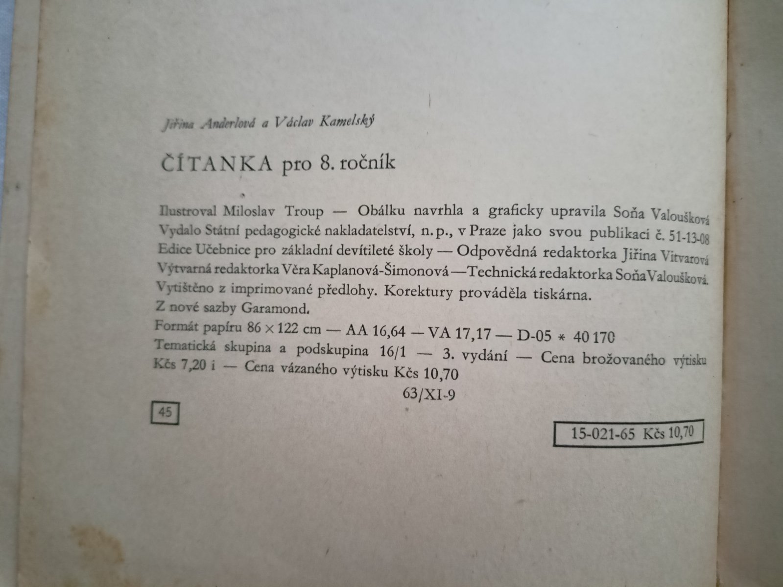 Čítanka pro 8. ročník, r. vydání 1965, stav viz foto.