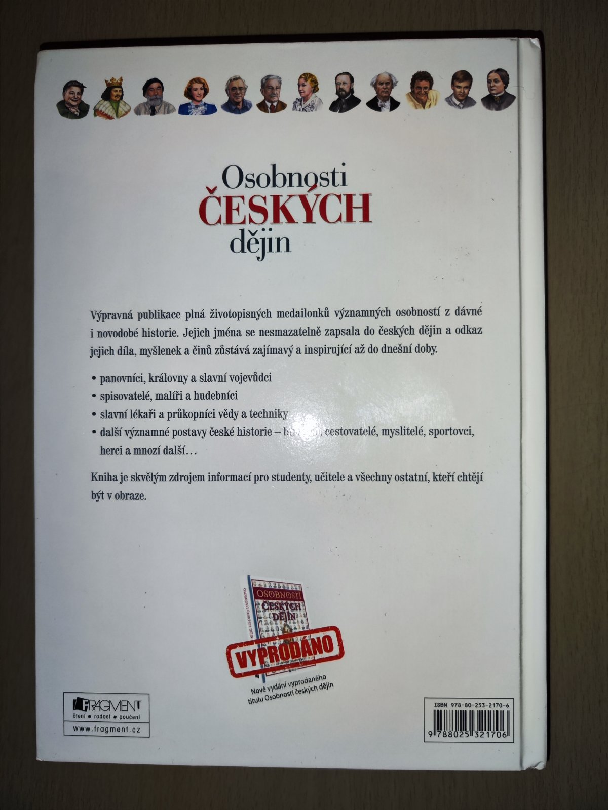 Prodám knihu Osobnosti českých dějin (439 nejvýznamnějších českých osobností). Vydalo nakladatelství Fragment, kniha má 536 stran. Seznamte se s nejvýznačnějšími osobnostmi českých dějin! Tato výpravná publikace zahrnuje široké spektrum osobností, které významným způsobem ovlivnily život v našem středoevropském prostoru v průběhu staletí. Bohatě ilustrovaný soubor původní edice Odkaz obsahuje přehled medailonů osobností od českých panovníků a slavných vojevůdců po představitele kultury, slavné lékaře a průkopníky vědy a techniky. Velmi dobrý stav, cena 280 Kč, v Brně možné osobní předání.