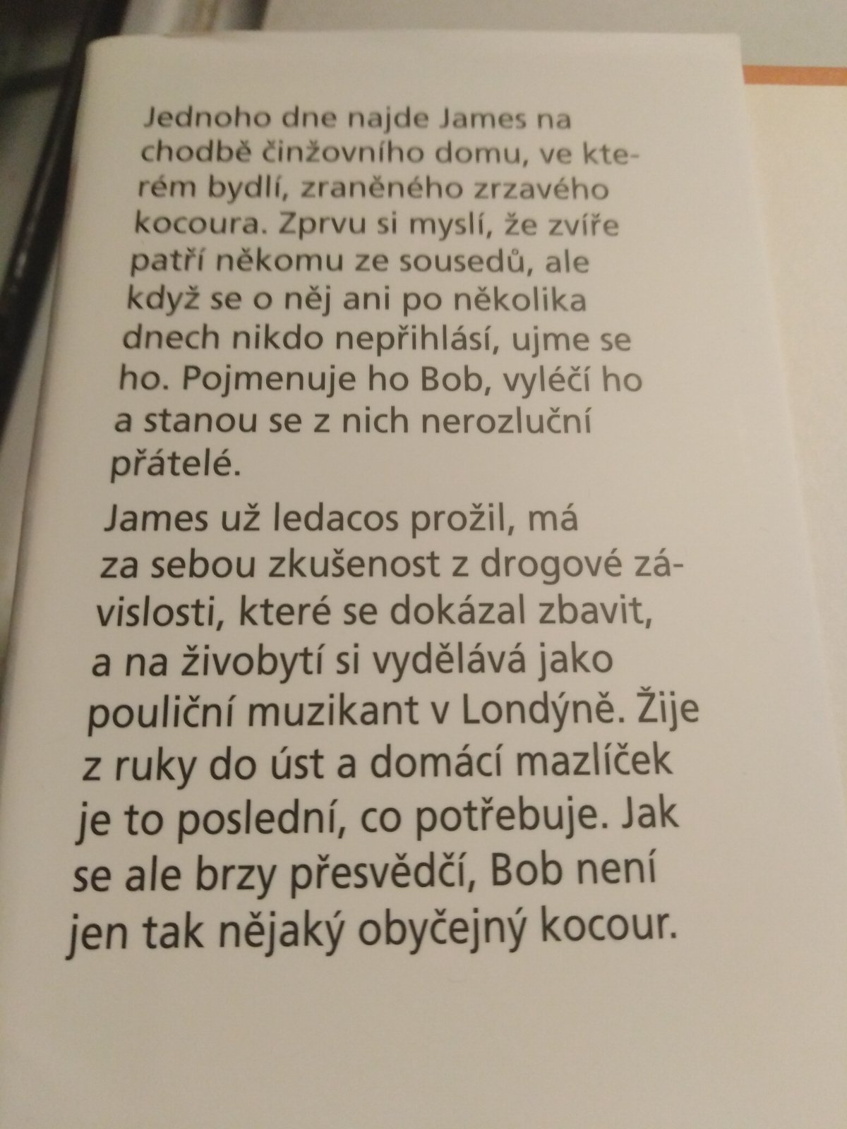 Neobyčejná kniha s neobyčejným příběhem. I tak lze popsat jednu z nejprodávanějších britských knih současnosti. Poutavý, autobiograficky laděný příběh o přátelství mezi mladým muzikantem a jeho kocourem byl přeložen již do 26 světových jazyků a dočkal se více než 850 000 prodaných výtisků. James, bývalý bezdomovec a potulný muzikant, nalezl jednoho dne u svého bytu zraněného kocoura a dal mu jméno Bob. Vzniklo mezi nimi silné pouto, které pomohlo Jamese definitivně vysvobodit z drogové závislosti. Bob zároveň začal Jamese doprovázet na jeho pouličních vystoupeních v ulicích Londýna. Stala se z nich nerozlučná dvojka, jež je dodnes zajímavou atrakcí pro turisty ze všech koutů světa. Při tom všem zažívali komická i nebezpečná dobrodružství, která se stala součástí tohoto oblíbeného bestselleru.