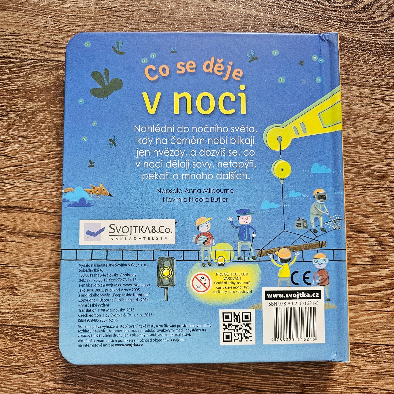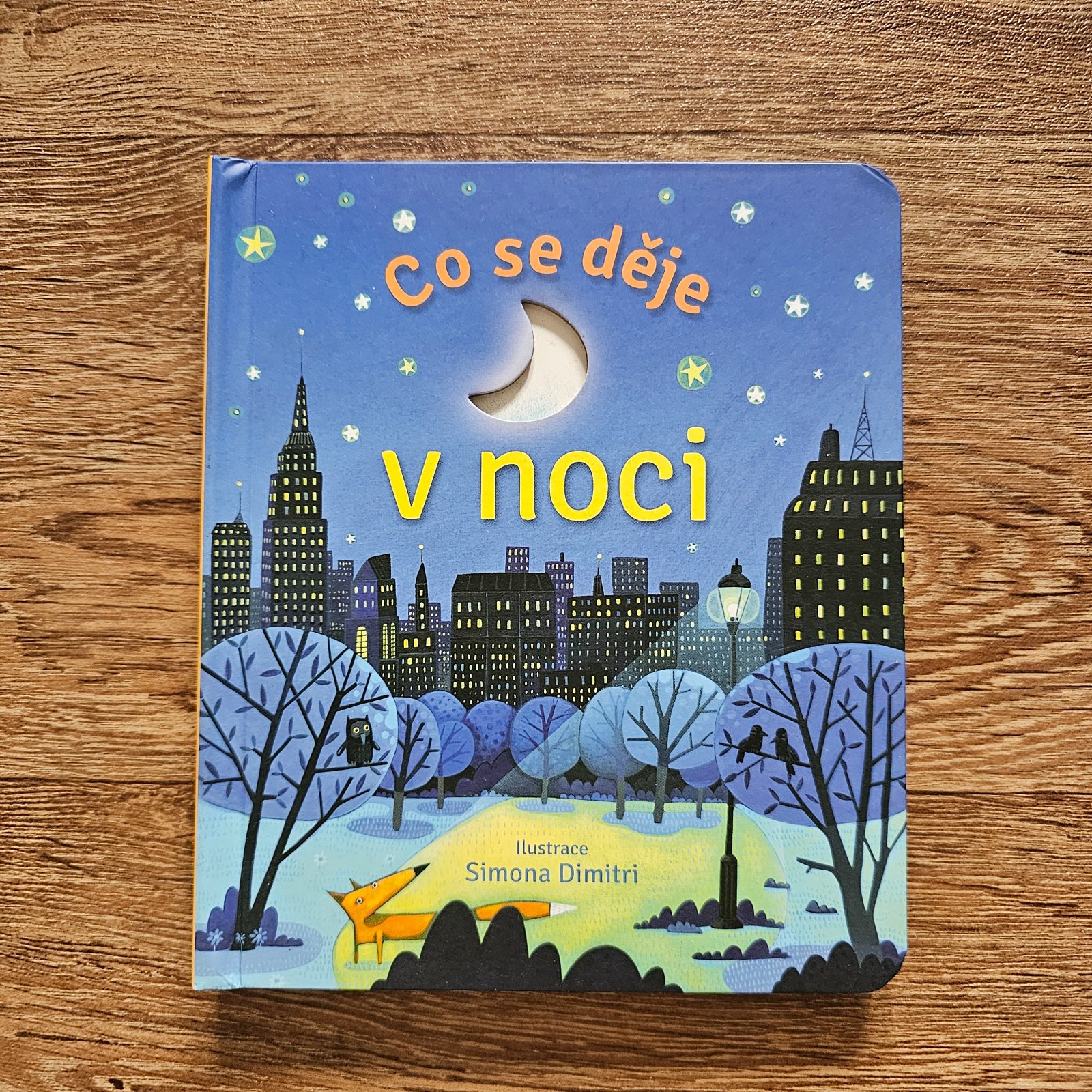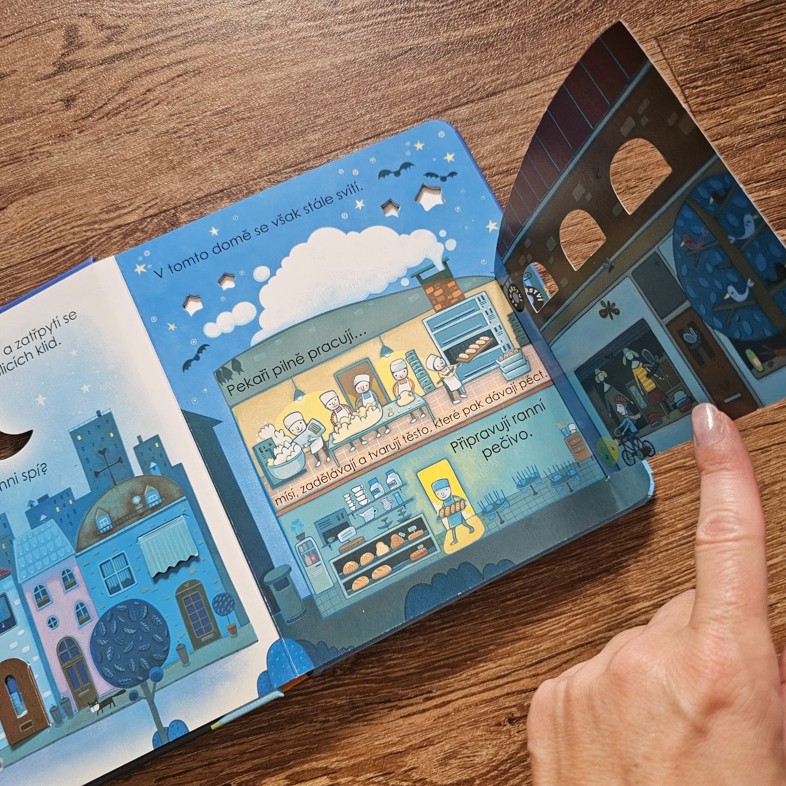 Krásně ilustrovaná Ma odklápěcí okénka kde děti vidí noční život zvířat i lidí pracujících v noci.