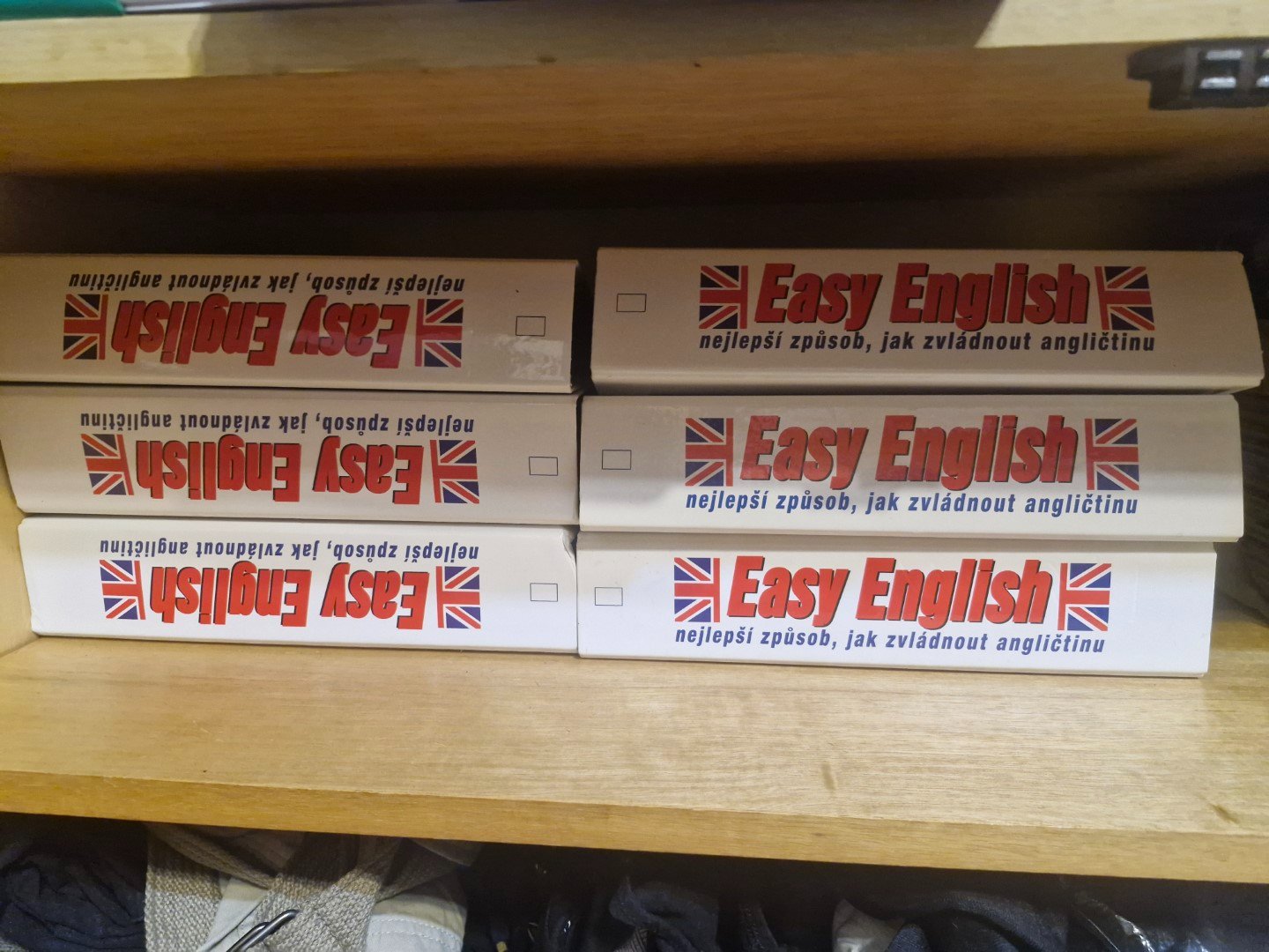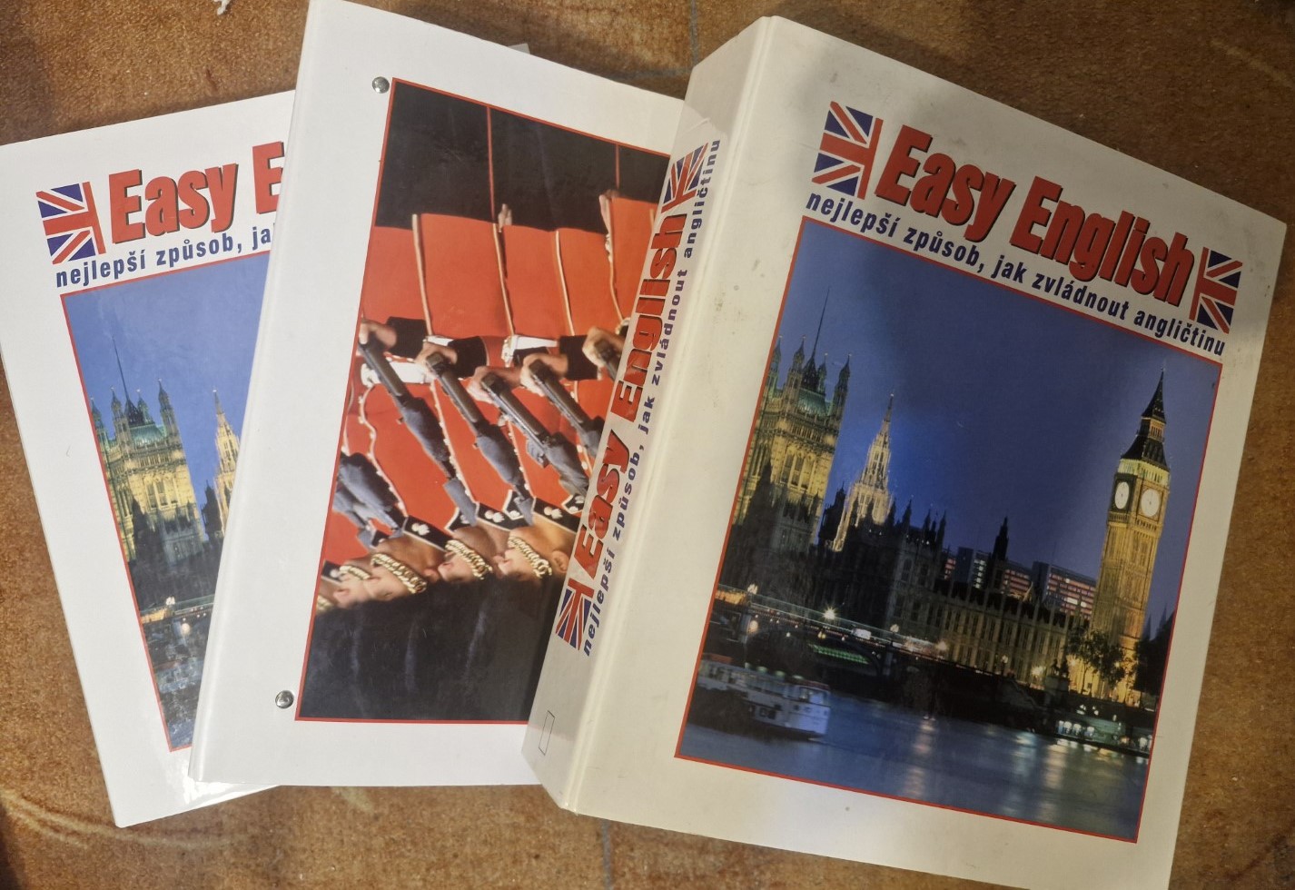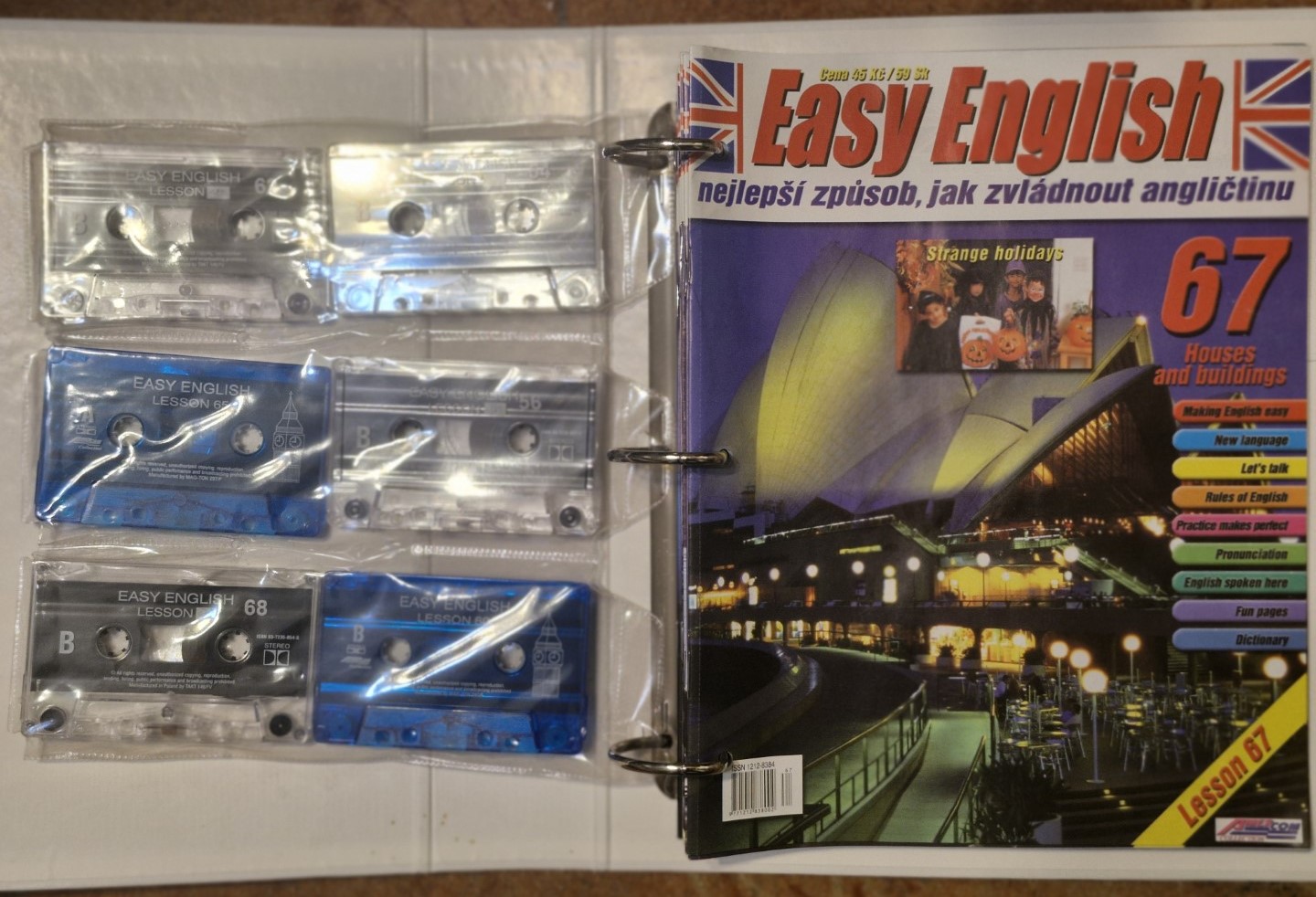 Easy English - celkem 6 pořadačů. Sešity řazené po lekcích, vč. audiokazet.