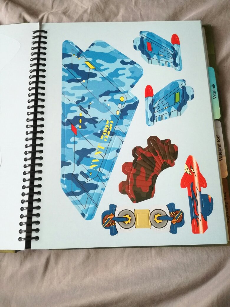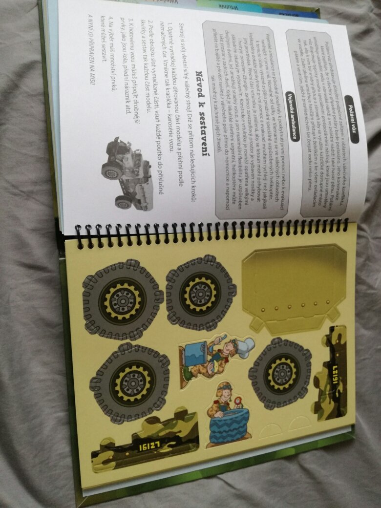 Skládačková knížka obsahuje modely silných strojů. 4 vozidla ( vrtulník, válečná loď, vojenský vůz, stíhačka ), spoustu postaviček. Krom skládání si také přečtou spoustu věcí, nové, pošta 55,-