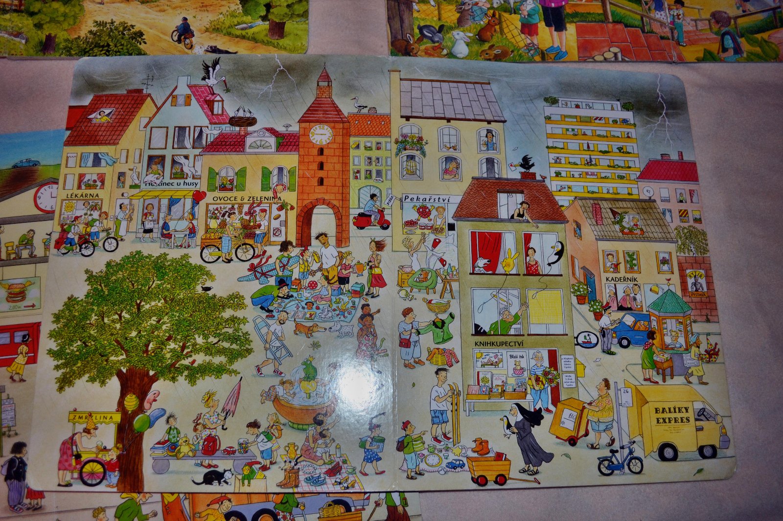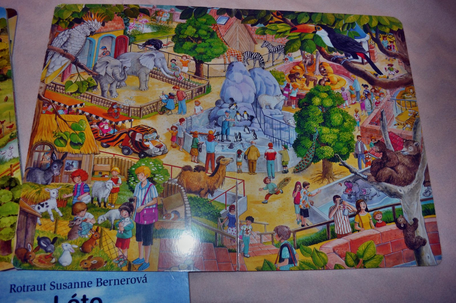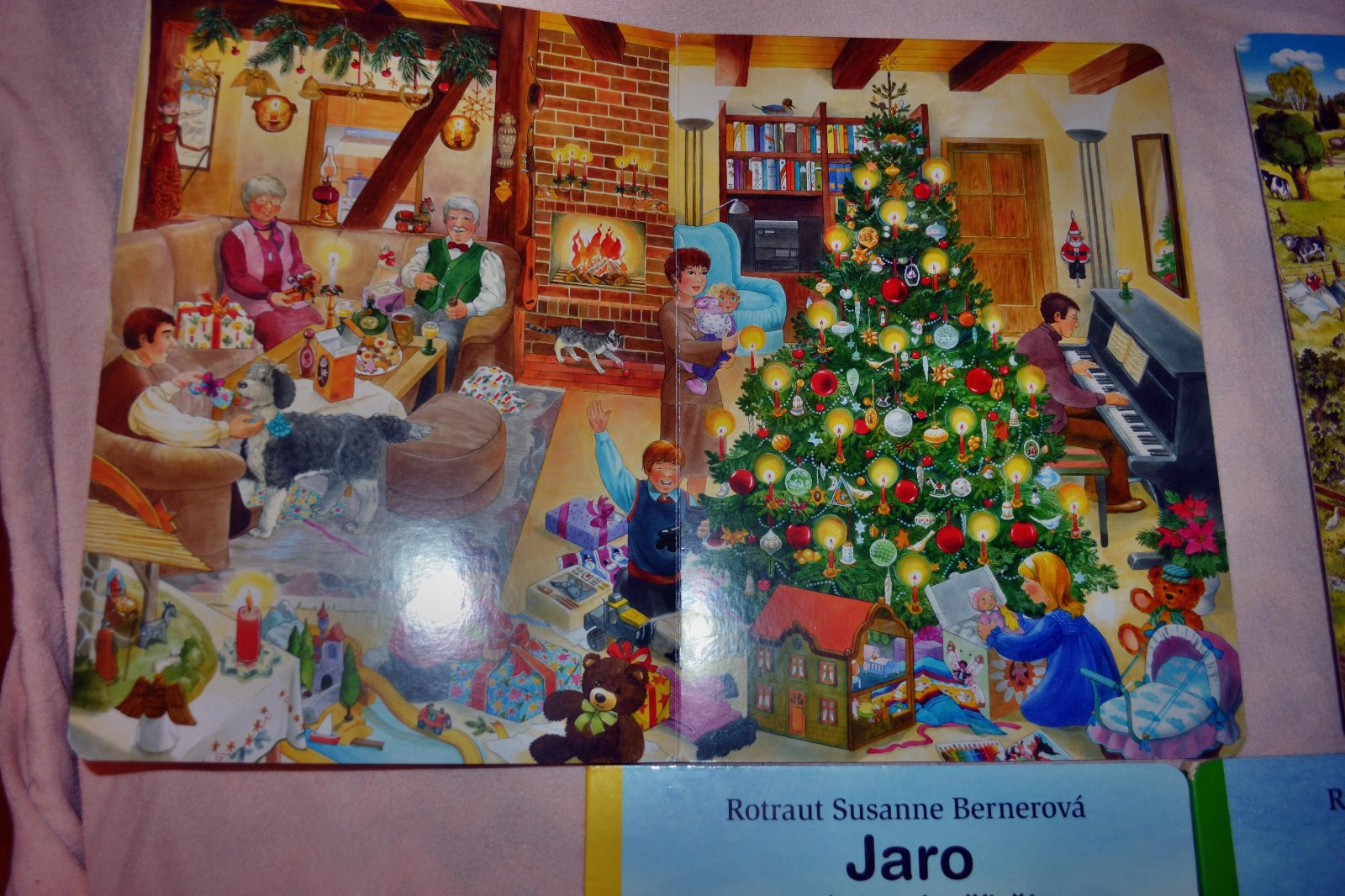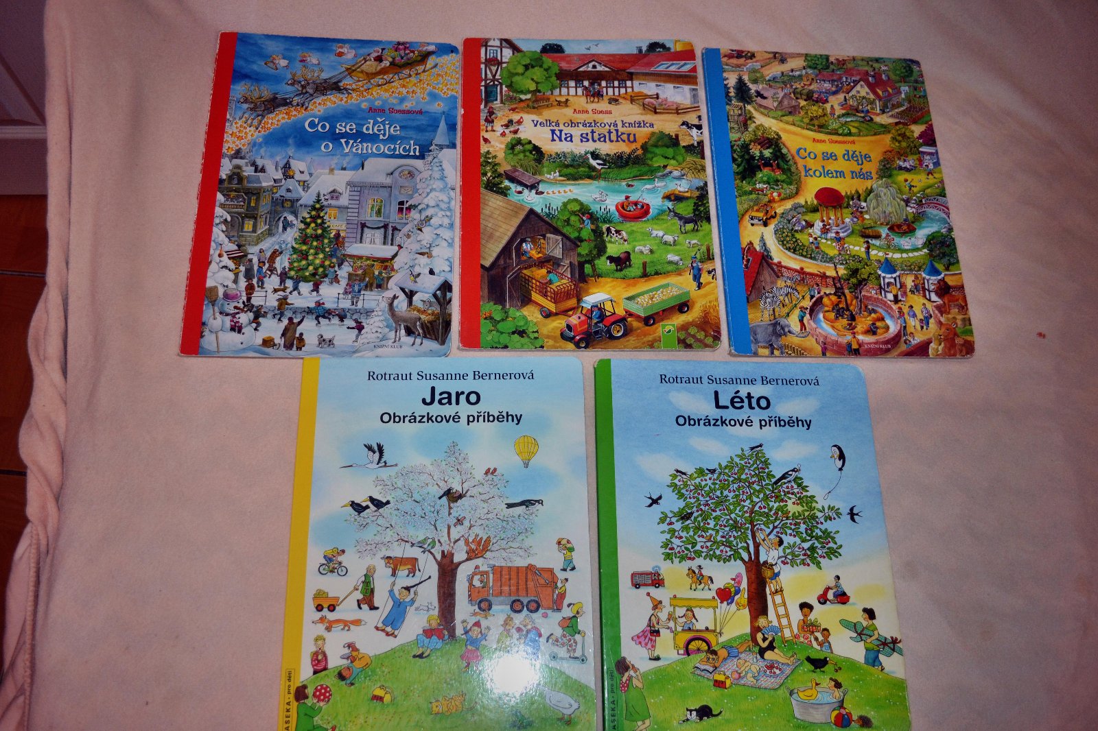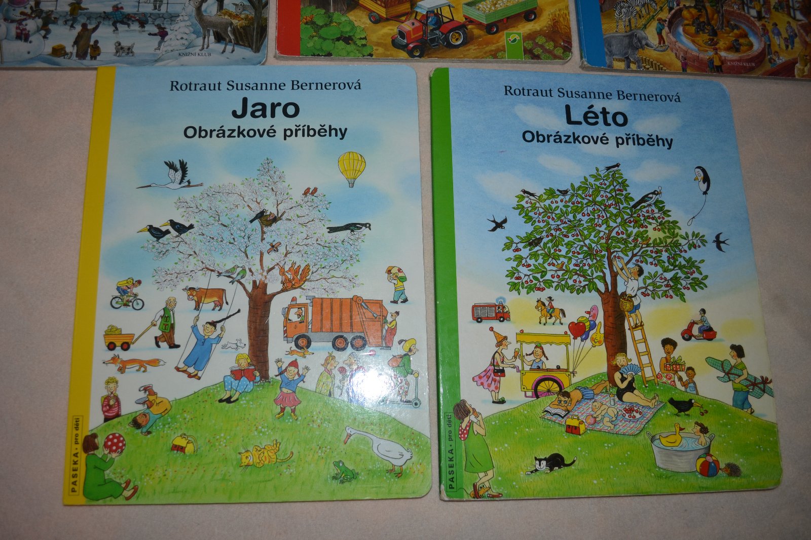 výborná kniha-velkoformátové leporelo,jednoduchou řečí obrázků vypráví renomovaná autorka a ilustrátorka dětských knih Rotraut Susanne Bernerová a Anne Suessová . Co se děje o vánocích a v zimě, Kolem nás, Na statku,Jaro, Léto. Nádherné knihy, kde se děti vše naučí zábavnou formou a zaujmou na hodně dlouhý čas. Cena za kus 80kč, zvýhodněná za celek 350kč