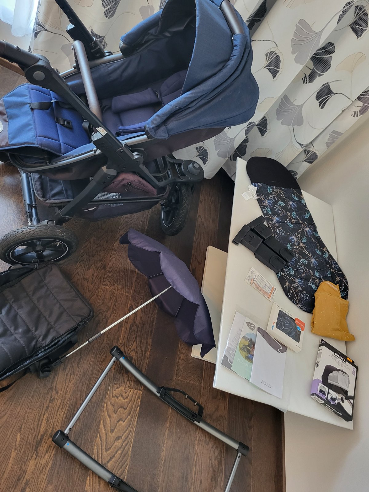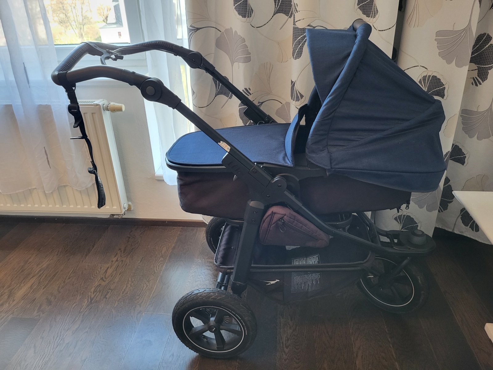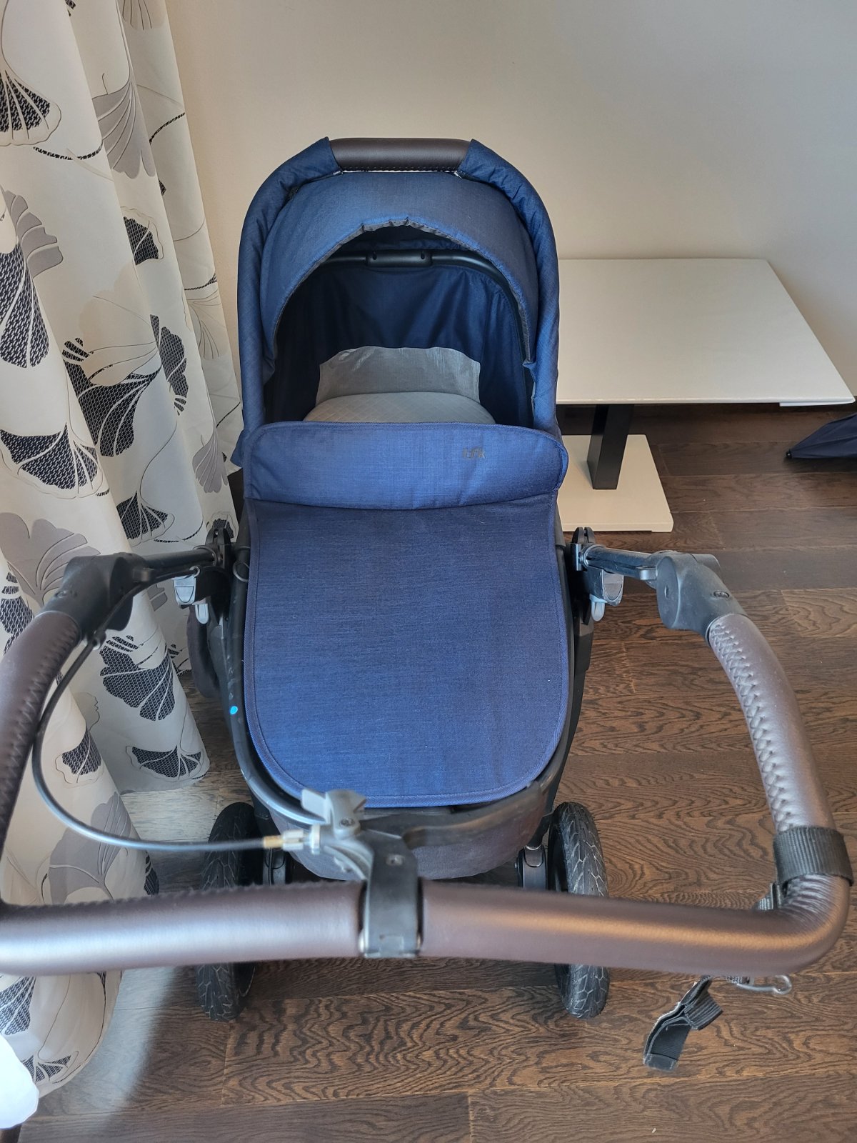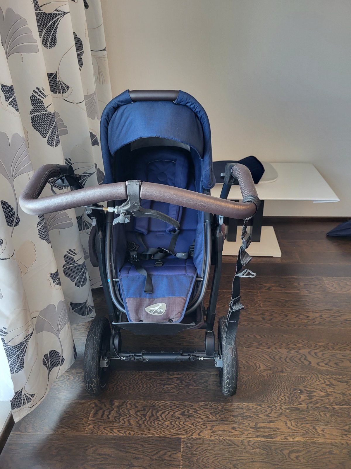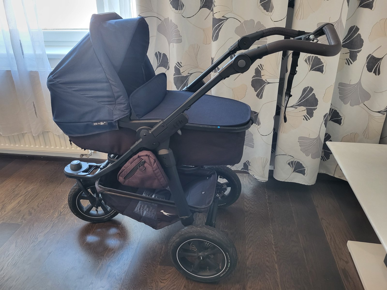 sportovní terénní stabilní OBOUSMĚRNÝ kočárek s RUČNÍ BRZDOU, jednoduše PŘEKLOPITELNÁ velká hluboká korbička do SPORTOVNÍ verze kočárku a do několika poloh s podnožkou, tmavě modrý s hnědou koženkovou rukojetí, 3 nafukovací kola, praktické boční kapsy na drobnosti, profesionálně vypraný. Ve výborném stavu a v záruce do 19. června 2026