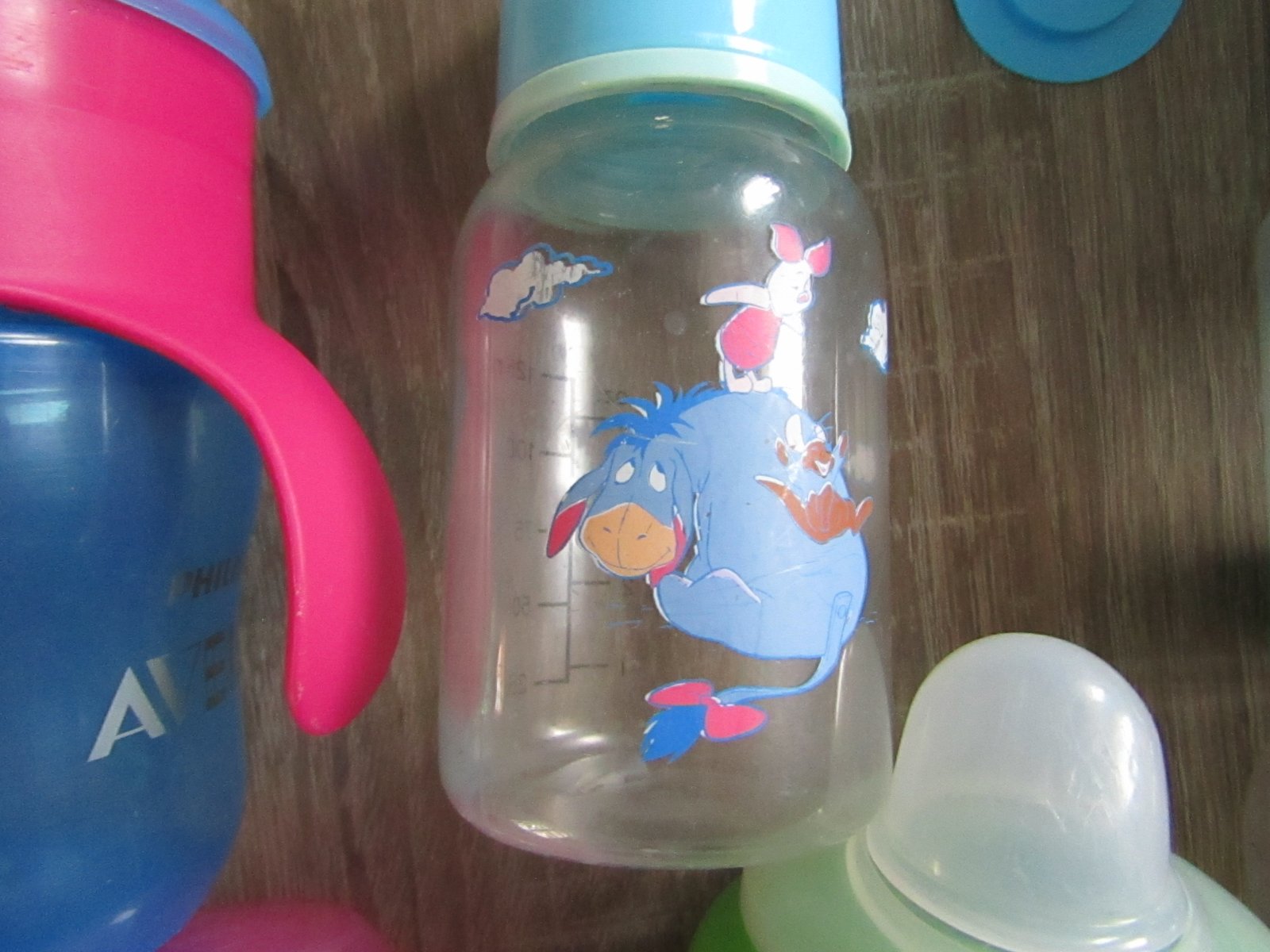 kojenecká láhev-plastová s obrázkem prasátka a oslíka od medvídka Pů-s modrým víčkem-obsah 125 ml-cena 20 kč