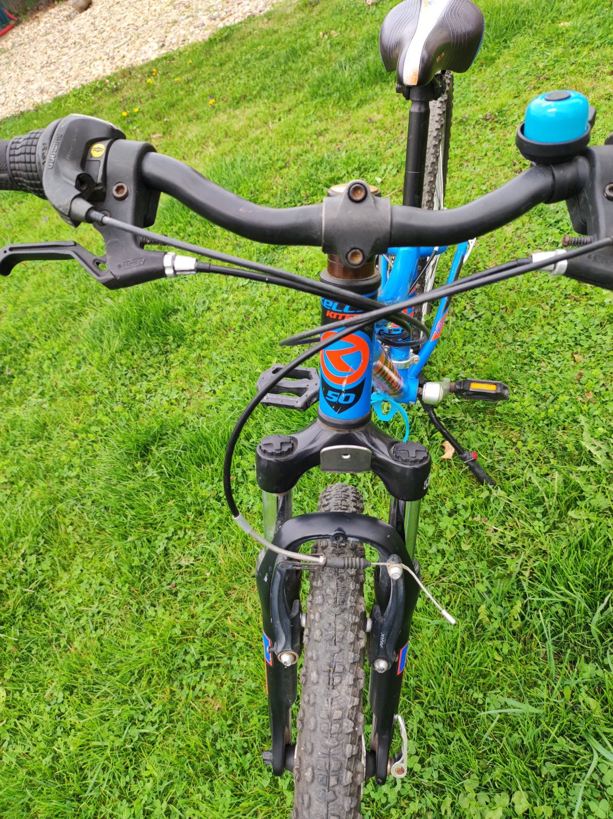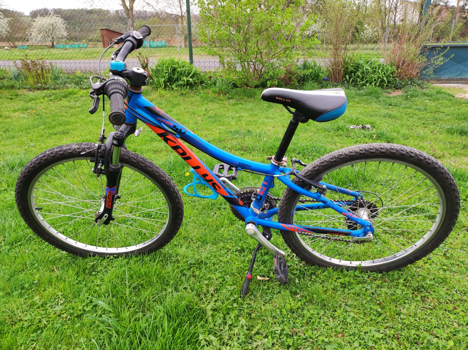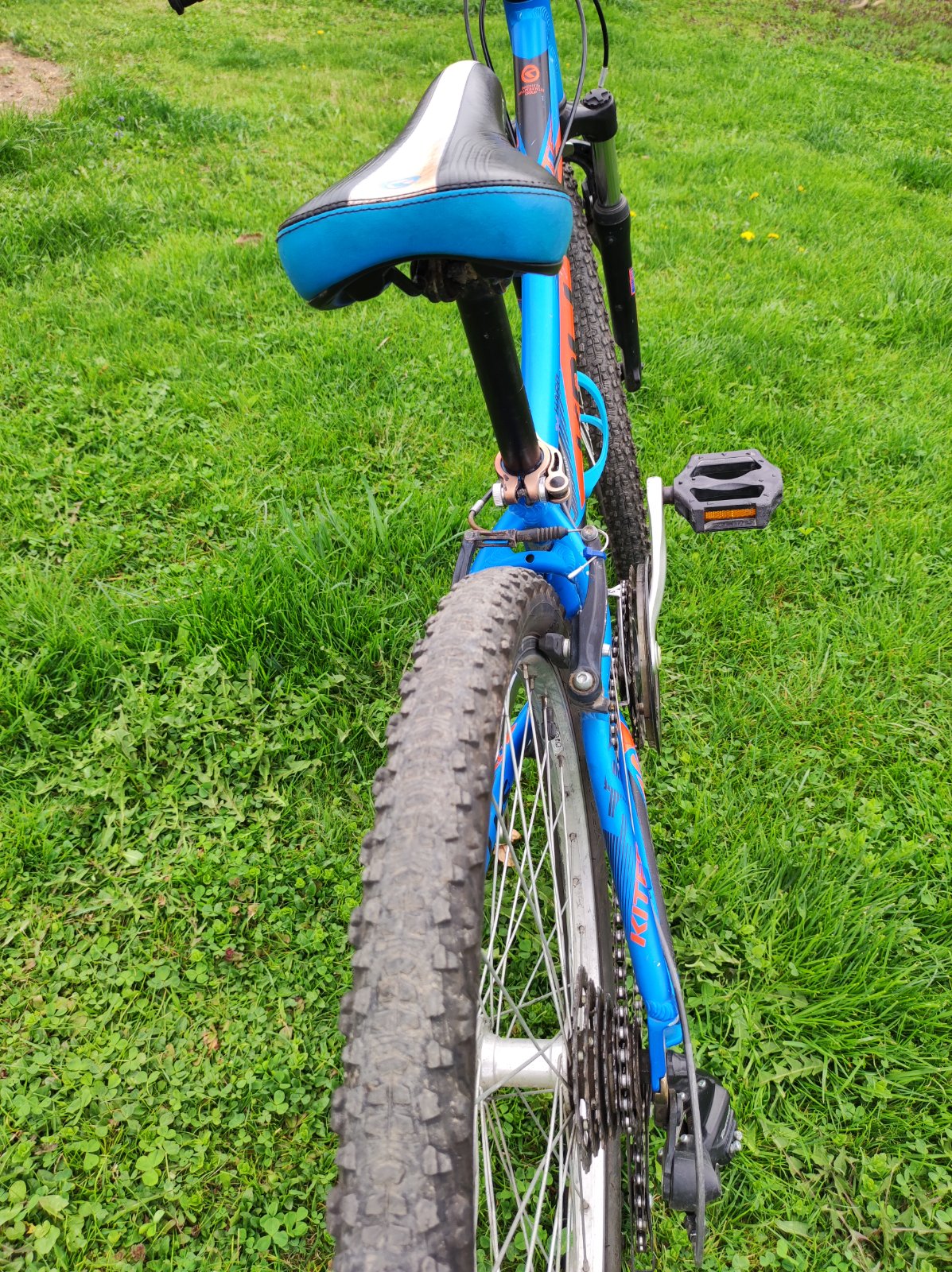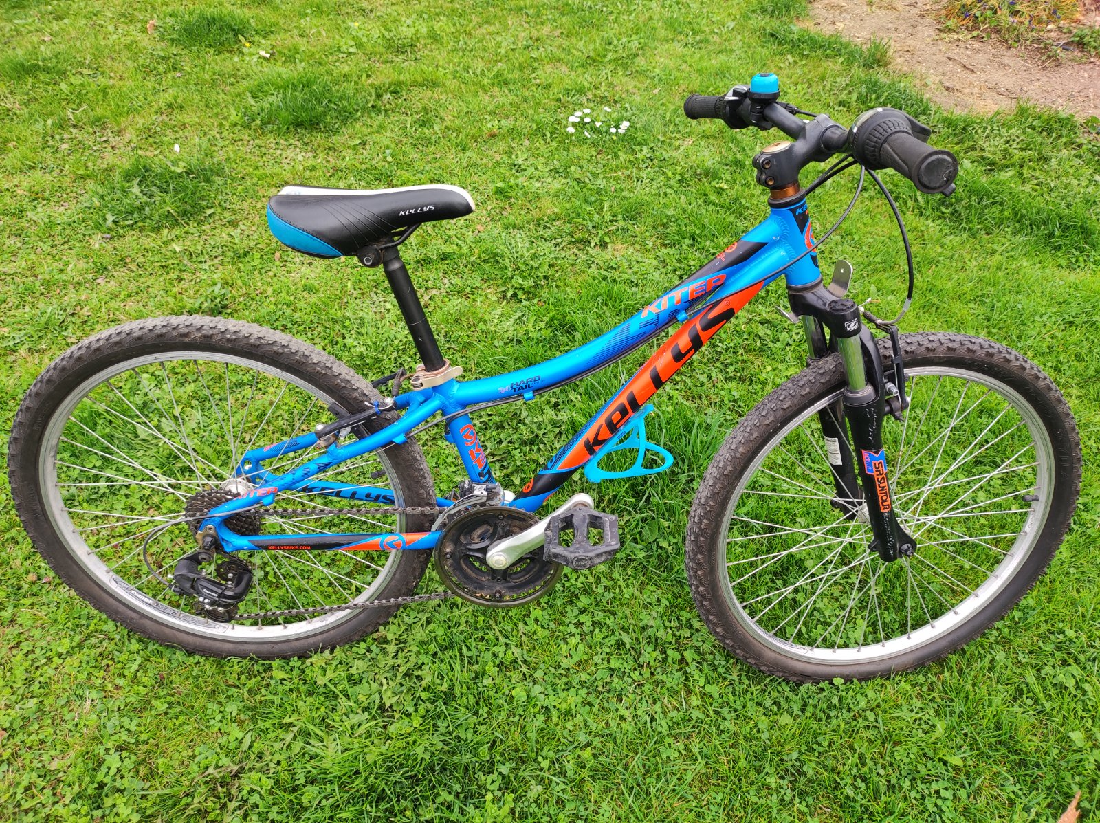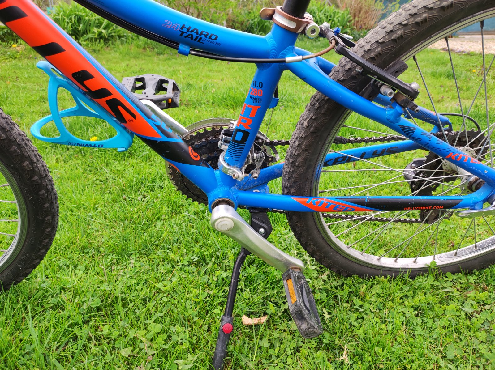 Juniorské kolo zn. Kellys, tip Kiter, vel. kol 24. Přehazovačka Shimano 3x7, otočné ovládání přehazovačky, pákové ráfkové V brzdy, odlehčený rám, zvonek, stojánek, držák na láhev. Kolo je po 2 dětech, mezi kterými prošlo komplet servisem. Běžné známky používání, drobné oděrky na rámu, pedálech a řidítkách, technicky ve velmi dobrém stavu. Jedinou nevýhodou jsou od slunička zakalená a popraskaná okénka ovladačů rychlosti na řidítkách (tzn. člověk nevidí dobře číslo rychlosti, na kterou má zařazeno), ale cyklista řadí citem a po paměti (pamatuje si, zda k sobě přidává nebo ubírá). PC byla 8000 Kč.