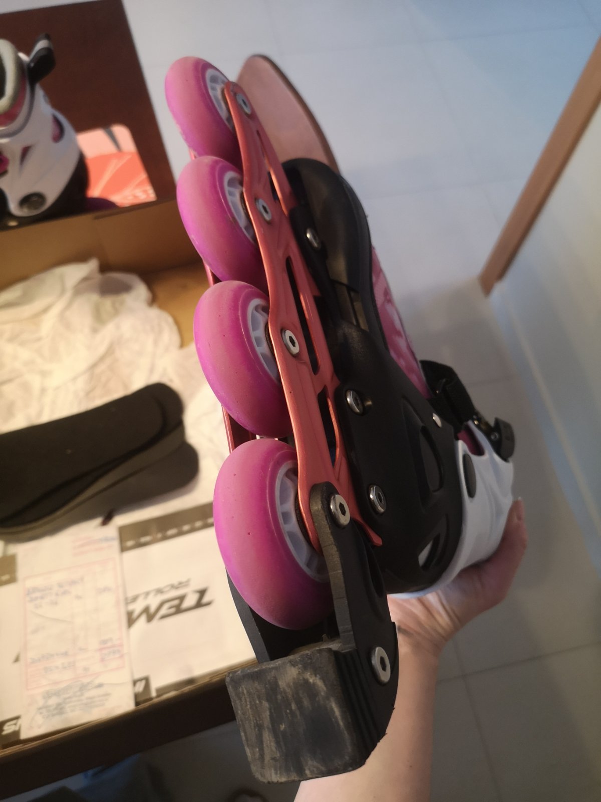 Dívčí kolečkové brusle Oxelo. Nastavitelná velikost 32-34.Hodně znát používání-kosmetické vady