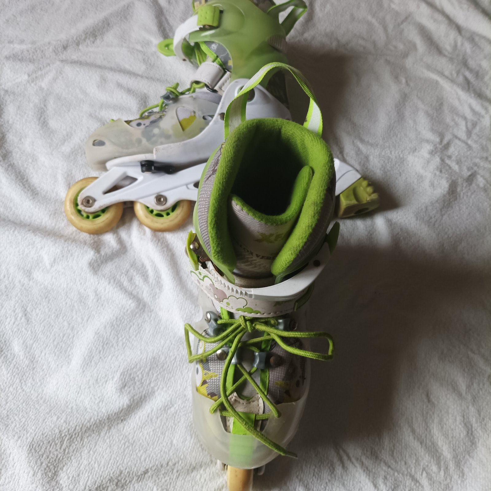 Prodám kolečkové brusle po 1 dítěti,používané,nijak nezničené,používaní je znát na brzdě a kolečkách,nejsou ale sjeté.