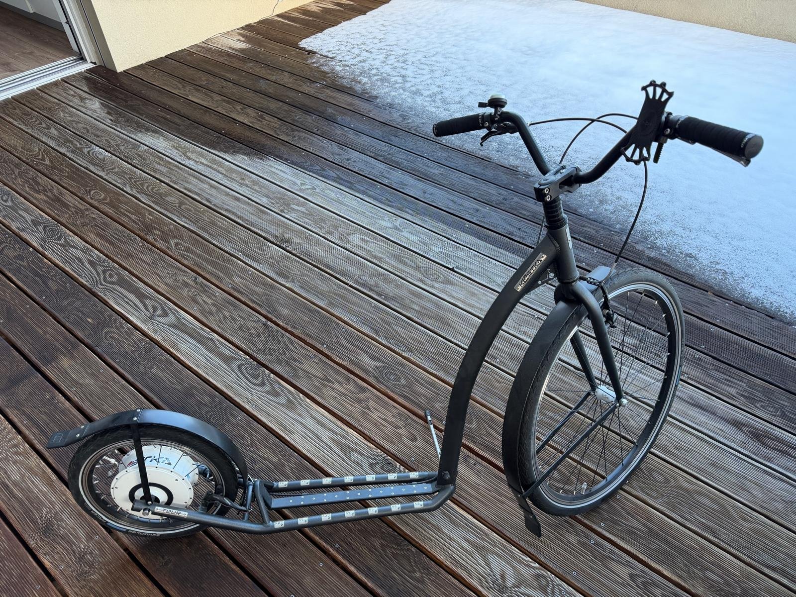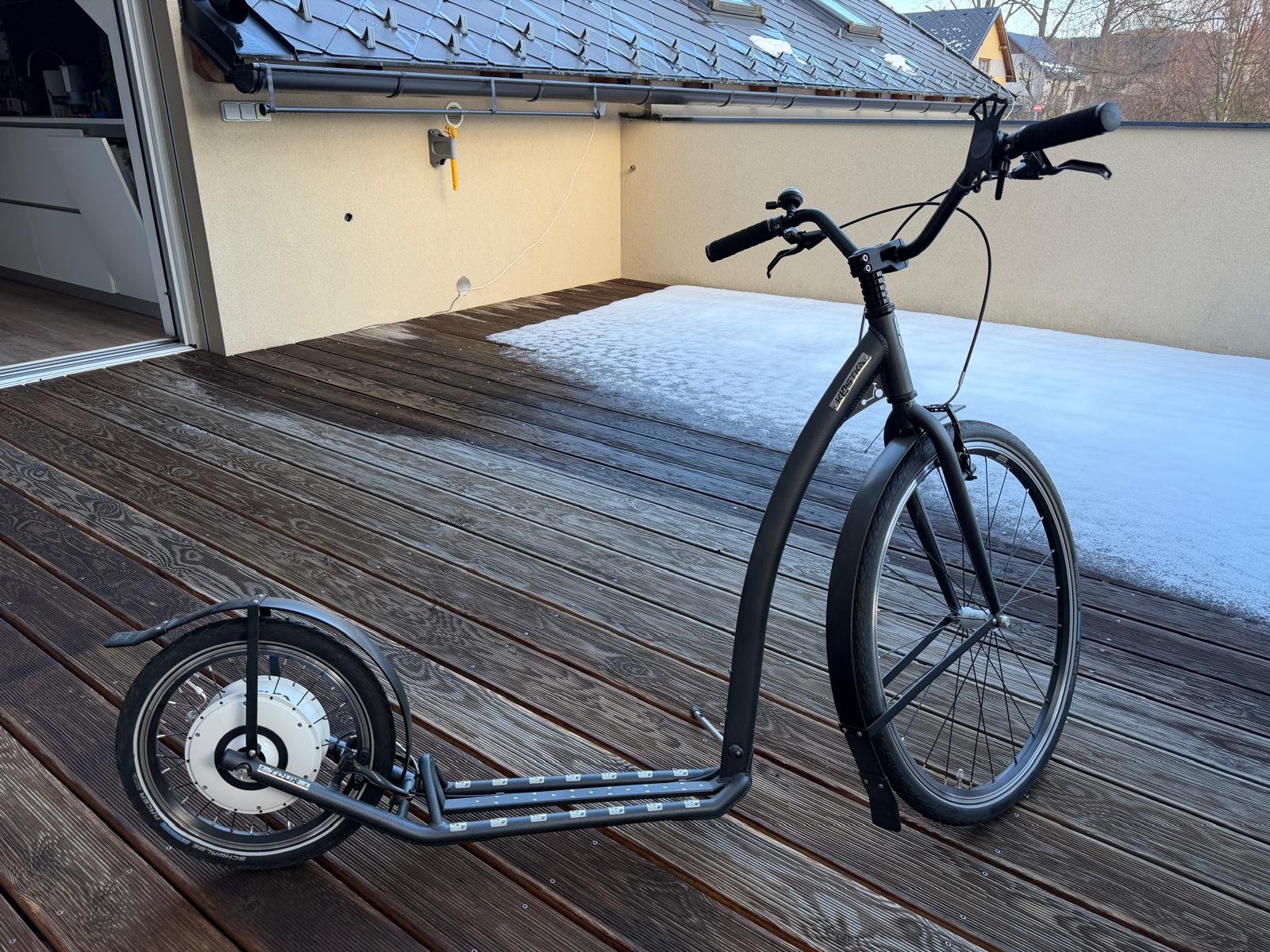 Prodám elektrokoloběžku Kostka e-tour max. Kola 26/16 palců, koloběžka má najeto cca 40 km. Koloběžka umí jet sama do 5km/h. Je to tedy koloběžka pro lidi co chtěli normálně jezdit a chtějí jen přípomoc na delší cesty, kde motor potom pomáhá do rychlosti 25km/h. Ke koloběžce přidám brašnu, blatníky a zvonek.