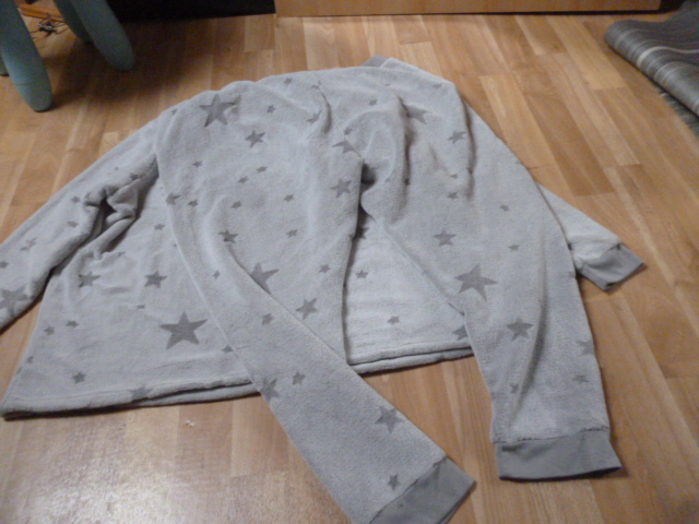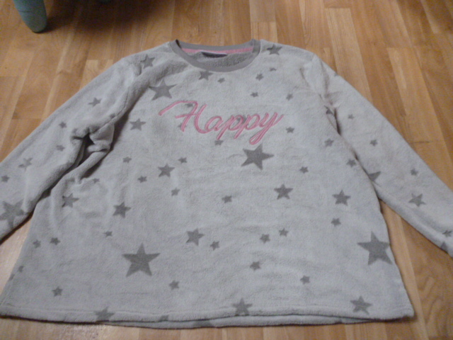 nošený, pěkný, super na spaní i jako domácí komplet. délka mikiny je 70 cm, rukáv od krku je 77 cm, průramky 2x71 cm, kalhoty dlouhé 100 cm, pas od 2x49-76 cm, nohavice u rozkroku 2x41 cm, vnitřní nohavice je 75 cm, psaná vel. 2XL zn. Janina...nutno vyprat