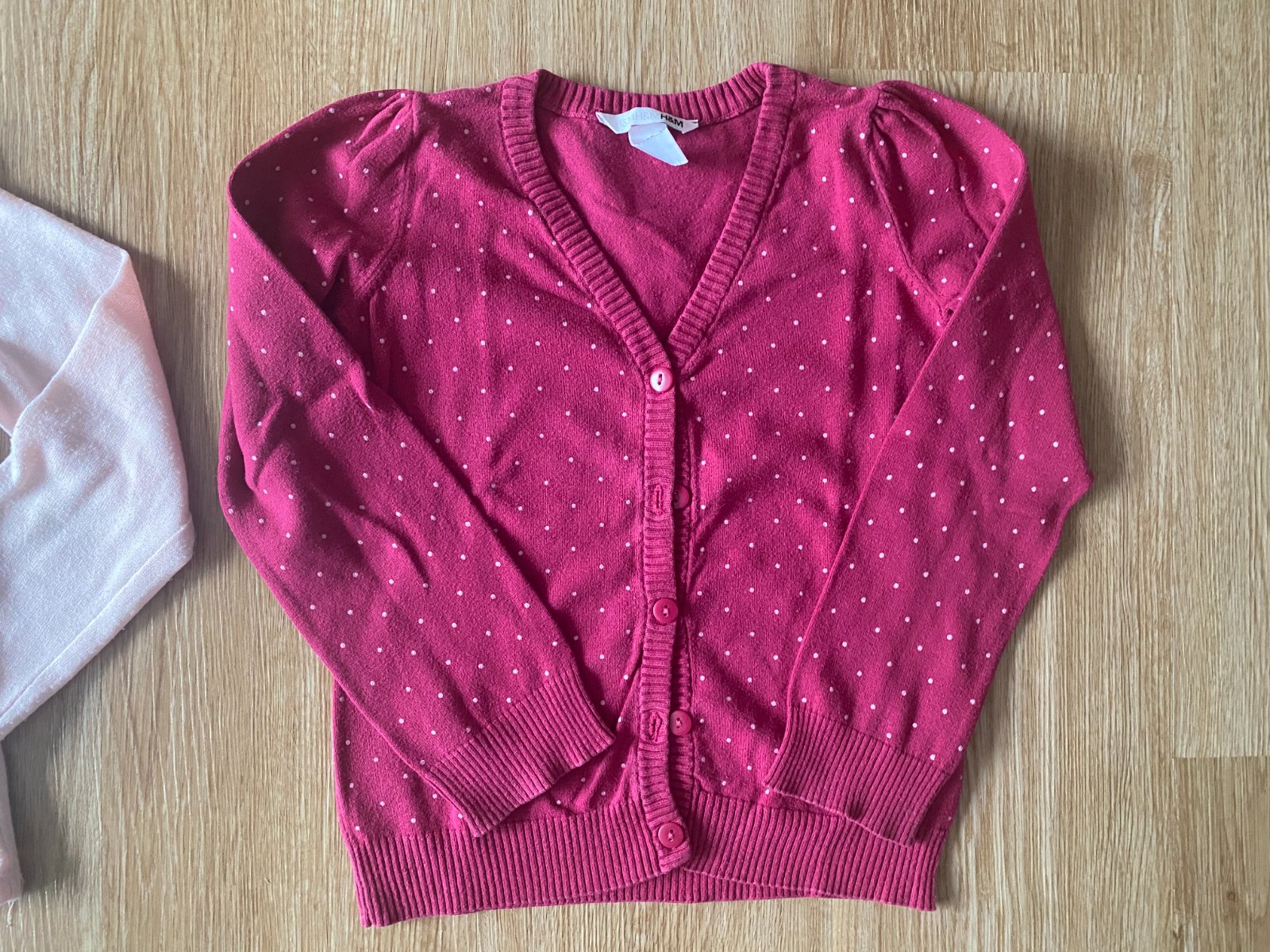 Tmavě růžový propínací svetřík s puntíky - H&M, vel. 110/116, malý flíček ca 2mm (detailně zkoumáno)