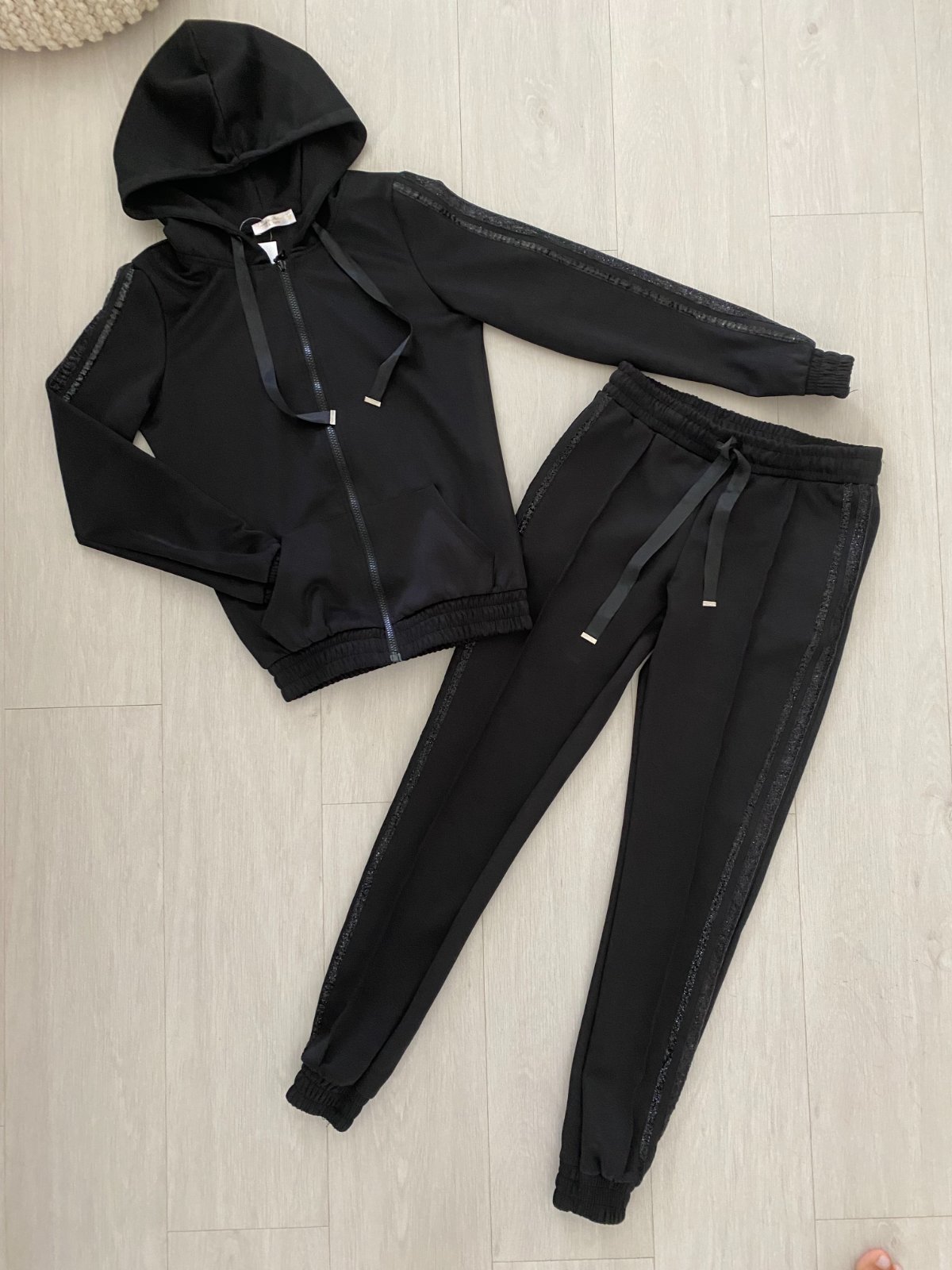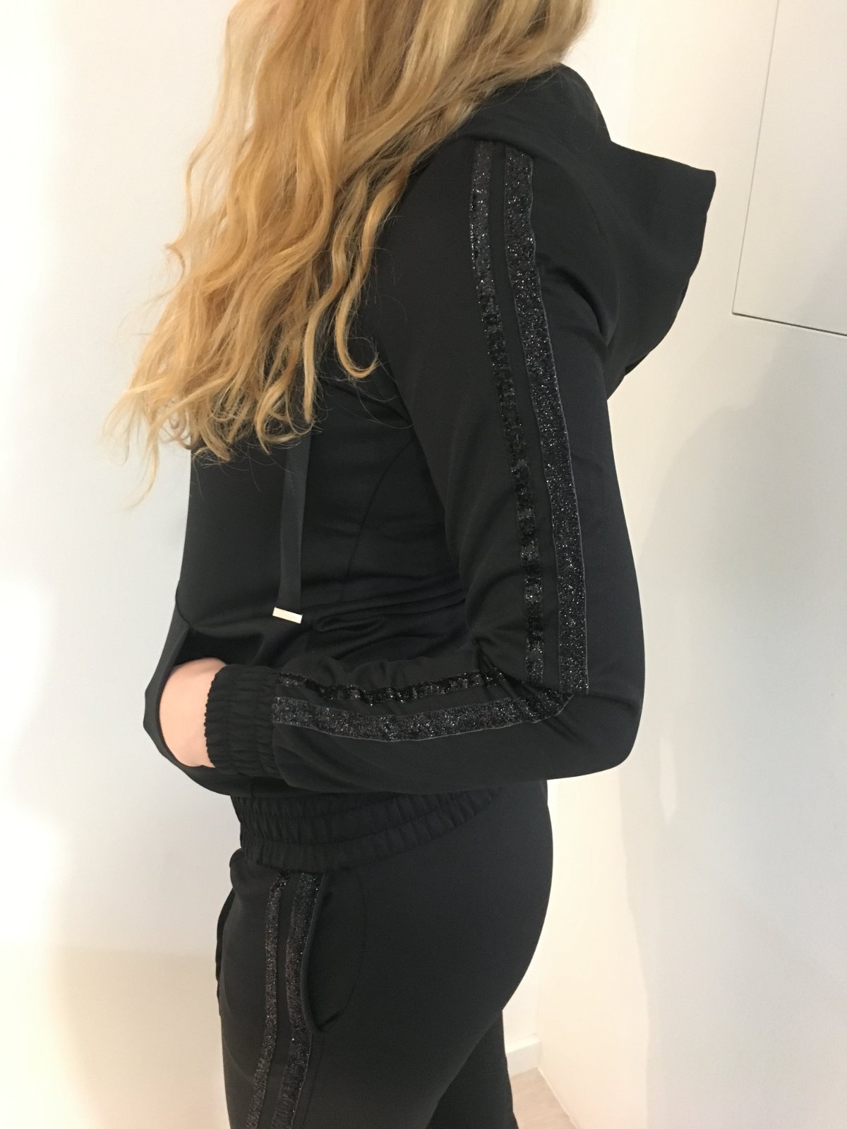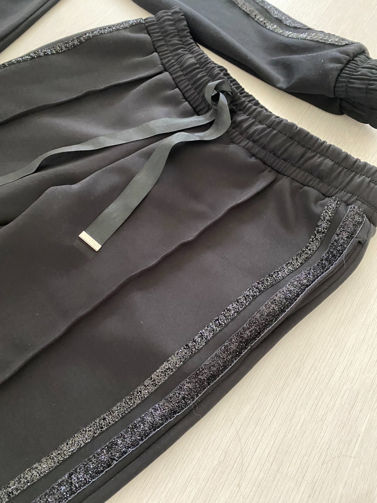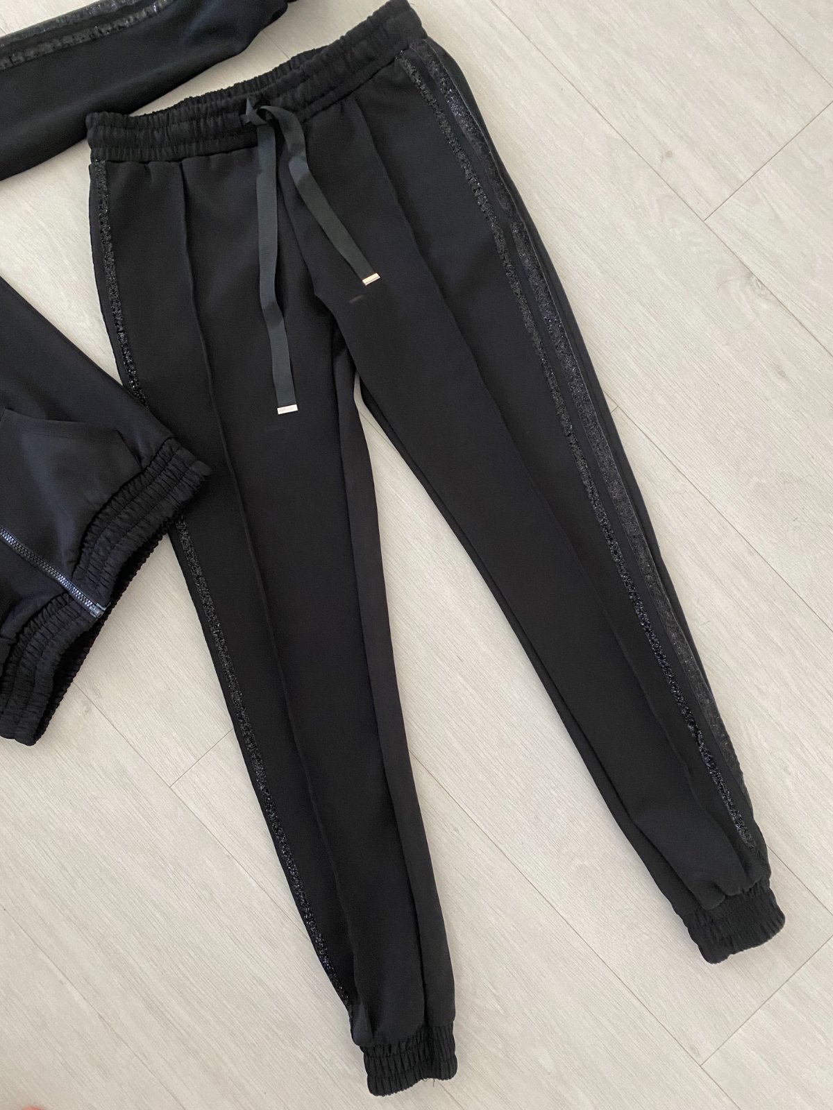 Třpytivé pruhy na rukávech i na boku tepláků.