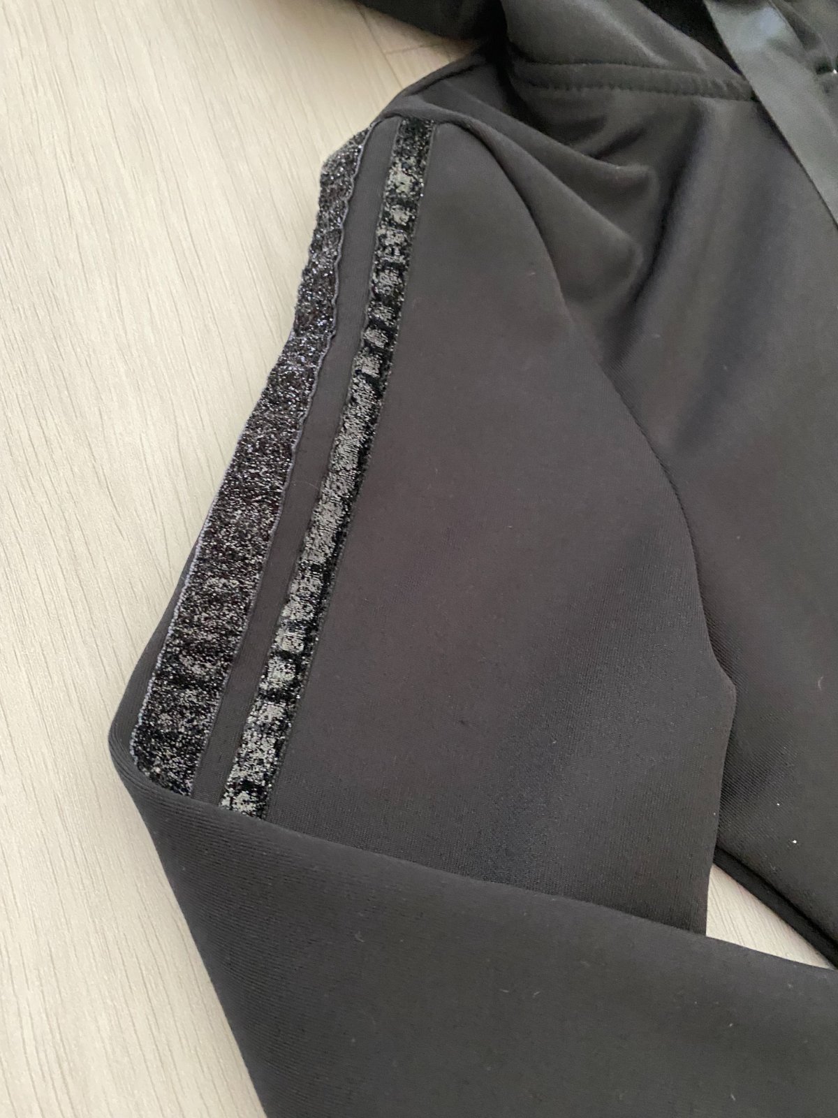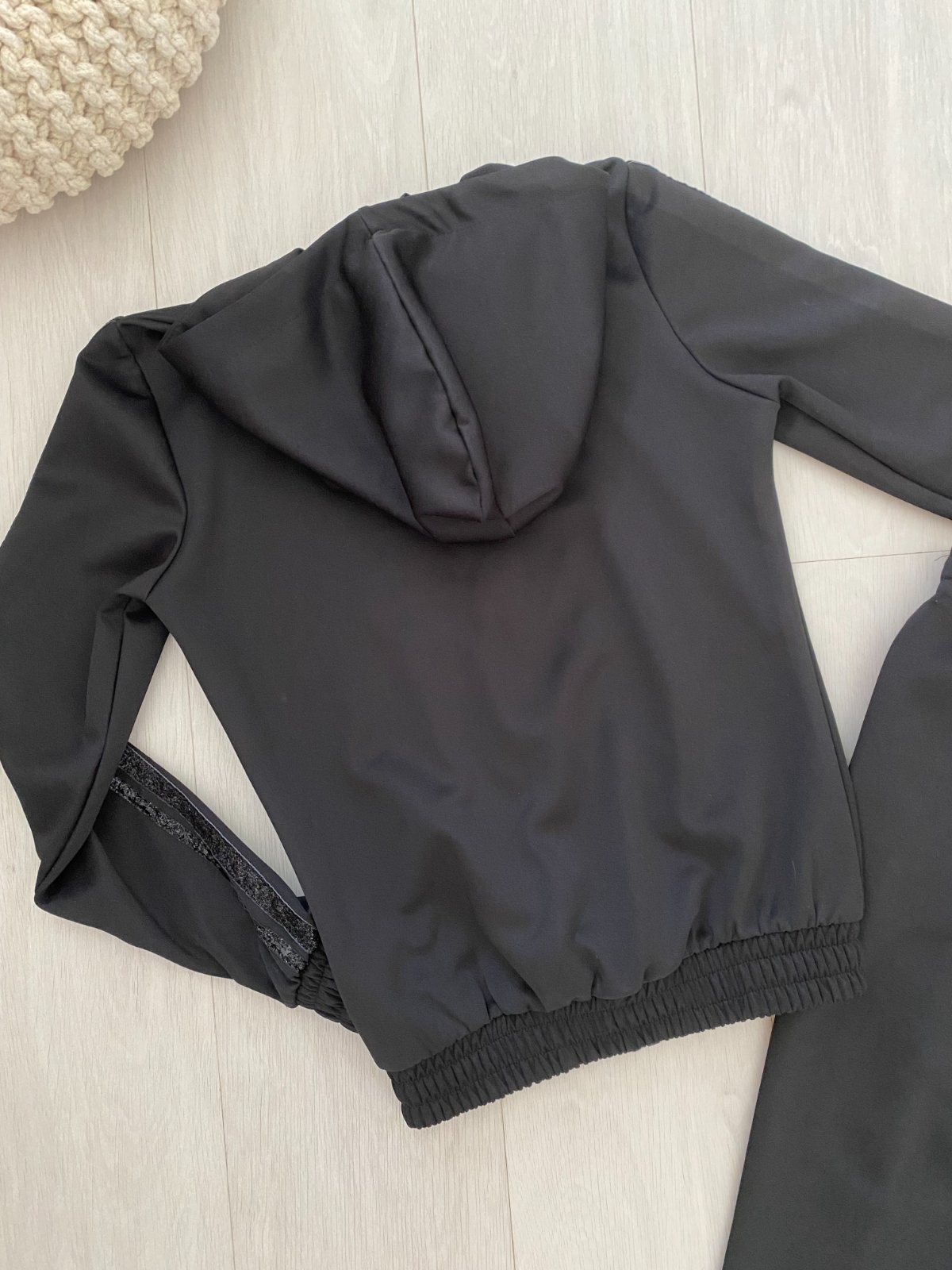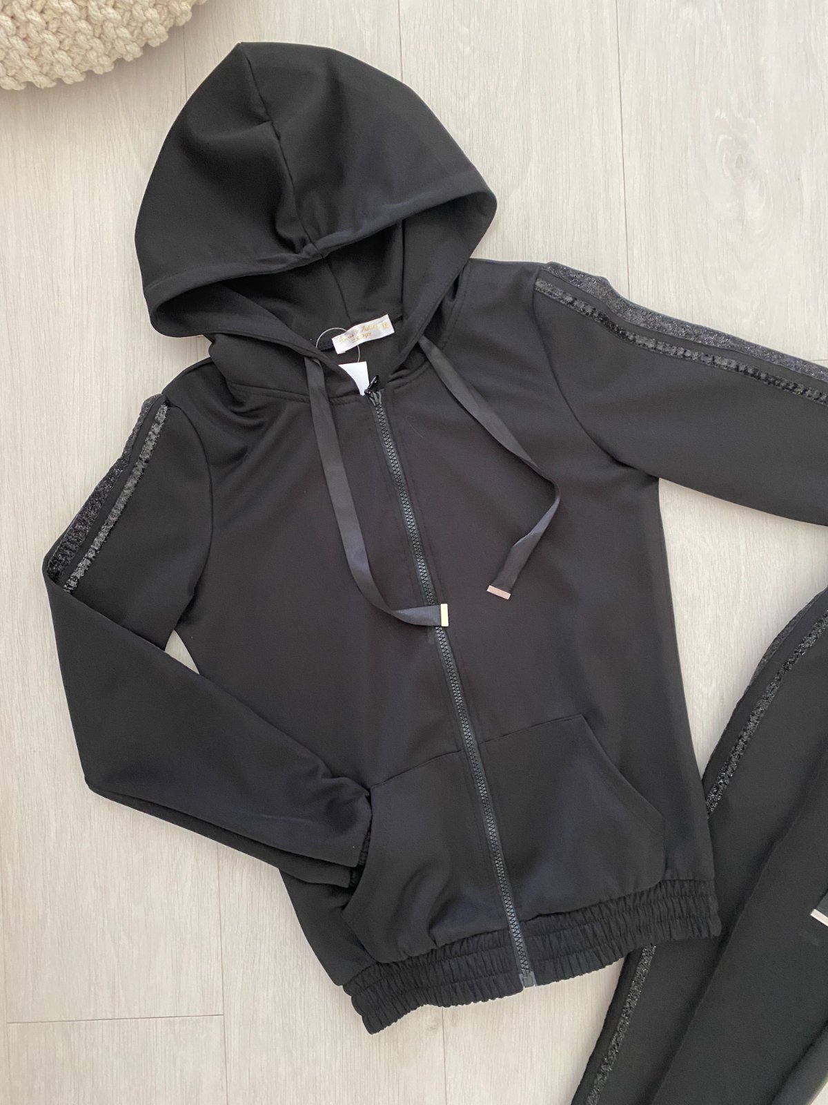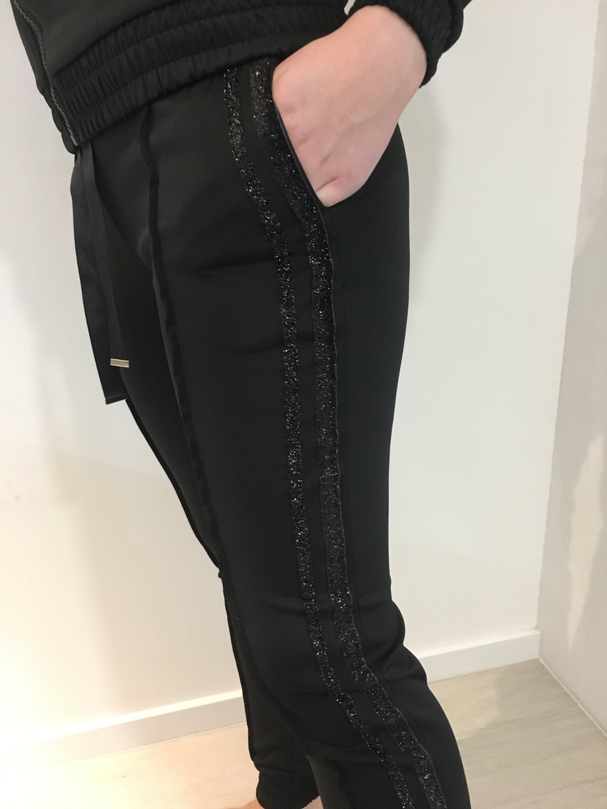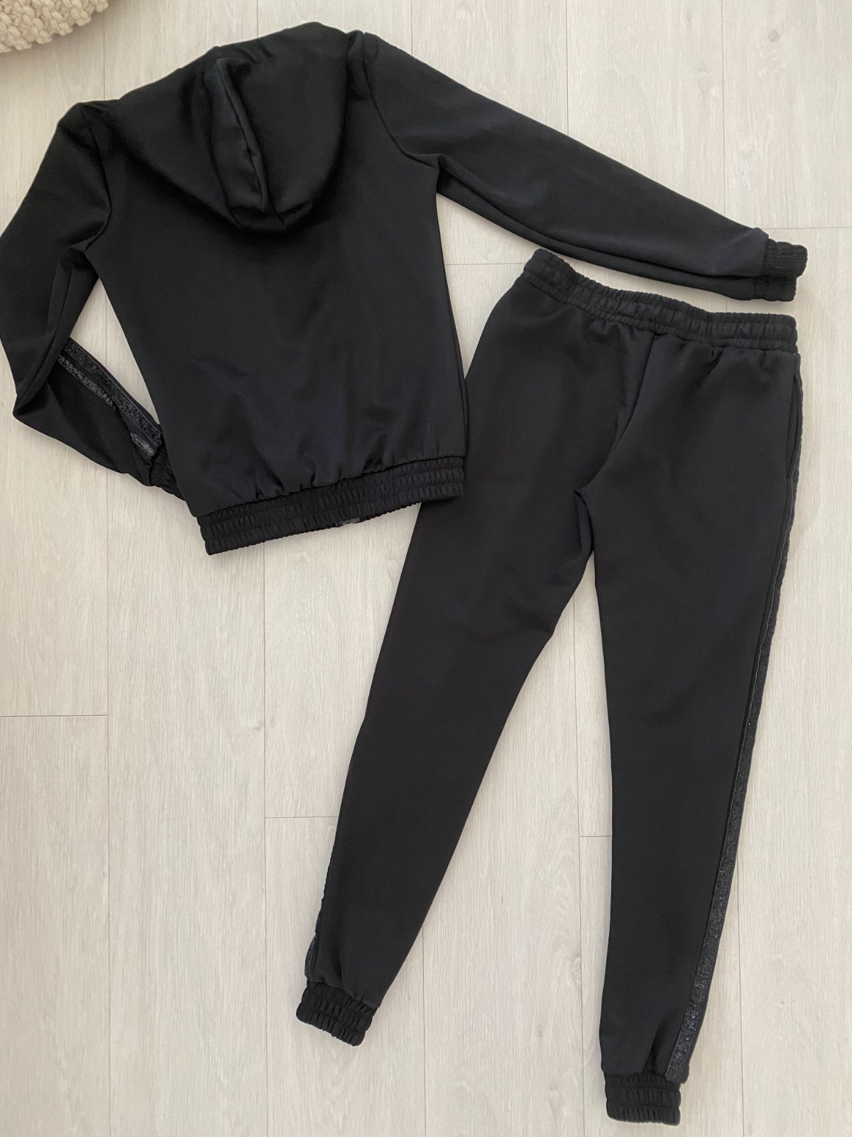 Třpytivé pruhy na rukávech i na boku tepláků.
