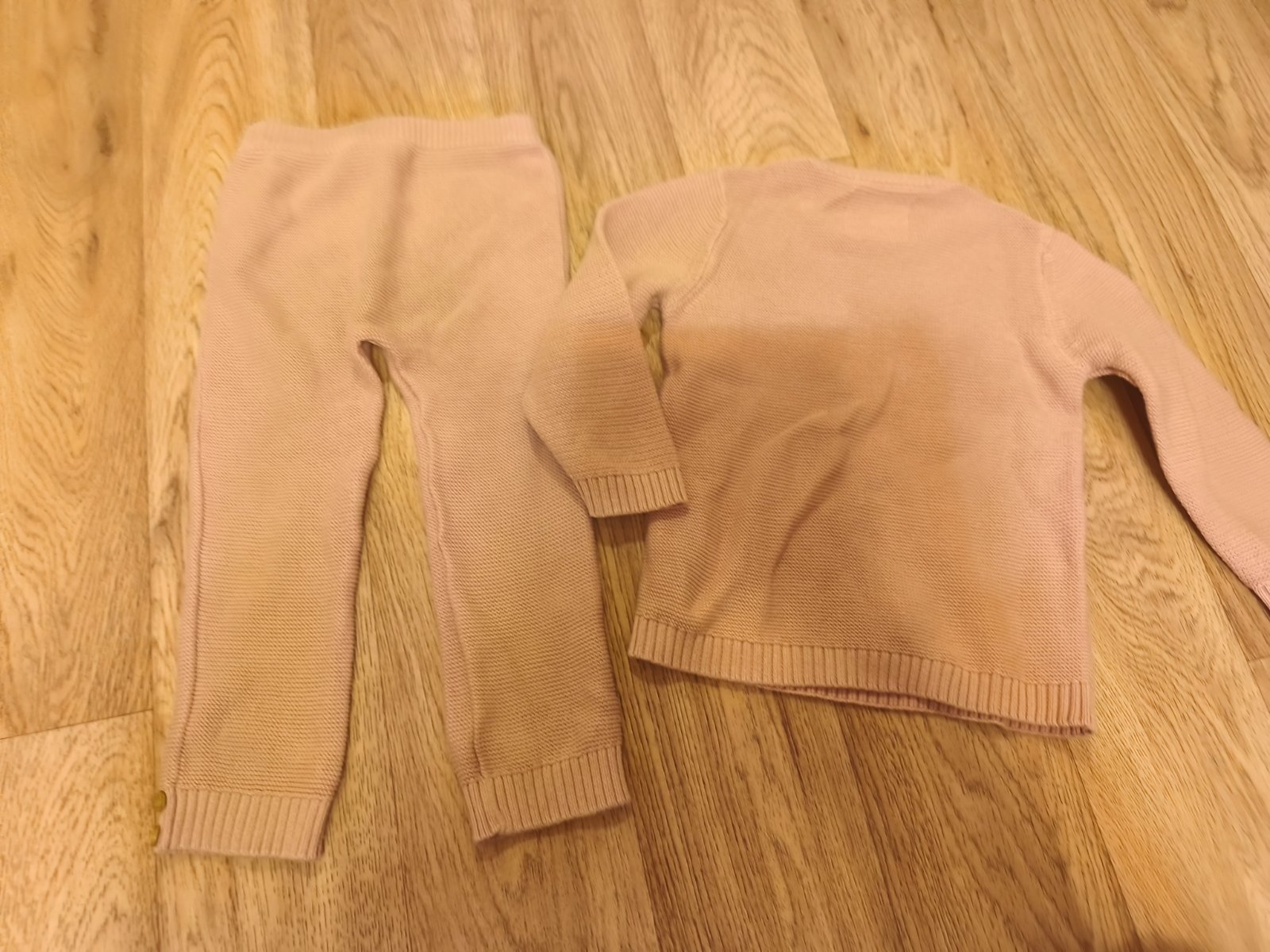 Pletený komplet s králíčky vel 86. 100% bavlna. Běžné známky praní.