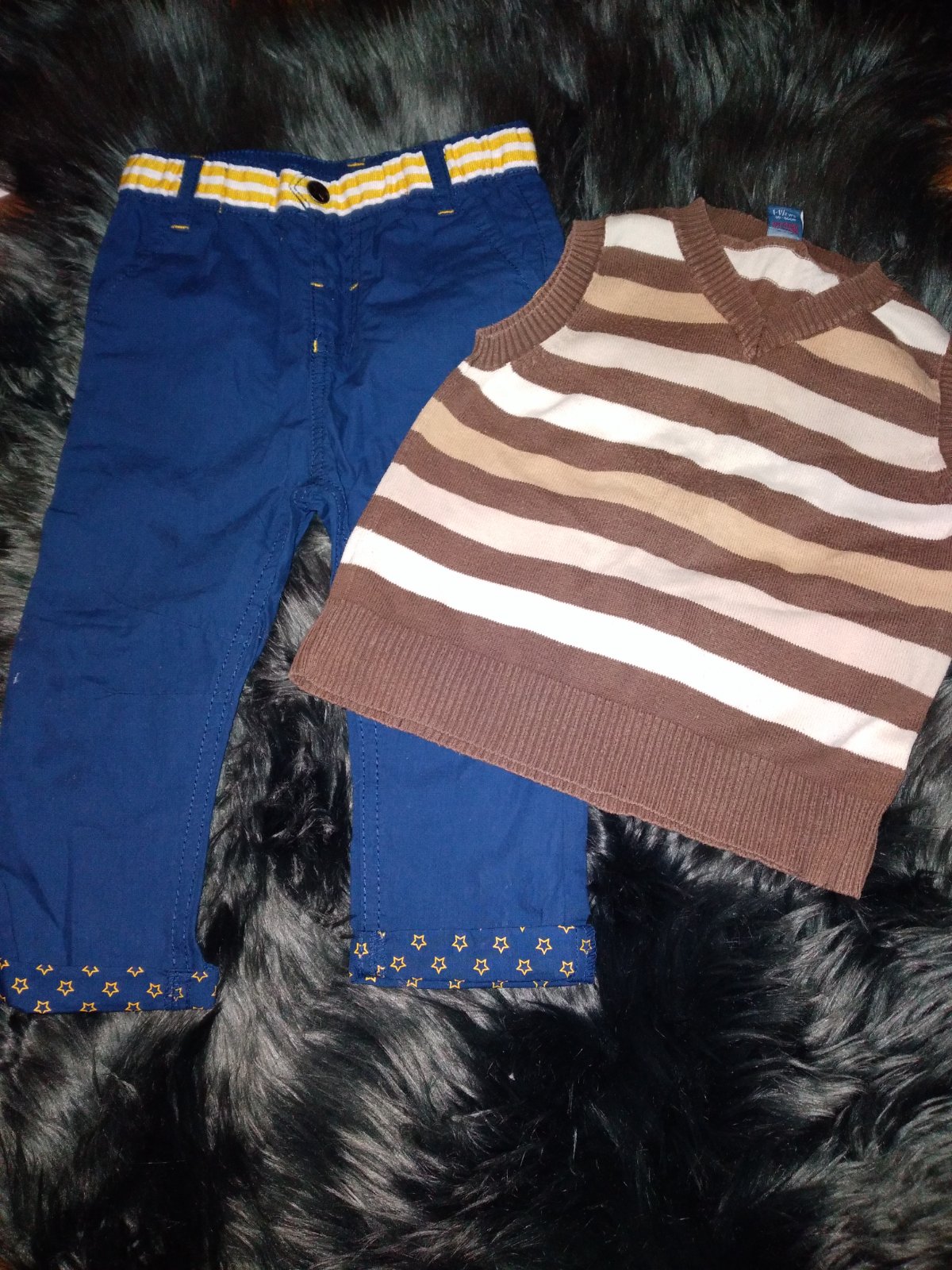 Prodám set v moc pěkném stavu. Kalhoty jsou nové, značka: Ergee, velikost: 80 - 86, složení: 100 % bavlna - plátno, vesta je používaná, značka: TU, velikost: 80 - 86, složení: 100 % bavlna, má počínající prací chloupek, vyfoceno, daruji ke kalhotům zdarma. Cena za set je 79 Kč + poštovné. Krabice č. 14.