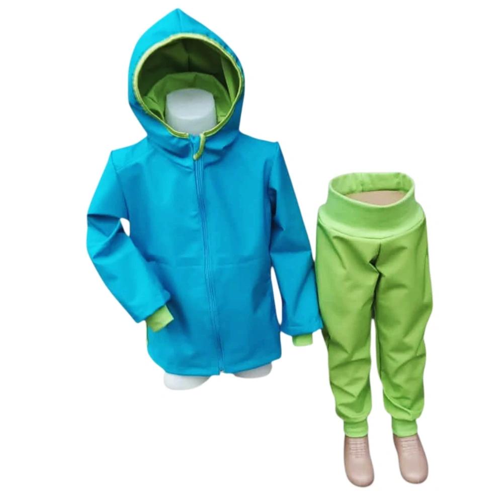 Praktický zeleno-modrý komplet – bunda a kalhoty z nezatepleného softshellu s membránou.
