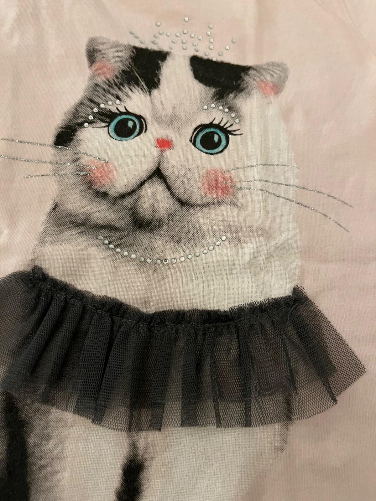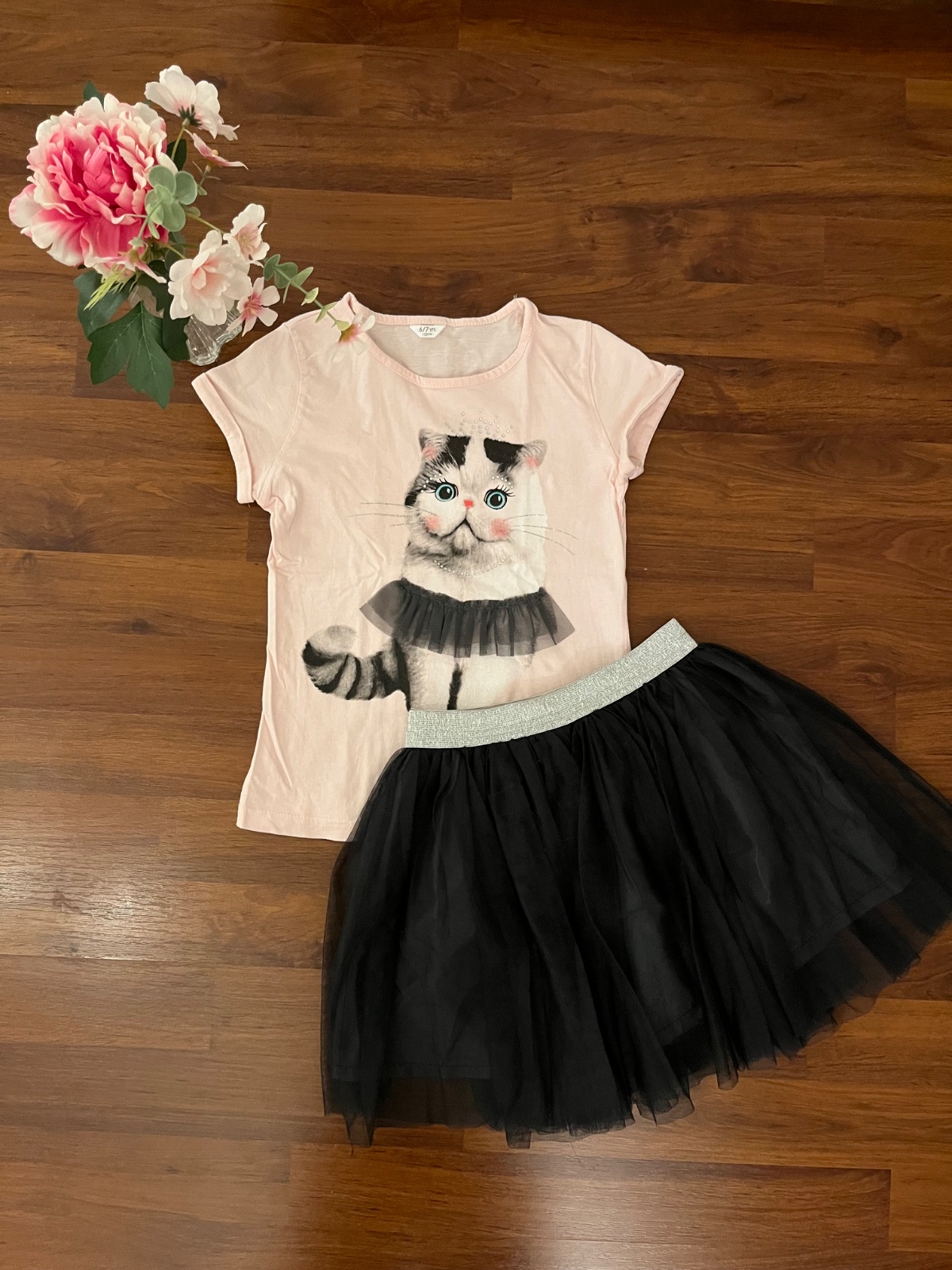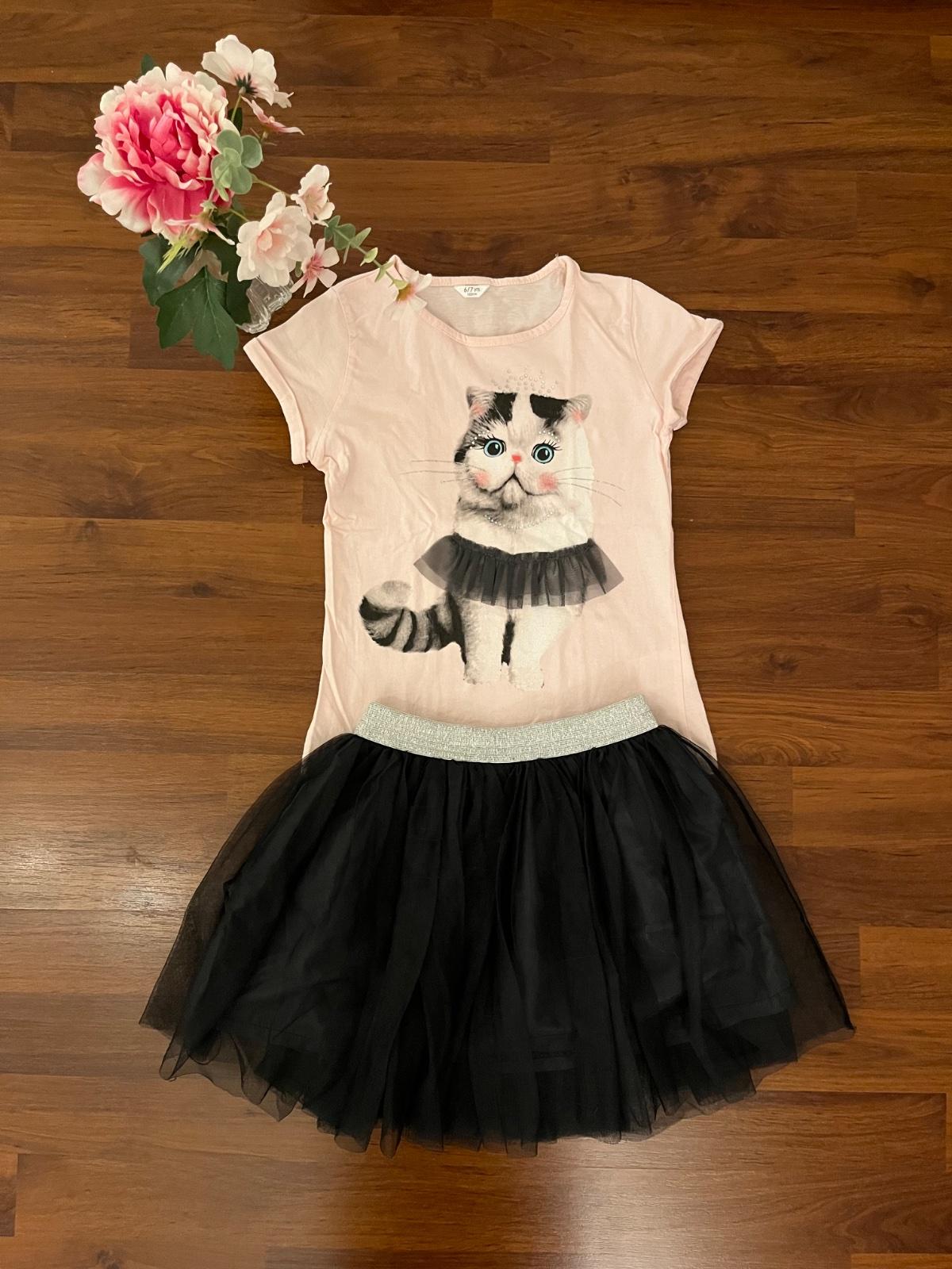 Tričko s kočičkou v sukýnce a kamínky, 2x oblečené k sukýnce.