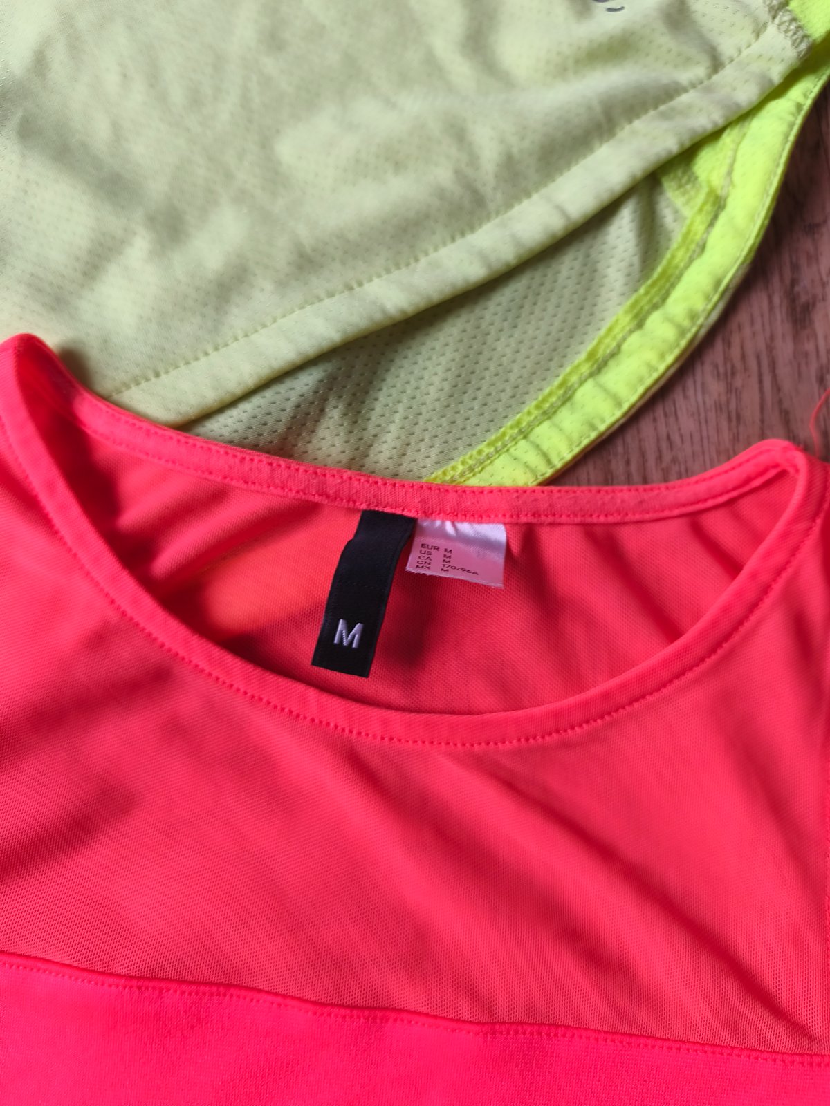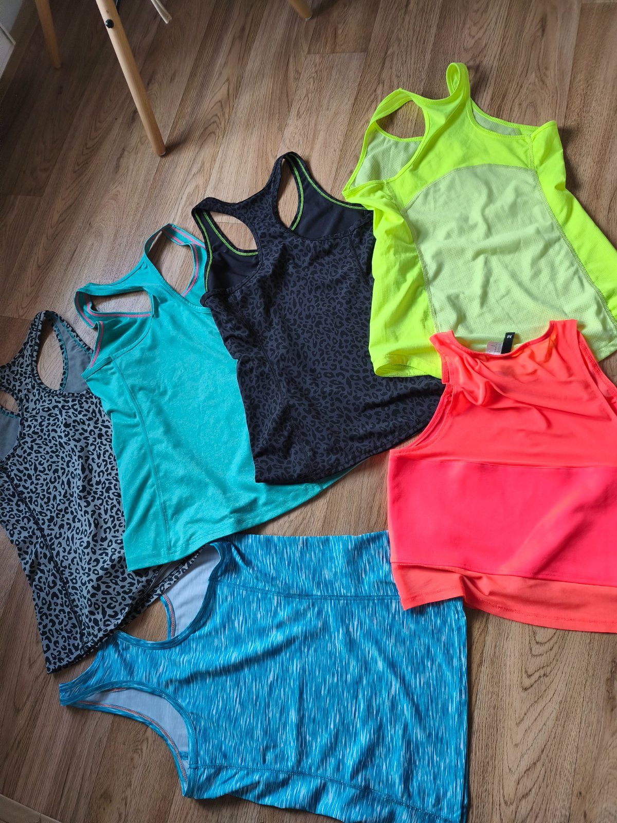 6krát funkční top H&M, některé nošeny víckrát, jiné naopak jen párkrát, vše S, neon žlutý myslím XS, ale je stejný, neon lososový M, též možno nosit i na vel S. Kus 150, uvedená cena celkem.