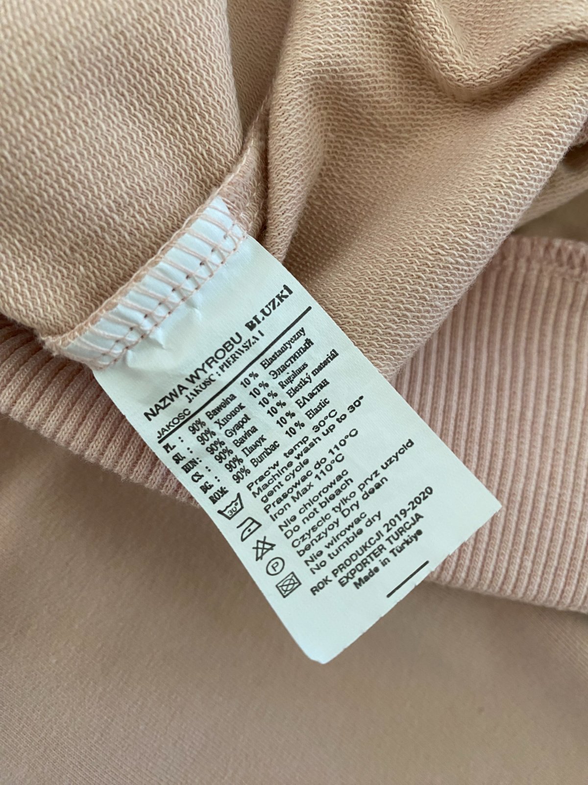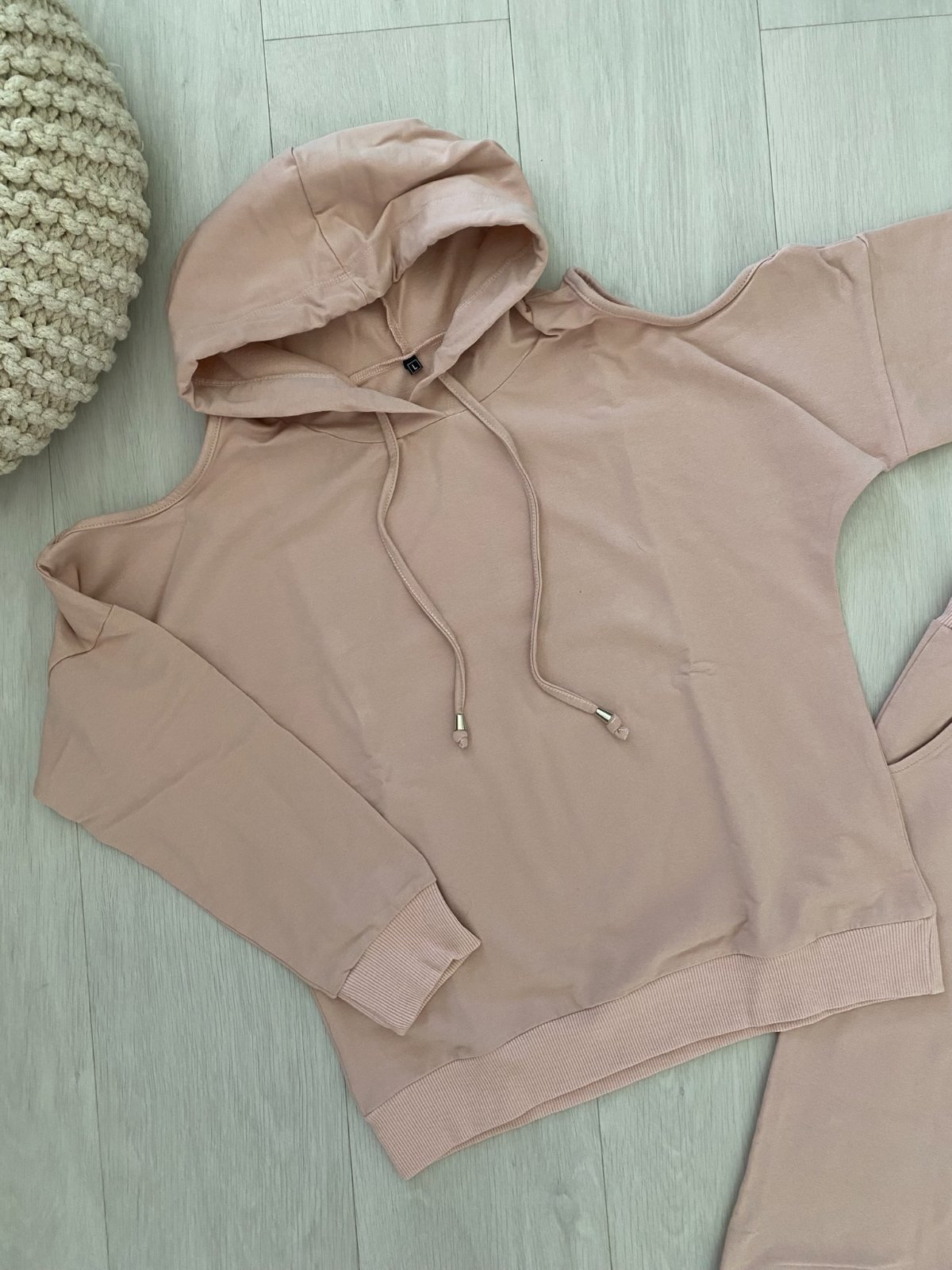 Mikina s kapucí, na ramenech s průstřihy; délka 62 cm, šířka přes prsa 50 cm, netopýří rukáv.
