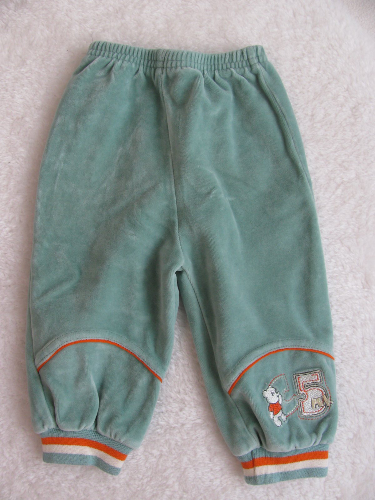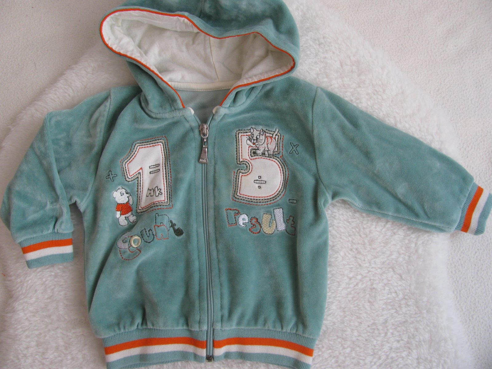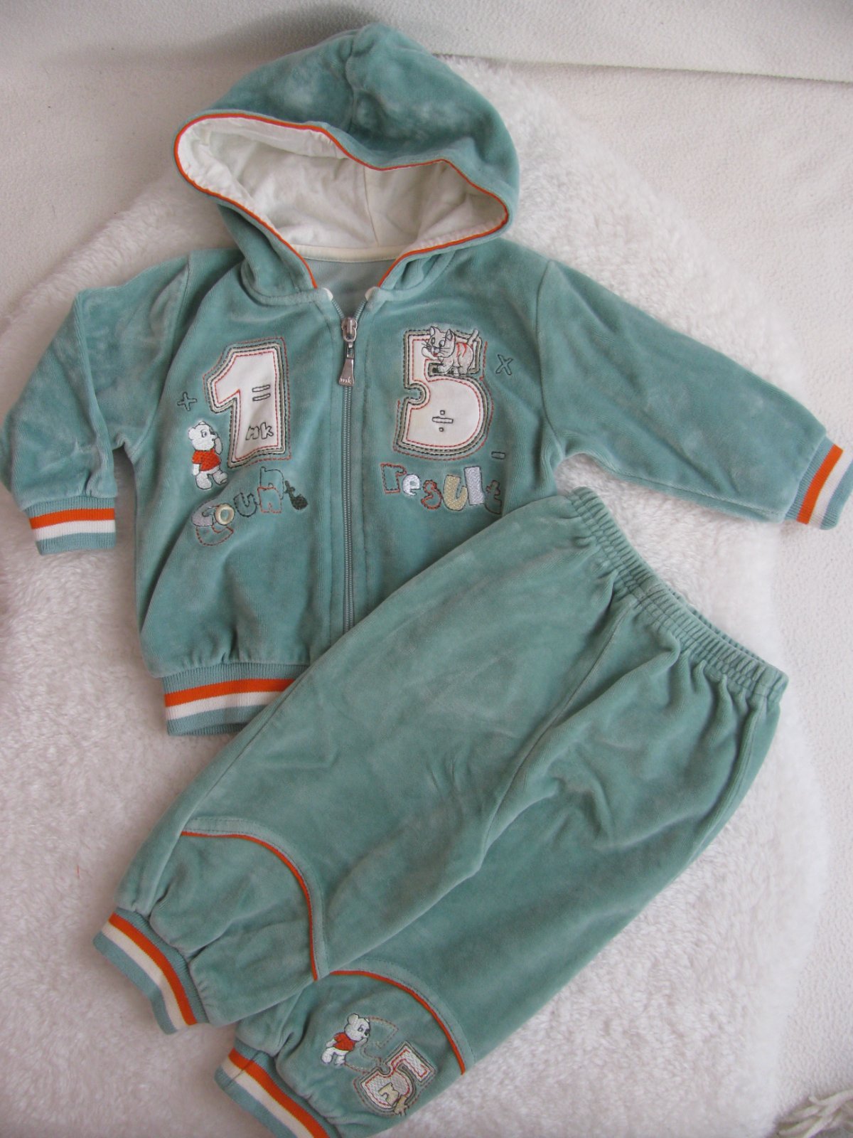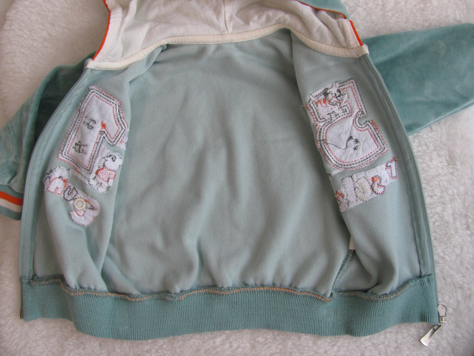 Krásná velurová souprava, barva mátová, zap.na zip, pružné lemy, krásné našité a vyšité obrázky, 76% bavlna, 24% polyester.