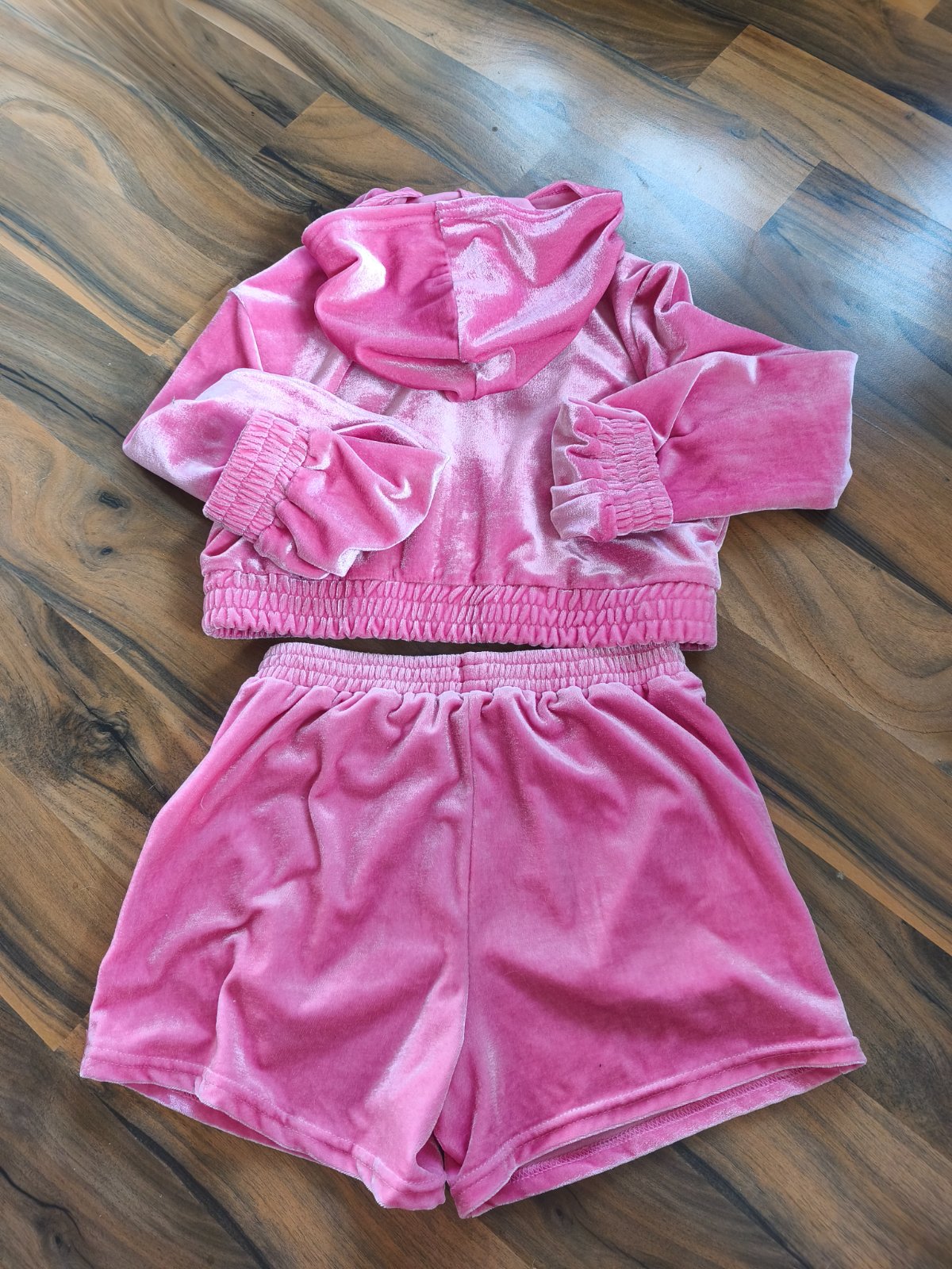 Crop komplet, lesklá sametová krátká mikina a šortky. 2krát vzatá, kraťasy lehce povolené v rozkroku. Vel 152, sedí XXS/XS, pro drobnou postavu.