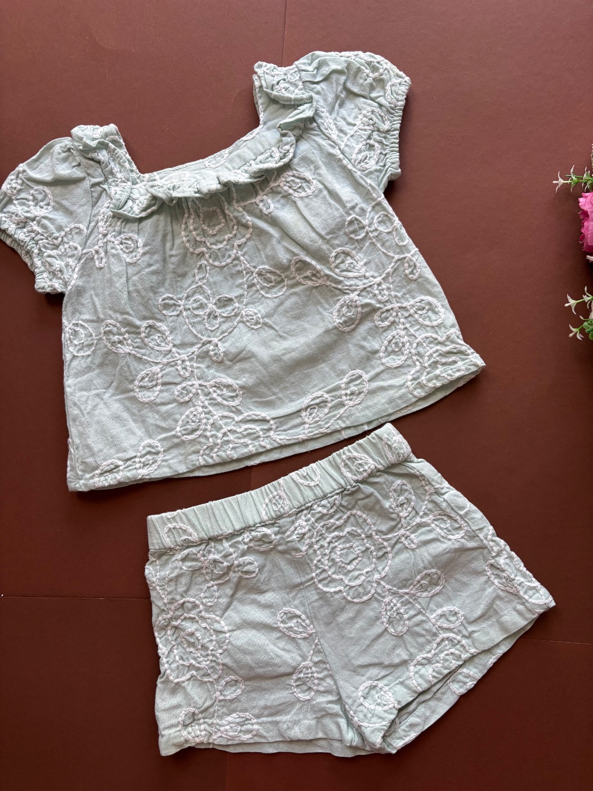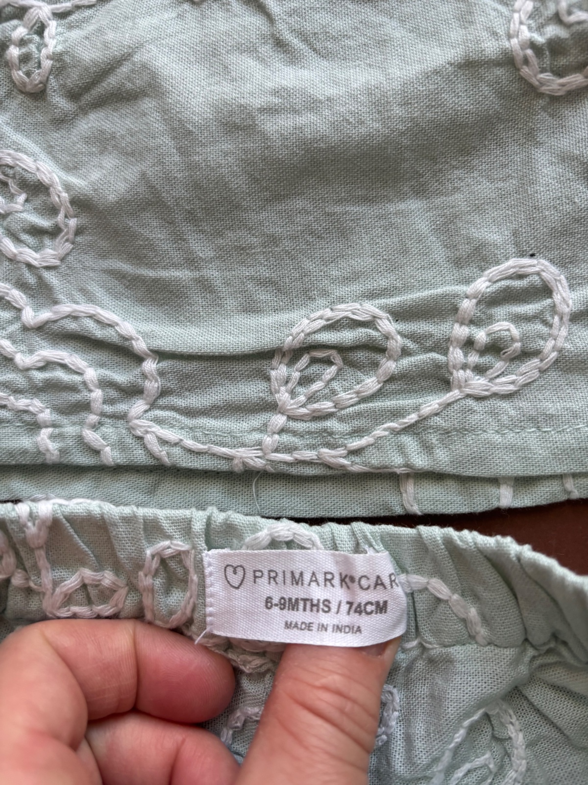 Krásný letní komplet bledě zelený - v.6/9 měs.