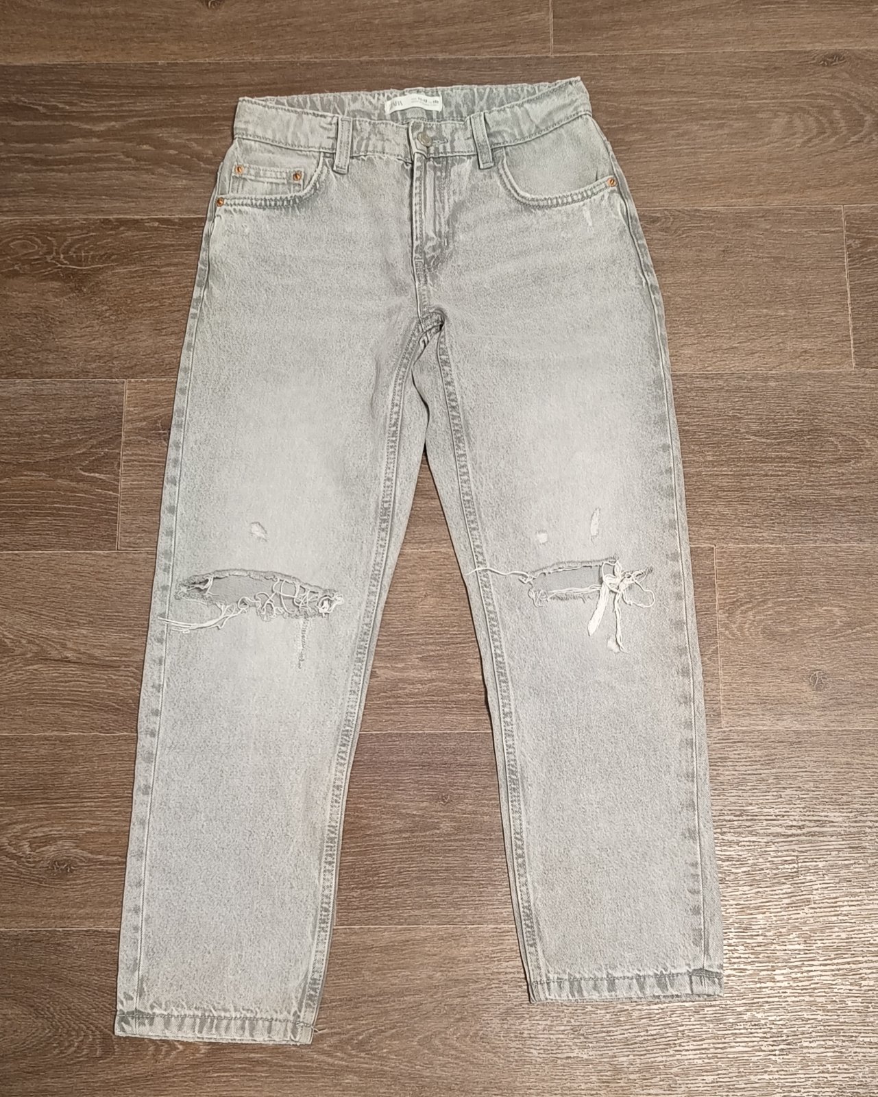 Kupované nové, širší střih, nošené párkrát. Syn se bohužel rychle vytáhnul 😔 celková délka 88 cm. V pase regulace. Barva perlově šedá.