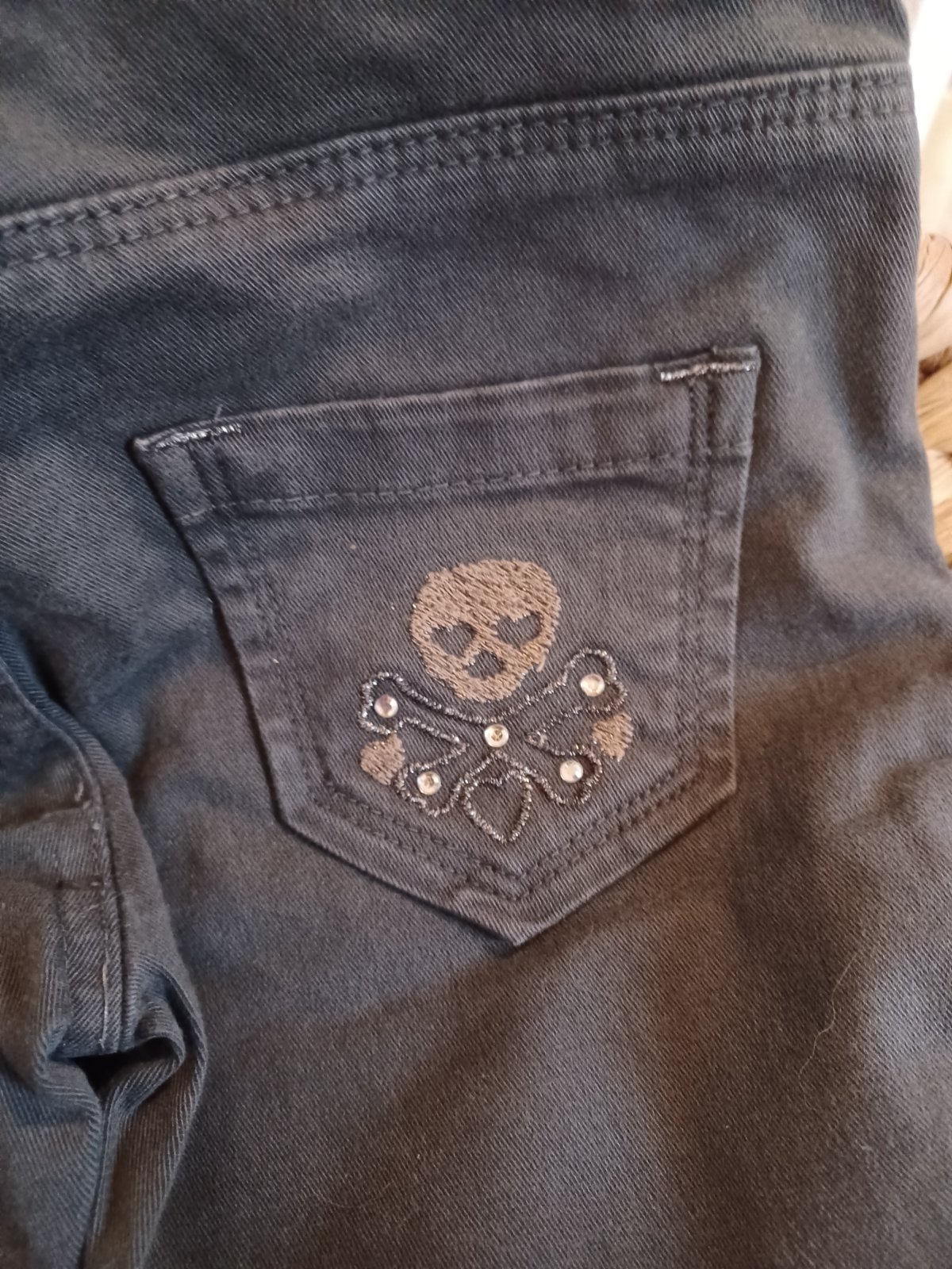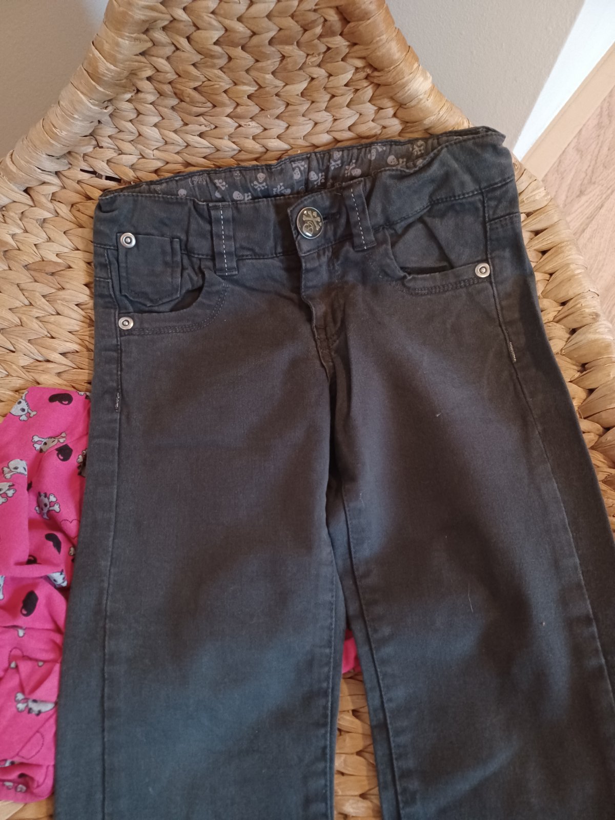 Pěkné šedé džíny Zara rovného střihu s lebkama vel.104 (vydržely i při 110) + zdarma lebková tunika H&M 98, ale vydrží mnohem dýl jako top.
