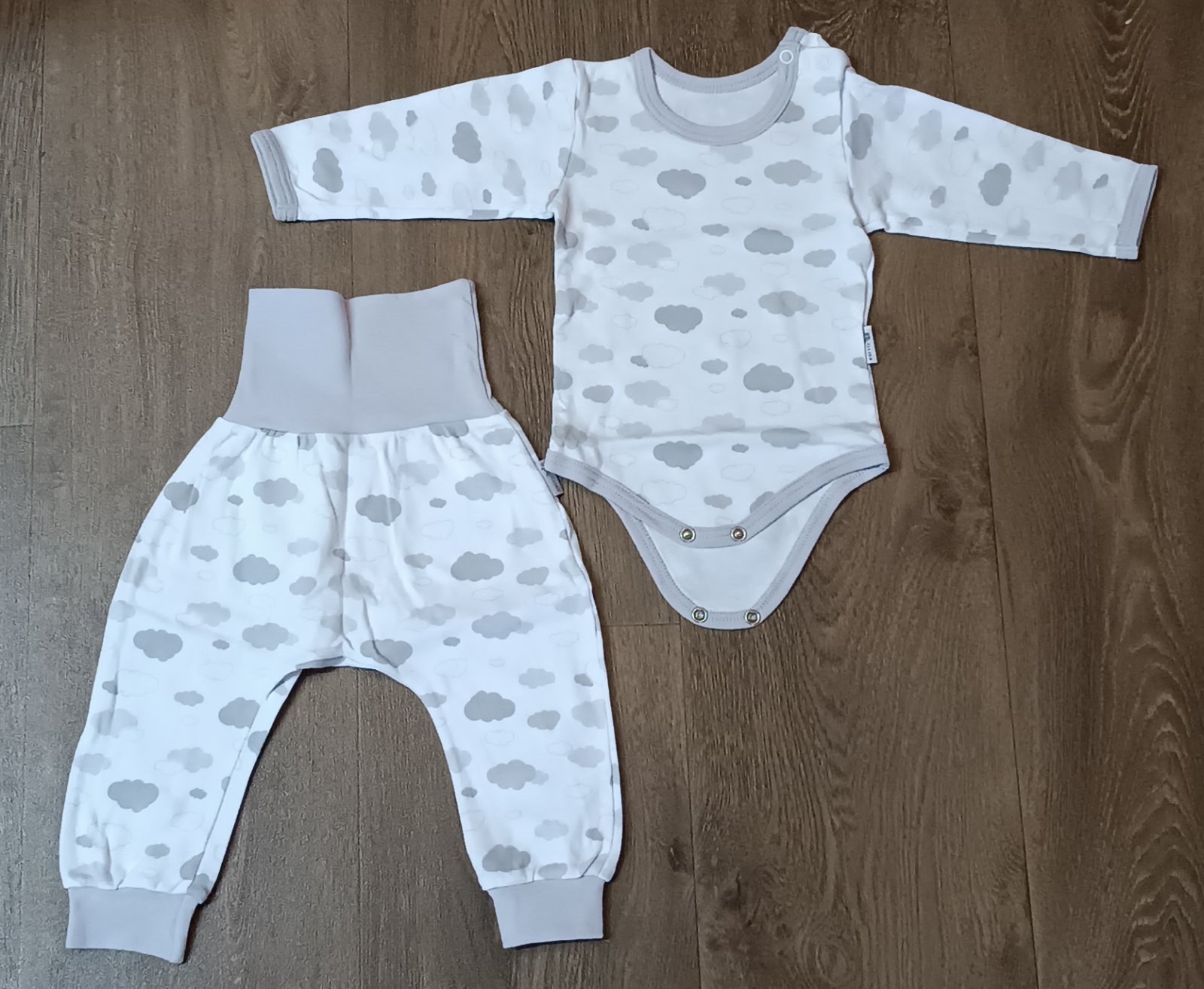Nabízím nový kojenecký set/komplet zn.Esito, vel.68. Komplet se skládá z bodýčka s dlouhým rukávem a pohodlných tepláčků s vyšším pasem s motivem mráčků. Kombinace šedivé a bílé barvy. Díky měkkému a prodyšnému materiálu je ideální pro celodenní nošení.